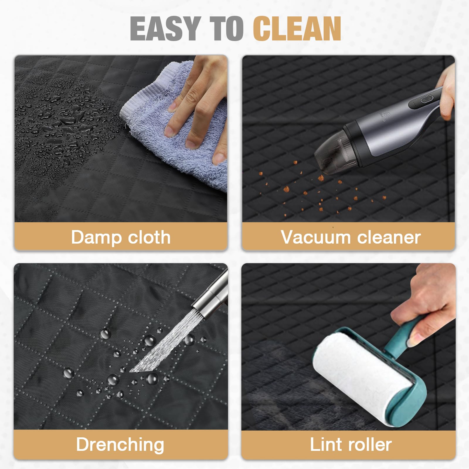 ["No more falls for pets: The dog back seat cover has six sturdy panels strong enough to support your dog and comes with a dog harness to prevent your pet from slipping and falling during travel","More space and less anxiety for pets: The dog back seat extension transforms the entire back seat space into a rest area for dogs. The back seat becomes a car bed to provide more comfort for the dog on the road. The mesh viewing window gives your pets a good view and keeps them relaxed and in a good mood during travel","Protect your car seats and doors: Lekeinchi dog back seat cover is waterproof, easy to clean, tear-resistant and non-slip. It can fully cover your back seats and doors with simple installation buckles. You no longer have to worry about stains, seat or door damage while driving with your beloved pets","Universal Fitment: The length of the buckle straps is adjustable and the mattress is foldable, so this car dog travel bed can fit all types of cars such as trucks, SUVs, sedans, and family cars, etc.","Easy Installation: Simply open the car travel bed and spread it out on the back seats. Attach the straps to the headrest bars and armrests of the car seat; buckle all the buckles. There is an additional dog car seat belt for the dog's safety. Simply attach the buckle to the animal's collar and the other to the seat buckle"]