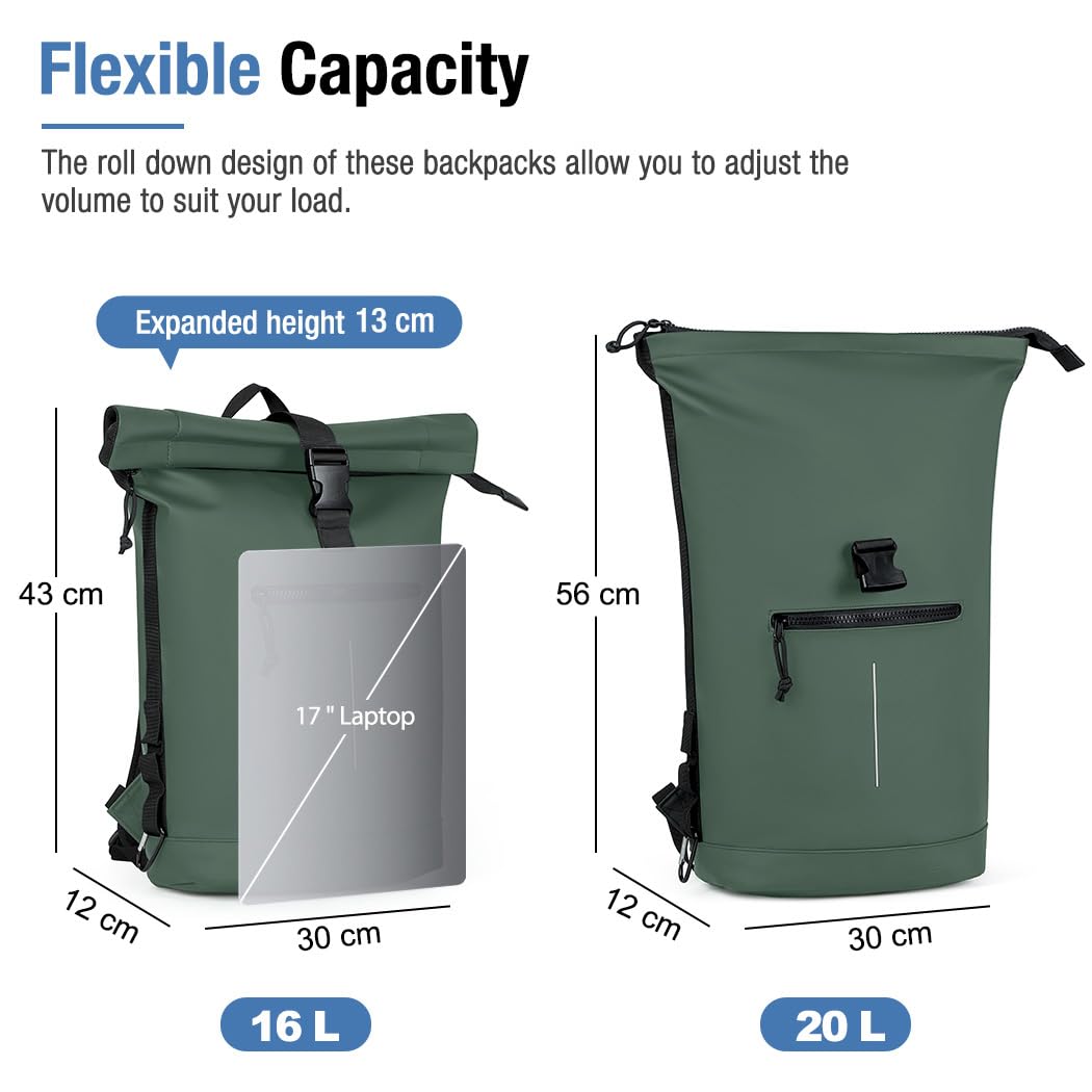 ["FLEXIBLE STORAGE SPACE: Normal size: 12 * 5 * 17 inches, expanded size: 12 * 5 * 22 inches. The rolltop design makes this bag very adaptable (16 liters to 20 liters) and can be adjusted to your space needs. The spacious main compartment with a padded laptop pocket provides space for a 17" laptop, change of clothes, books, water bottle, and more","PRACTICAL: The expandable travel backpack has a zipper opening on the back for quick access to your belongings. Reflective straps provide safety at night and can also be used to hang sunglasses","WATERPROOF AND DURABLE: This laptop backpack is lightweight and durable, made of waterproof and tear-resistant matte polyurethane fabric on the outside and waterproof lining on the inside, suitable for long-term outdoor activities. All stress points are reinforced for durability","COMFORTABLE TO CARRY: The back and wide shoulder straps of this stylish travel bag are made of breathable mesh fabric and well padded to ensure maximum comfort on the back and less burden on the shoulders. Even when carrying heavy loads, this travel backpack is easy to carry","VERSATILE USE: This rolltop backpack is both stylish and practical, perfect for work, cycling, camping, traveling, weekend getaways, or studying. It is a perfect gift for ladies and gentlemen"]