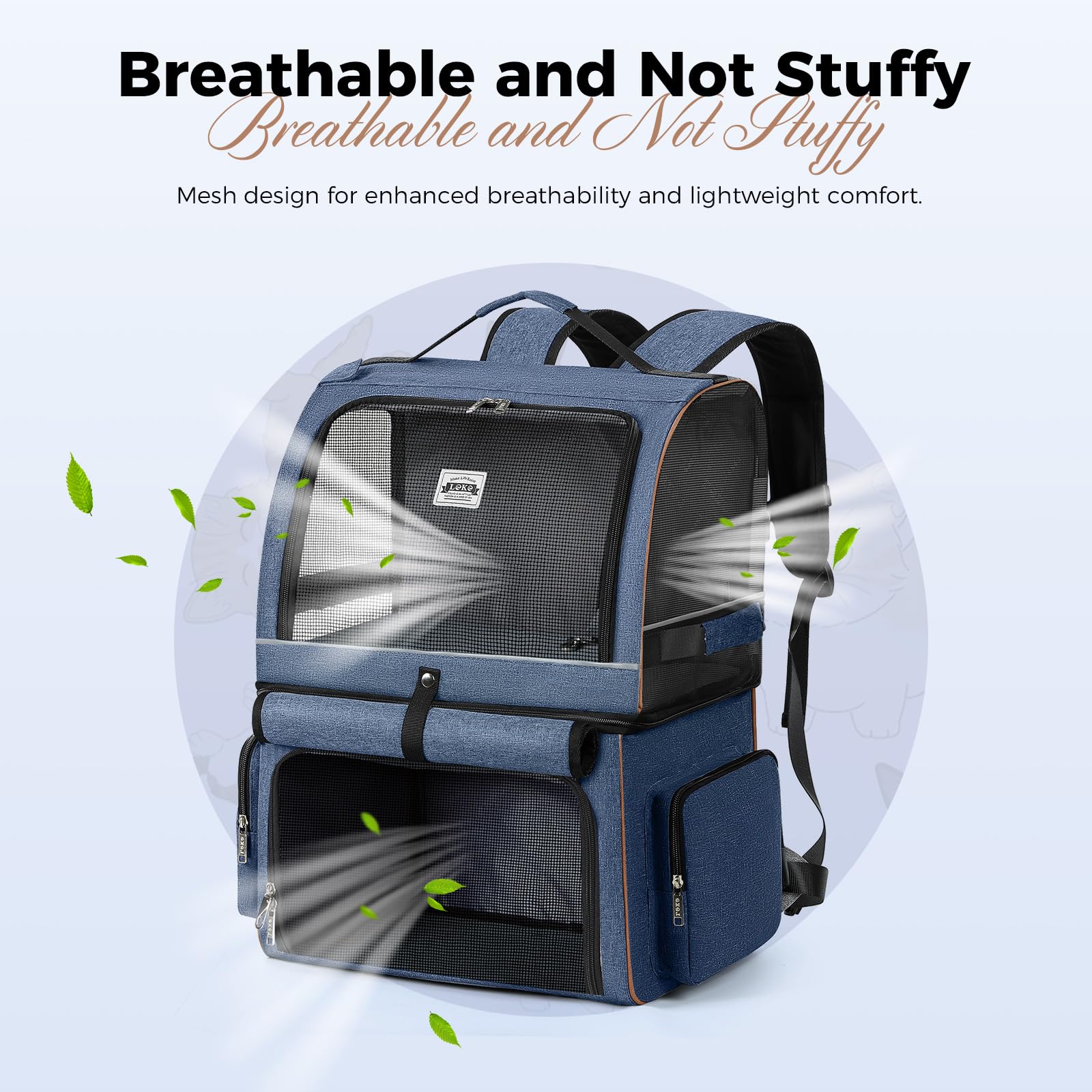 ["Double-layered design cat backpack】 15.7x12.6x19.7 inches. This two-tier backpack is designed for 2 small/medium cats (up to 11 lbs each) or one larger pet (up to 24 lbs) with 2 separate compartments. It makes it much easier to take multiple small pets on outdoor activities.","【Strong construction】The double-layered cat dog backpack is equipped with sturdy support rods, steel frames, and 2 solid mats to ensure excellent stability and durability. It also includes 2 safety leashes for added security.","【Pet-friendly carrier】The dog backpack features mesh windows all around for excellent airflow and visibility. The front and middle openings allow easy access for your pet.","【Multifunctional】The cat transport backpack is made of waterproof polyester and scratch-resistant mesh windows for long-lasting use. 2 side pockets for storing pet accessories and a roll-down privacy cover. Perfect for camping, hiking, cycling, vet visits, or walks.","【Ergonomically shaped】Breathable honeycomb sponge on the back and wide, padded shoulder straps provide maximum comfort and support. The chest buckle helps you stay stable on long trips."]