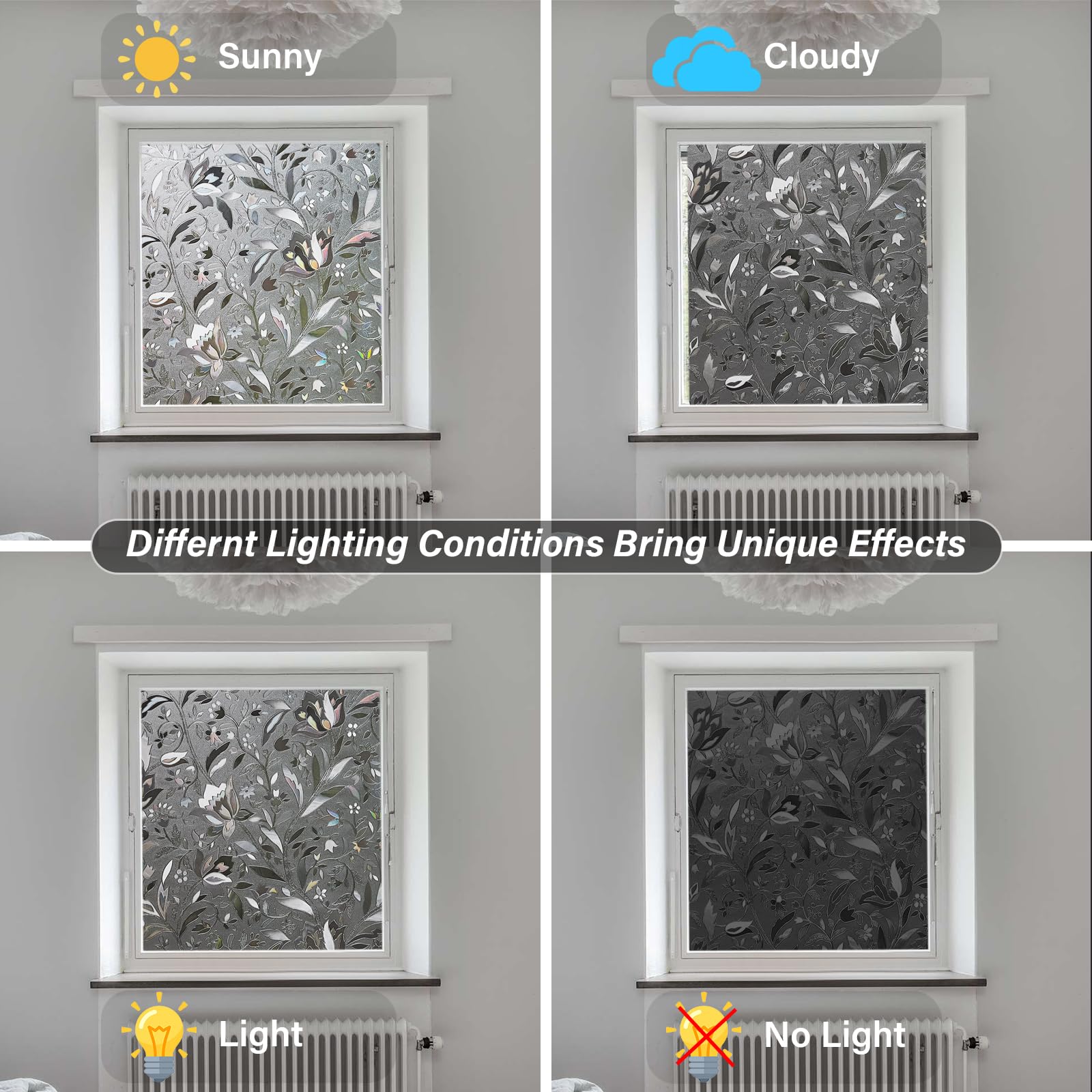 "Rainbow Effect: The film creates a stunning rainbow effect when light passes through it. Experience a range of changing colors with different light sources. This film can be applied to any smooth glass surface.