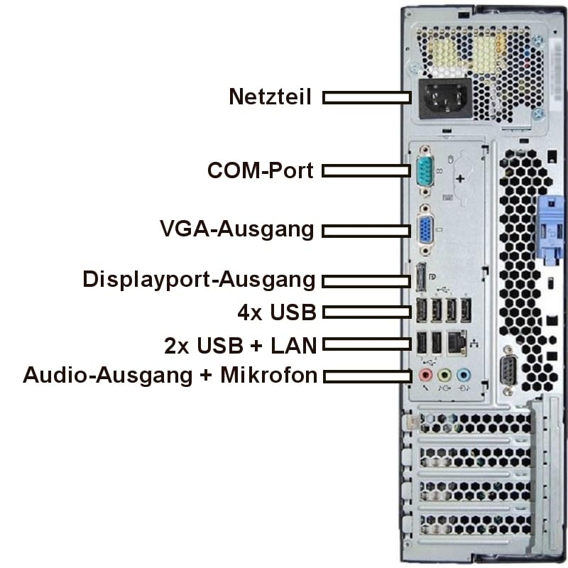 "Lenovo E72 SFF Mini PC, only 14" x 9.8" x 3"! Super compact and convenient. Ports: Displayport, HDMI (included adapter), VGA, 8x USB 2.0, 1 x LAN, 1x WLAN. The device is equipped with a fast Intel Core i5 2400 Quad-Core processor and fast 16 GB DDR3 brand memory, providing more than enough power for compute-intensive applications, multitasking, and multimedia."