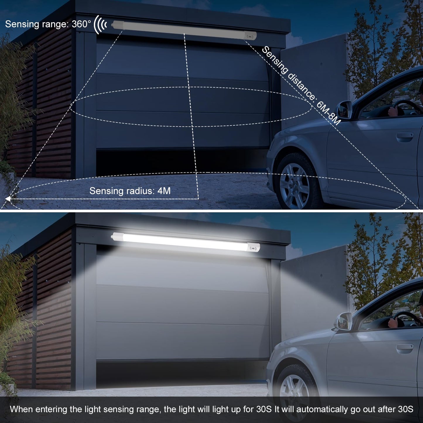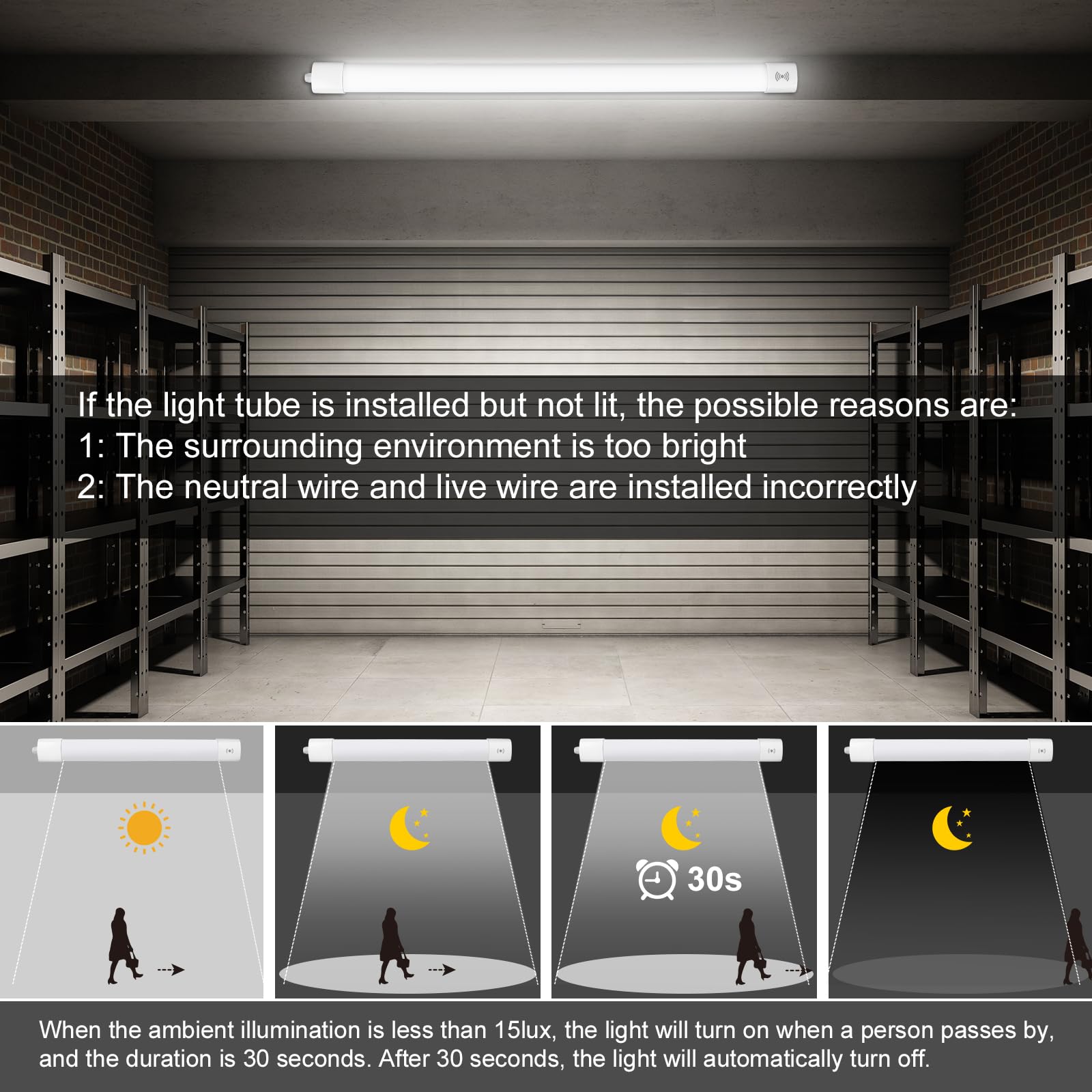 ["【360° Radar Detection】Detection range: 20-33 feet, Light sensitivity: 15 Lux. In an environment with less than 15 Lux, the LED moisture-proof light with motion sensor turns on immediately when motion is detected within a radius of 20 to 33 feet. The sensor turns on the lighting at 100% brightness for 30 seconds. After 30 seconds, the ceiling lamp with motion sensor automatically turns off if no people or animals are detected.",