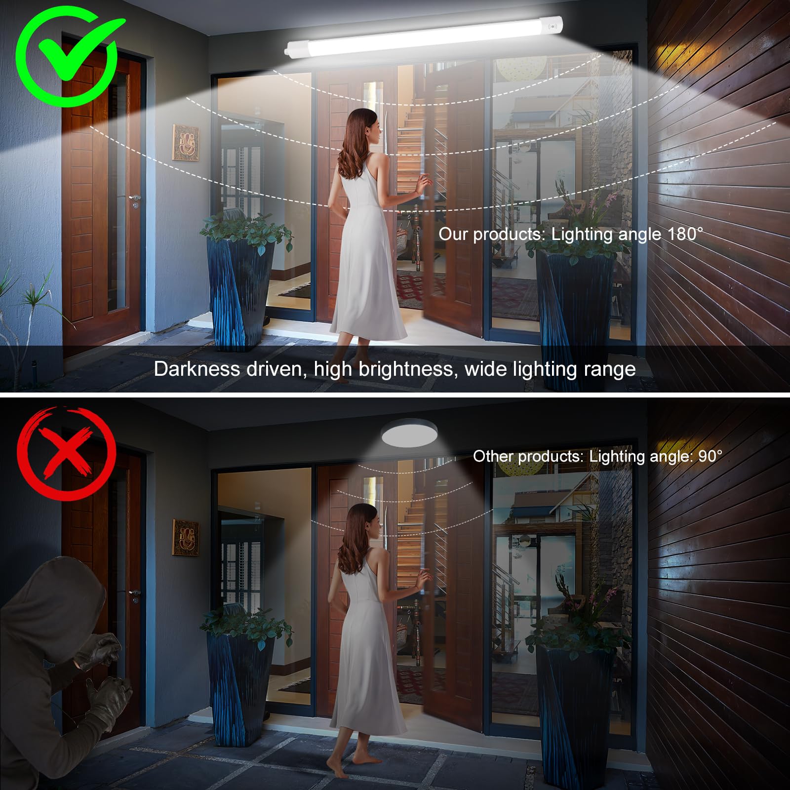 "【Safety and Theft Protection】This LED moisture-proof light with motion sensor has high sensitivity. If someone or an animal is in the detection range, the sensor light turns on immediately. You can install it in the garden to deter potential intruders and expose them in the light."]