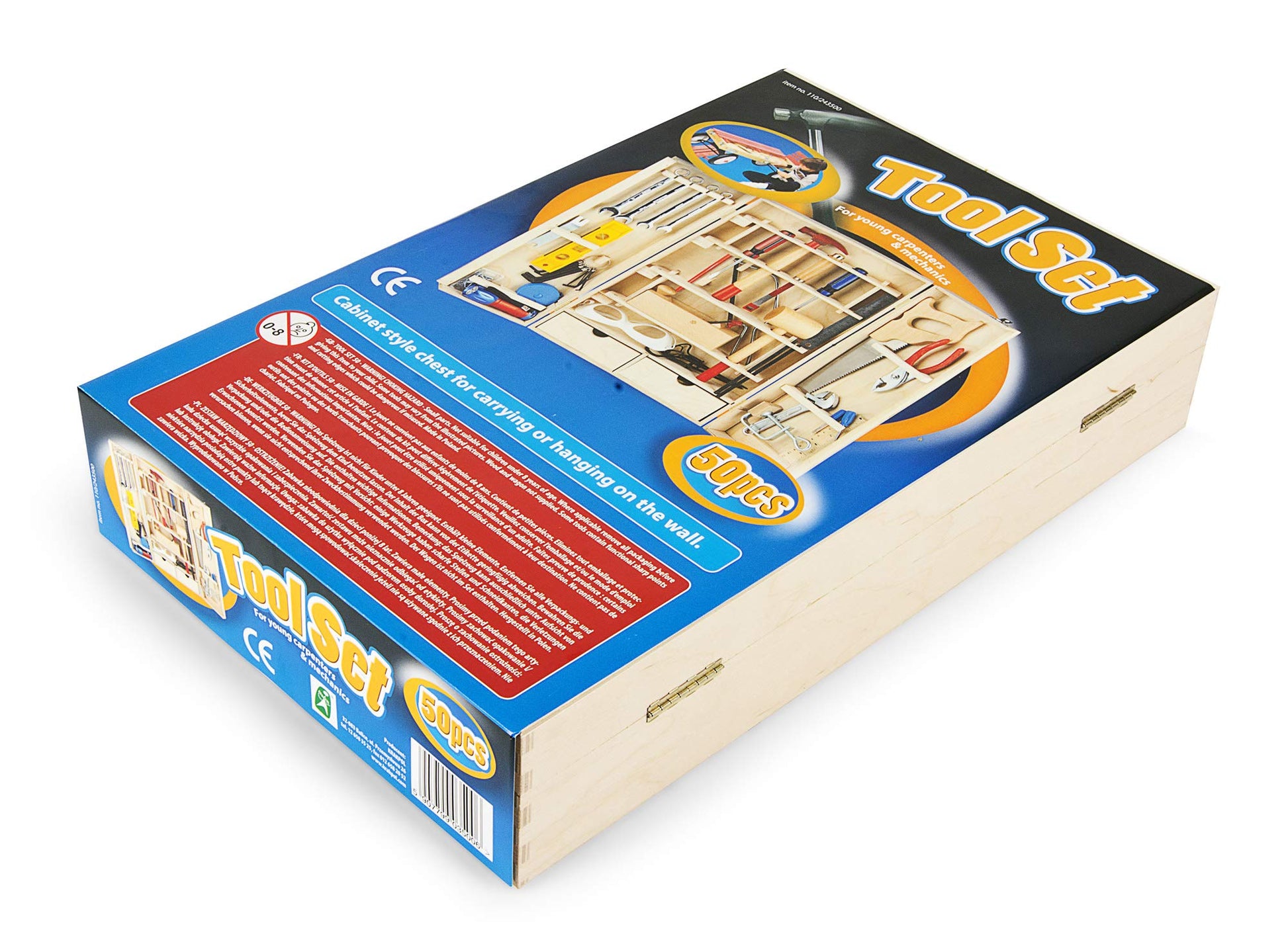 Leomark Deluxe Wooden Toolbox for Kids - 50 piece tool set, compact tool case, wooden cabinet with accessories, wooden box with metal accessories.