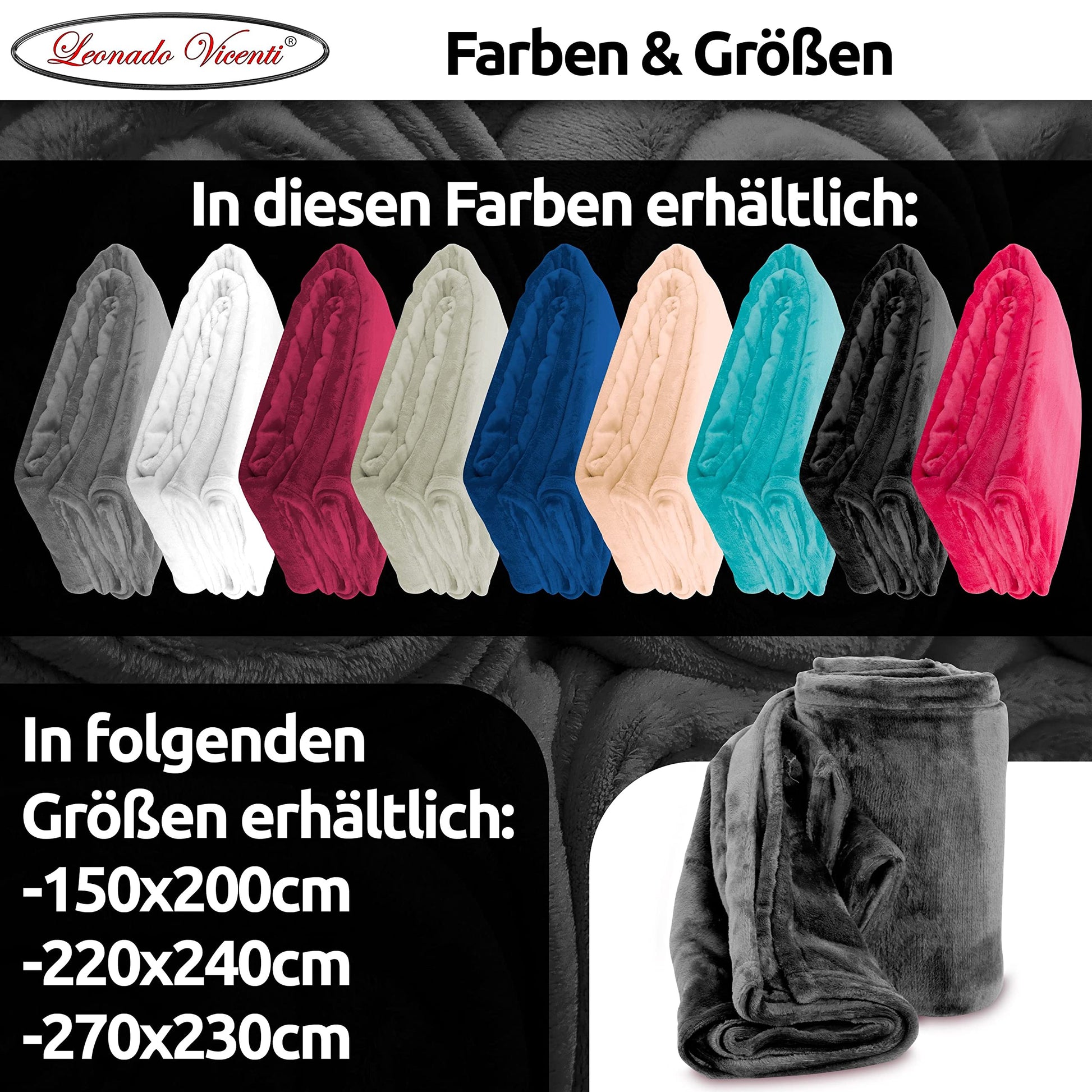 "COZINESS: Our flannel cuddle blanket offers pure coziness. It is a true feel-good guarantee and is perfect for cuddling, for a shared TV evening, as a sofa blanket, as a living room blanket and whenever a fluffy blanket is needed.""3 SIZES AND 9 COLORS: The soft fleece blanket is available in 3 sizes: 60x80 inches, 86x94 inches, 106x90 inches. Our Leonado Vicenti cuddle blanket comes in 9 colors: Black, White, Gray, Beige, Anthracite, Bordeaux, Dark Blue, Petrol and Pink.""EASY CARE AND DURABLE: To ensure that you enjoy your new favorite blanket for a long time, it offers resistance to fading and stains. It is also machine washable at 40 degrees. The wool blanket is also suitable for the dryer.""OEKO-TEX 100 CERTIFIED: Our Leonado Vicenti cuddle blanket has been tested according to the test criteria of OEKO-TEX for a range of 100 harmful substances, optical brighteners and similar. It has been certified as harmless to health."