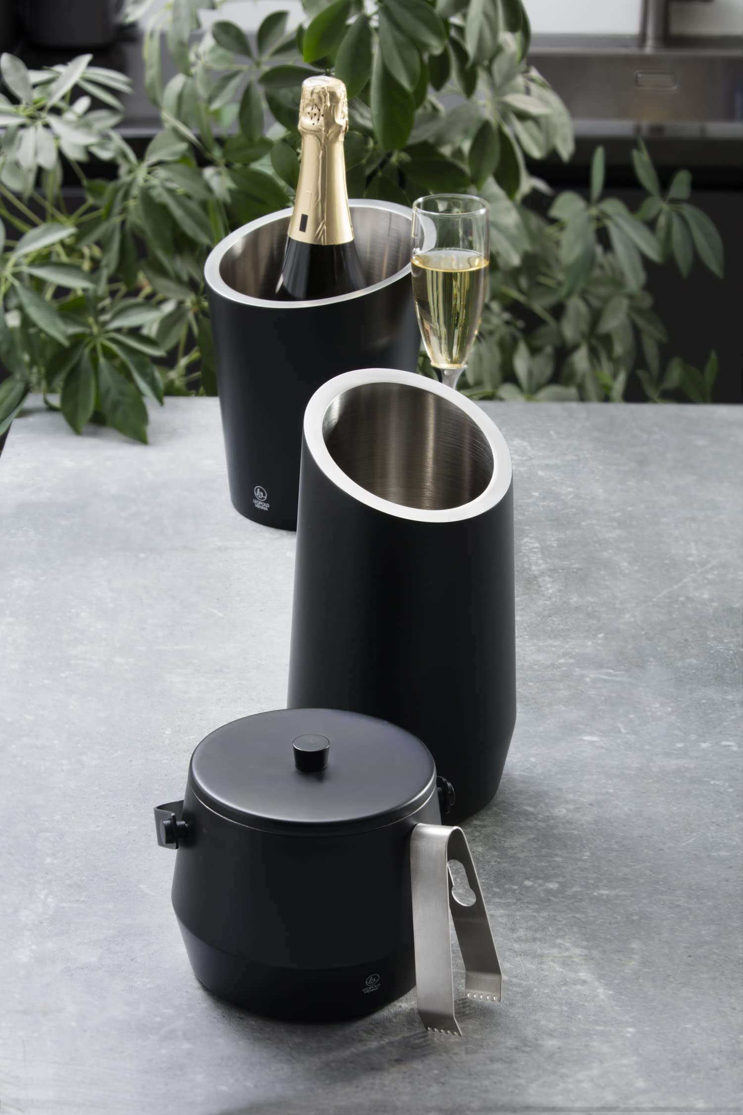 ["The double-walled ice bucket with lid in a modern design is made of black matte stainless steel",