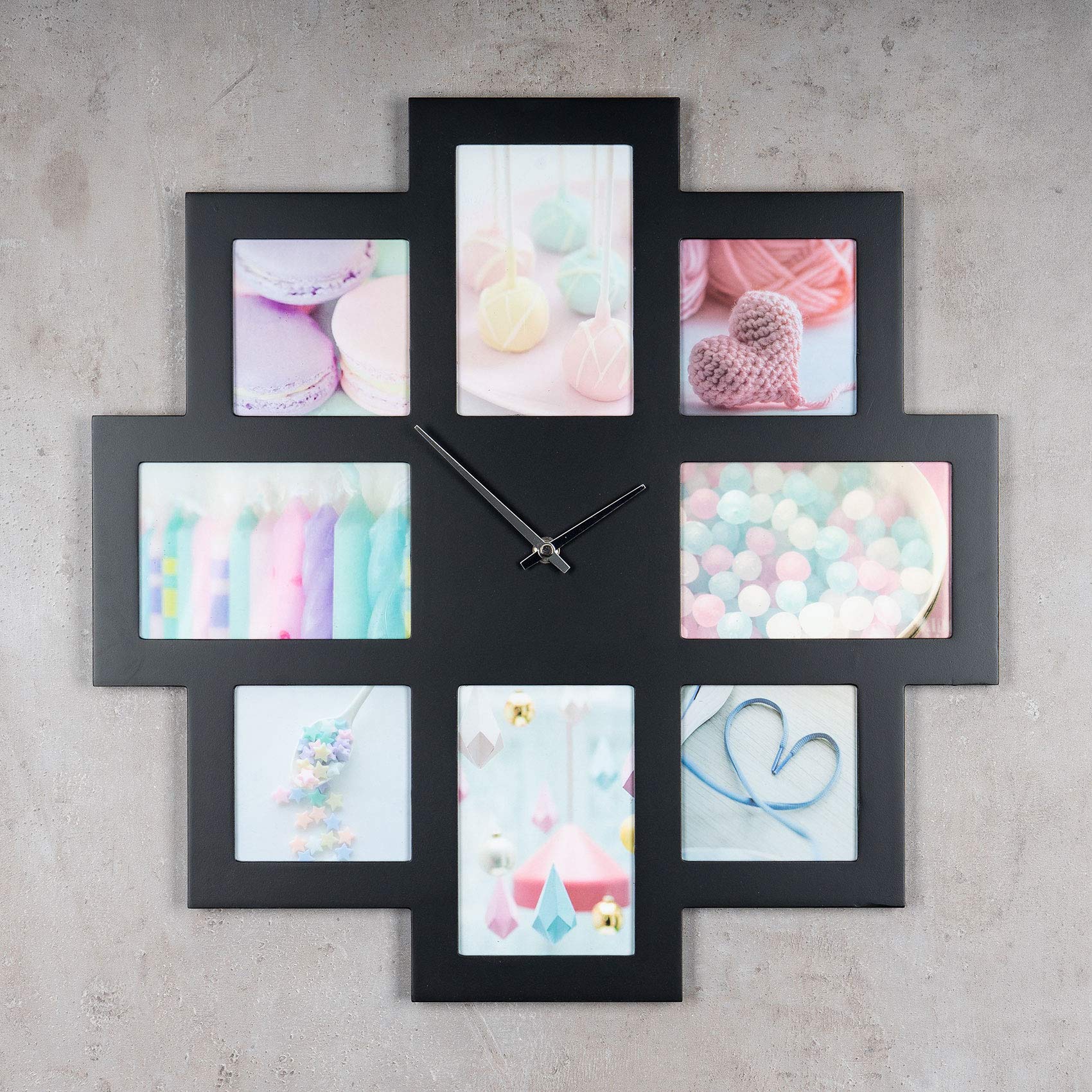 ["Photo clock size W x H x D: 19 x 19 x 0.8 inches (including clockwork)", "Picture frame made of mixed wood, black lacquered, with acrylic panes", "Wall decoration without numerical display, with elegant silver hands", "The photo frame holds 8 photos in the photo format 4 times 4x6 inches and 4 times 4x4 inches", "Battery-operated clock requires 1x AA battery (not included)"]