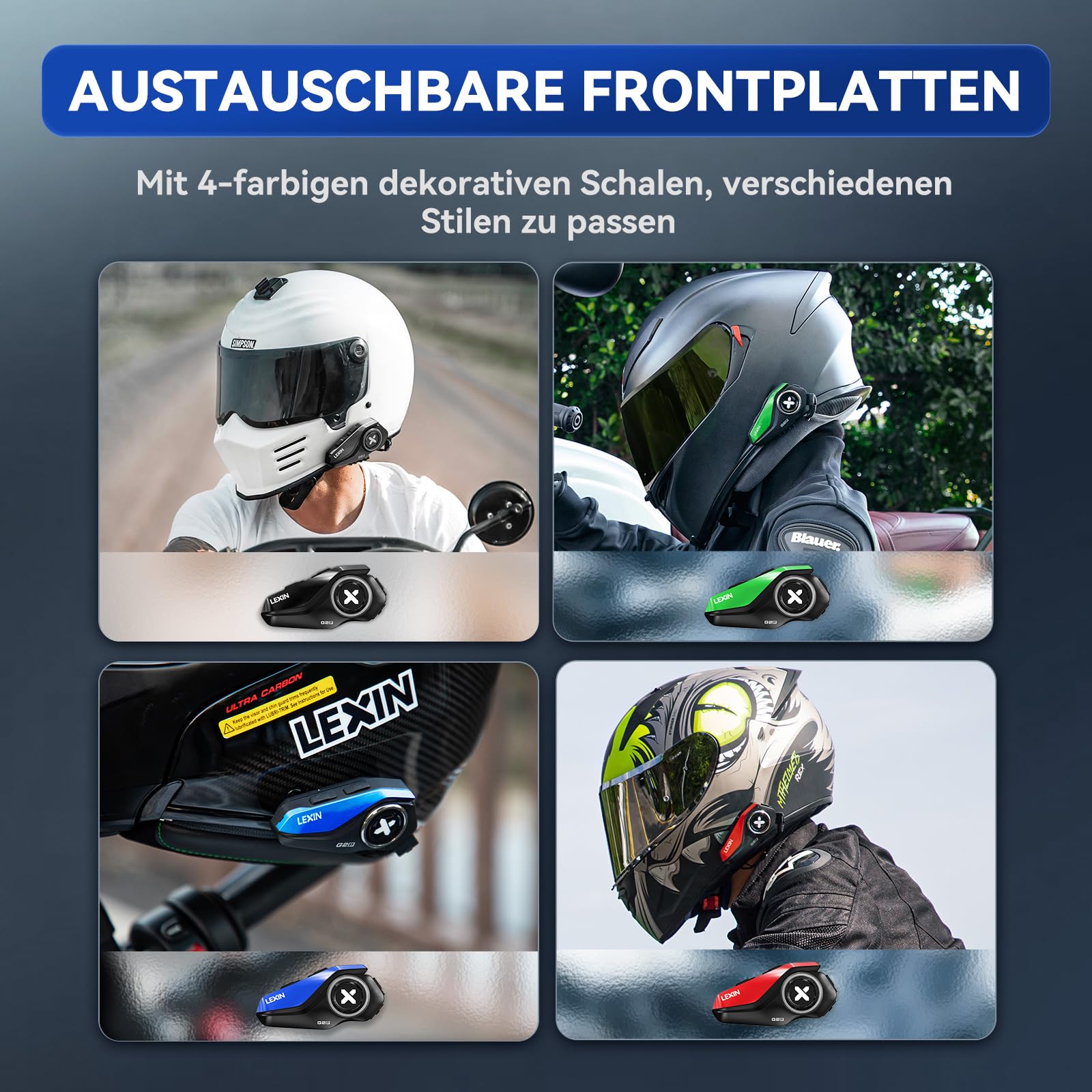 4 interchangeable shells: With the 4 included shells, the LEXIN G2P headset can be used as a decorative item for your helmet. There are 4 colors, green/blue/black/pink. The best choice for BMW, Ducati, Kawasaki motorcycles.
