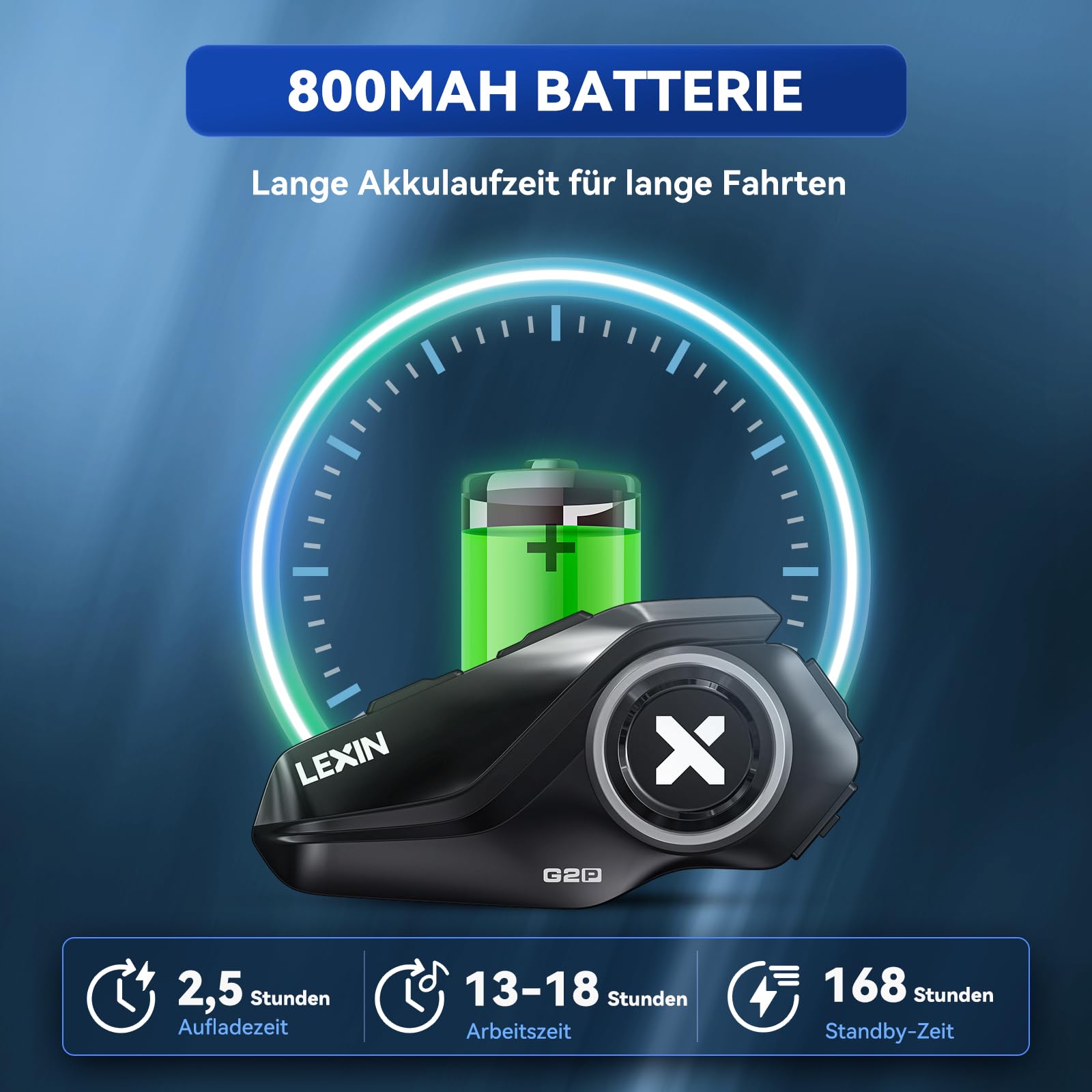 800 mAh large battery: The LEXIN G2P headset is equipped with a larger 800 mAh battery. With the included USB-C charging cable and a DC 5V 2A charger, the device can be fully charged within 2.5 hours. When fully charged, the LEXIN G2P headset supports 13 hours of talk time, 18 hours of music listening, or up to over a week of battery life in standby mode.