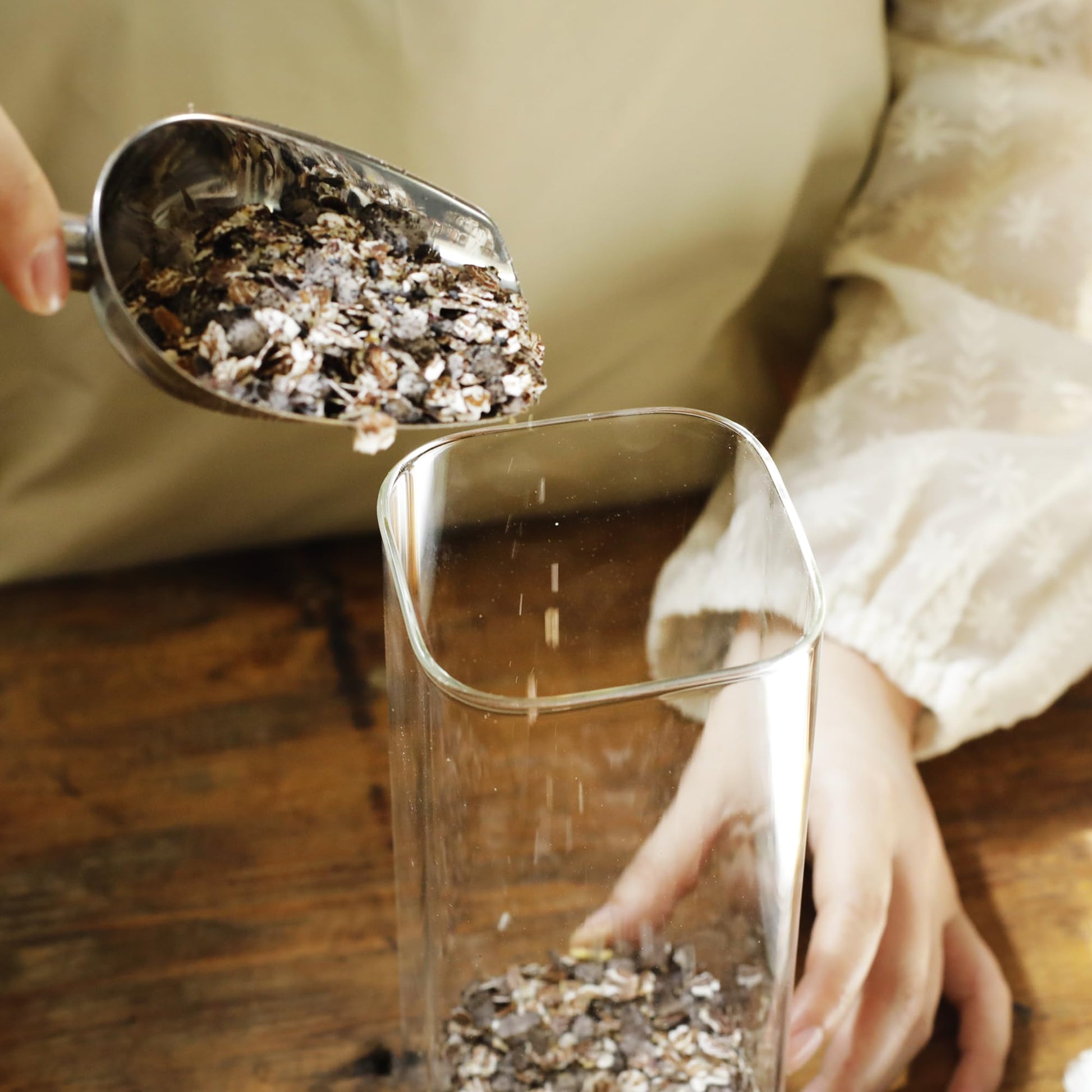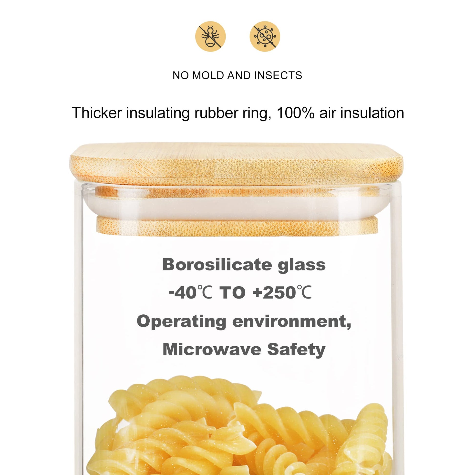 ["16 CANS = 12.8L CAPACITY - This set can cover the storage needs of a whole family at once, significantly reducing storage costs. The containers are made of heat-resistant borosilicate glass and are dishwasher safe. You can quickly and sustainably organize your kitchen cabinets and drawers.","WHETHER PASTA, FLOUR OR MUESLI: with the various sizes and shapes of our storage containers, you will find the perfect container for each product. Thanks to the tightly closing lids, your supplies stay fresh and full of flavors and taste.","BEAUTIFUL SQUARE BAMBOO LID - The square storage jars impress with their bamboo lid. With the appealing combination of bamboo and glass, you can upgrade your kitchen decor in no time and with the help of drawers, you get an even better overview.","AIR-TIGHTLY SEALED - A rubber ring prevents the entry of oxygen and moisture. This keeps the food inside the storage containers as fresh, crispy, delicious, and tasty as possible for a long time.","PLASTIC-FREE PANTRY STORAGE - With our glass containers, food storage becomes an environmentally friendly matter and effectively reduces food waste. Now you can finally banish plastic food containers from the kitchen!"]