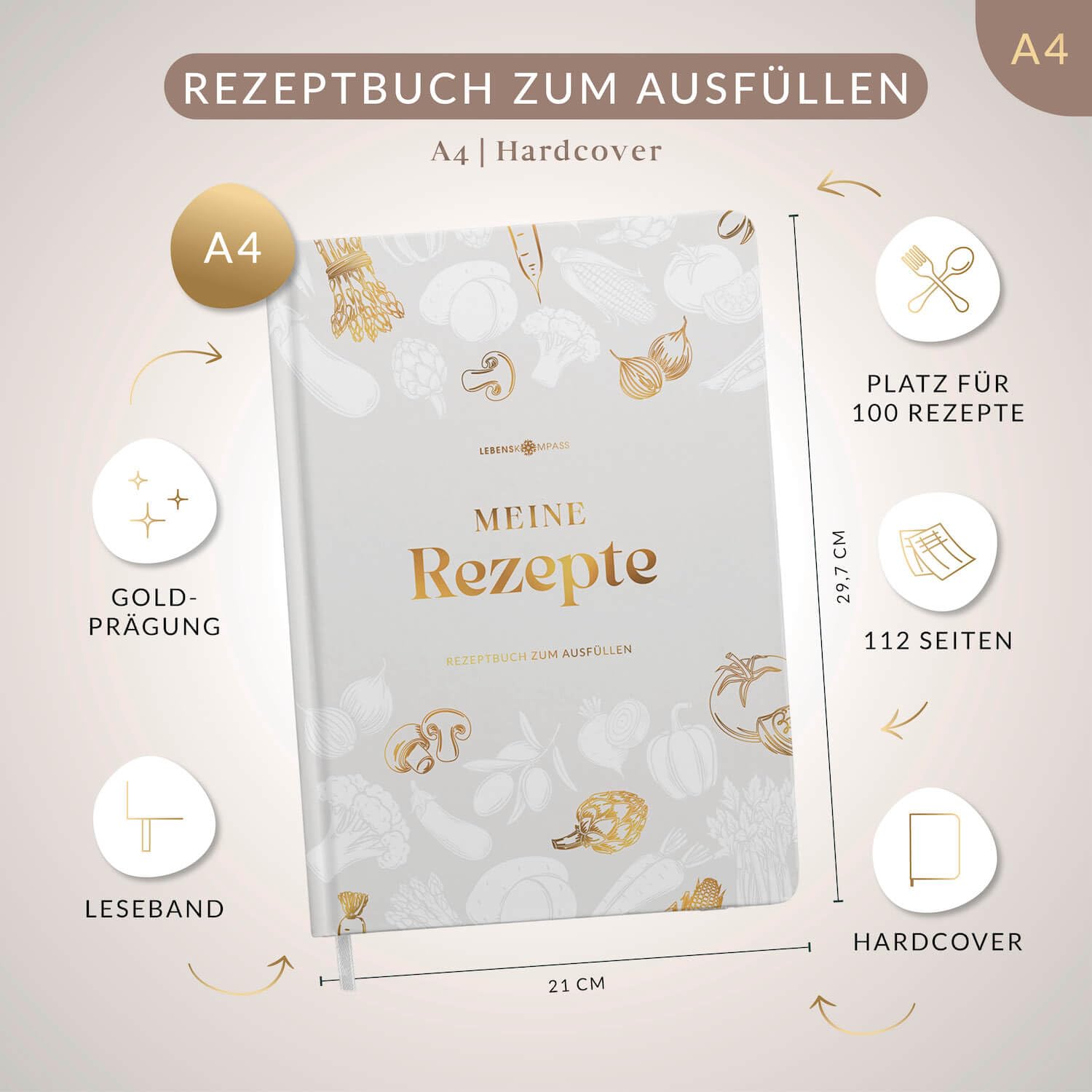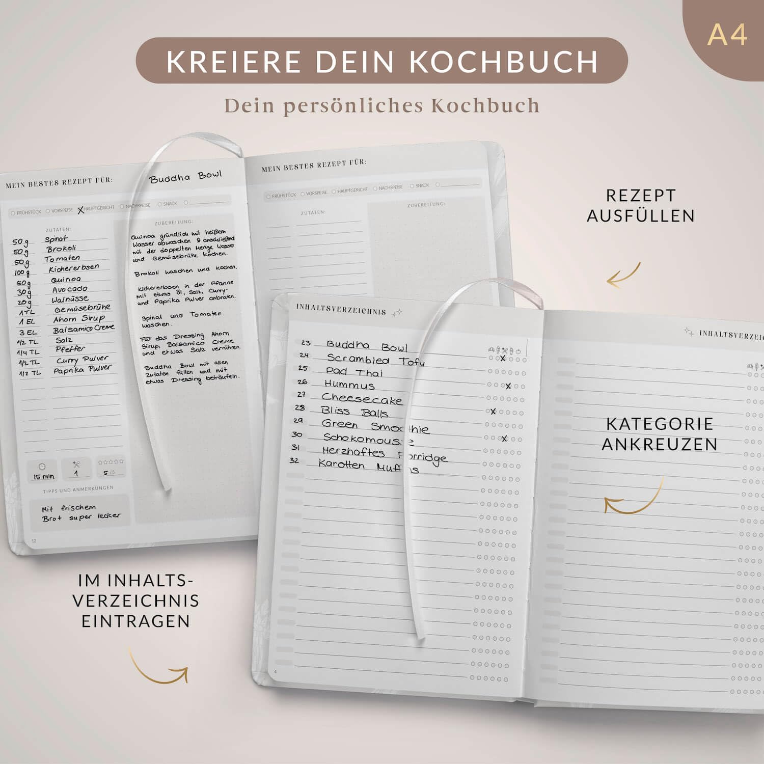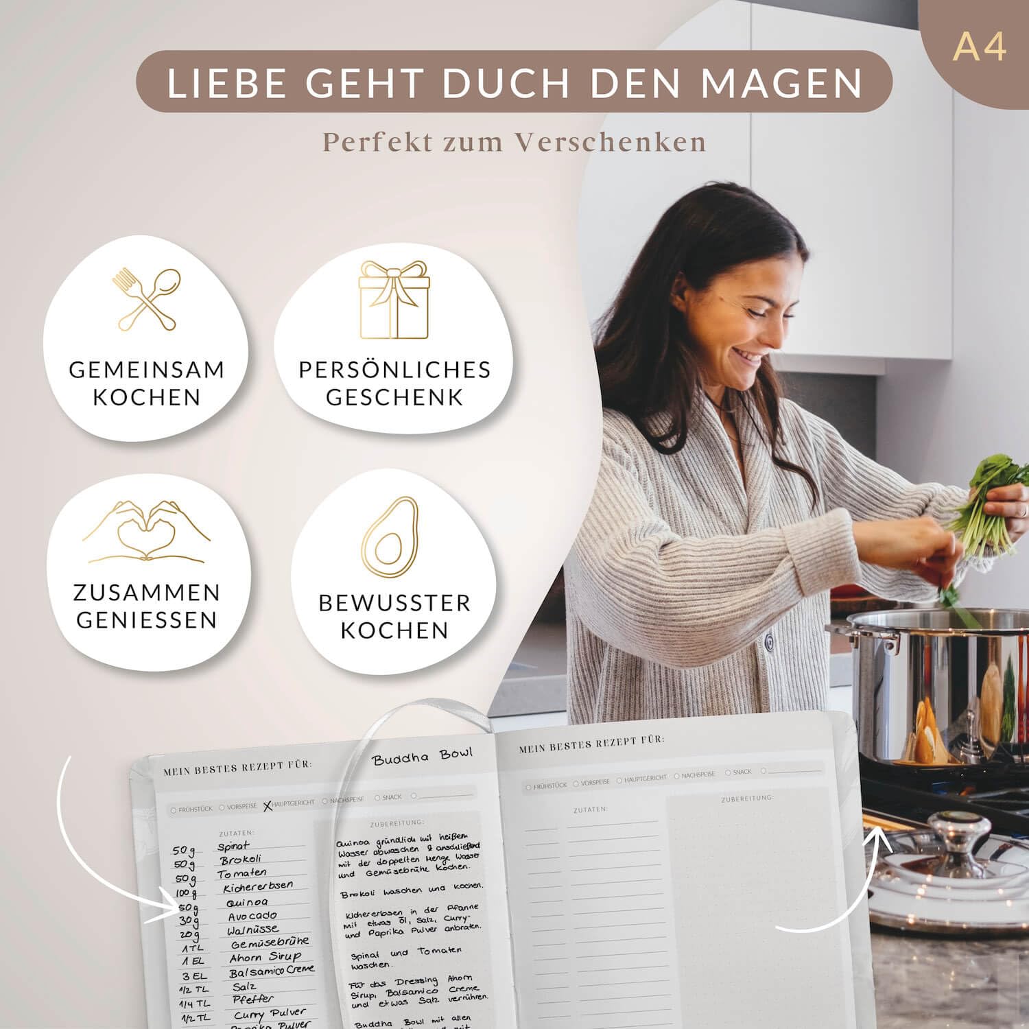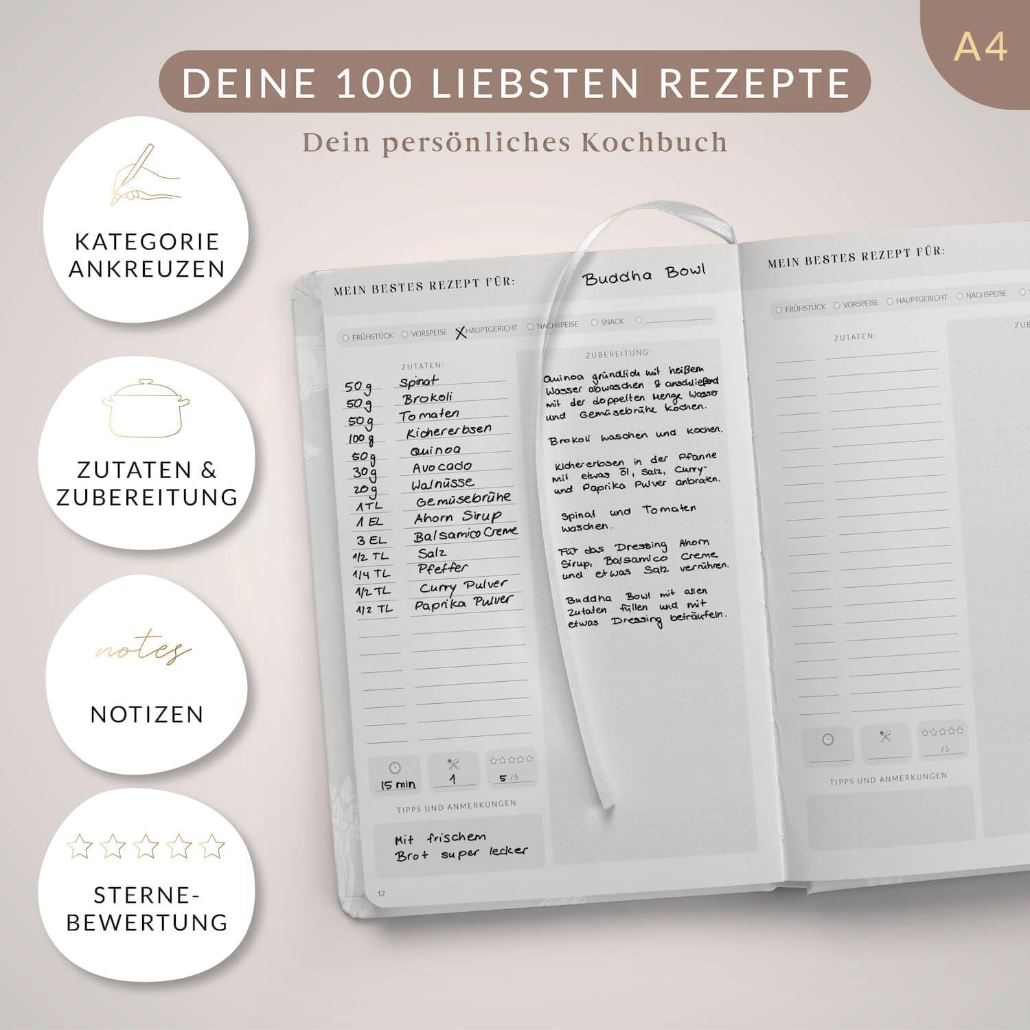 ["COLLECT RECIPES: Keep 100 of your favorite cooking and baking recipes in one place. Whether it's Grandma's secret recipe or your current favorite pasta, jot down the ingredients and preparation so you can always quickly find and cook your best recipes.","SEASONAL CALENDAR: The recipe book comes with a double-sided printed poster. On one side, you'll find a seasonal calendar, while the other side is filled with useful tea knowledge.","ORGANIZED: Thanks to the table of contents, you can always easily and quickly find your recipes. And with the ribbon bookmark, you can mark your favorite dish. Add a category like snack or breakfast to your recipes to always find the right one.","PERSONALIZED GIFT: Give the filled recipe book to friends or family for Christmas, birthdays, or just because. The perfect customizable gift idea.","MINDFUL START-UP: As a start-up, it's important to us to bring mindfulness and self-love to adults. Take a look at our other products too."]