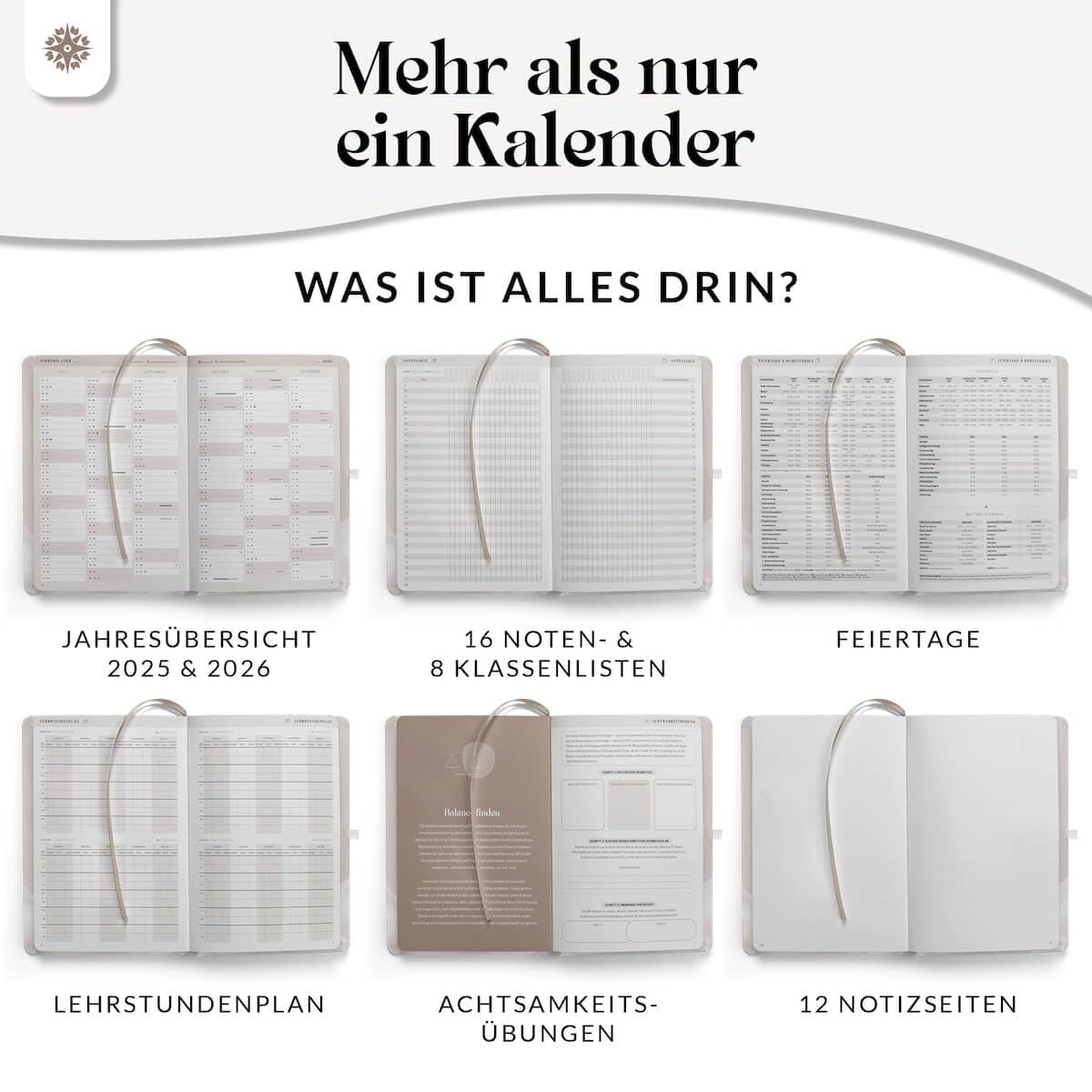 ["TEACHER PLANNER 2025/2026: Accompanies you from August 2025 to July 2026 - with weekly & monthly overviews for your structured school day", "EVERYTHING IN SIGHT: 8 class lists, 16 grade lists, schedules, holidays & more - for a relaxed lesson preparation", "MINDFULNESS IMPULSES FOR EVERYDAY LIFE: Small exercises & reflection pages give you more ease & focus in the often hectic school operation", "PREMIUM EQUIPMENT FOR TEACHERS: DIN A5+ hardcover with gold embossing, pen loop, elastic band, frog pocket & 3 bookmarks", "FOR YOUR HEARTFELT PROFESSION: Ideal for teachers who want to plan consciously - combines teacher supplies with design & depth"]