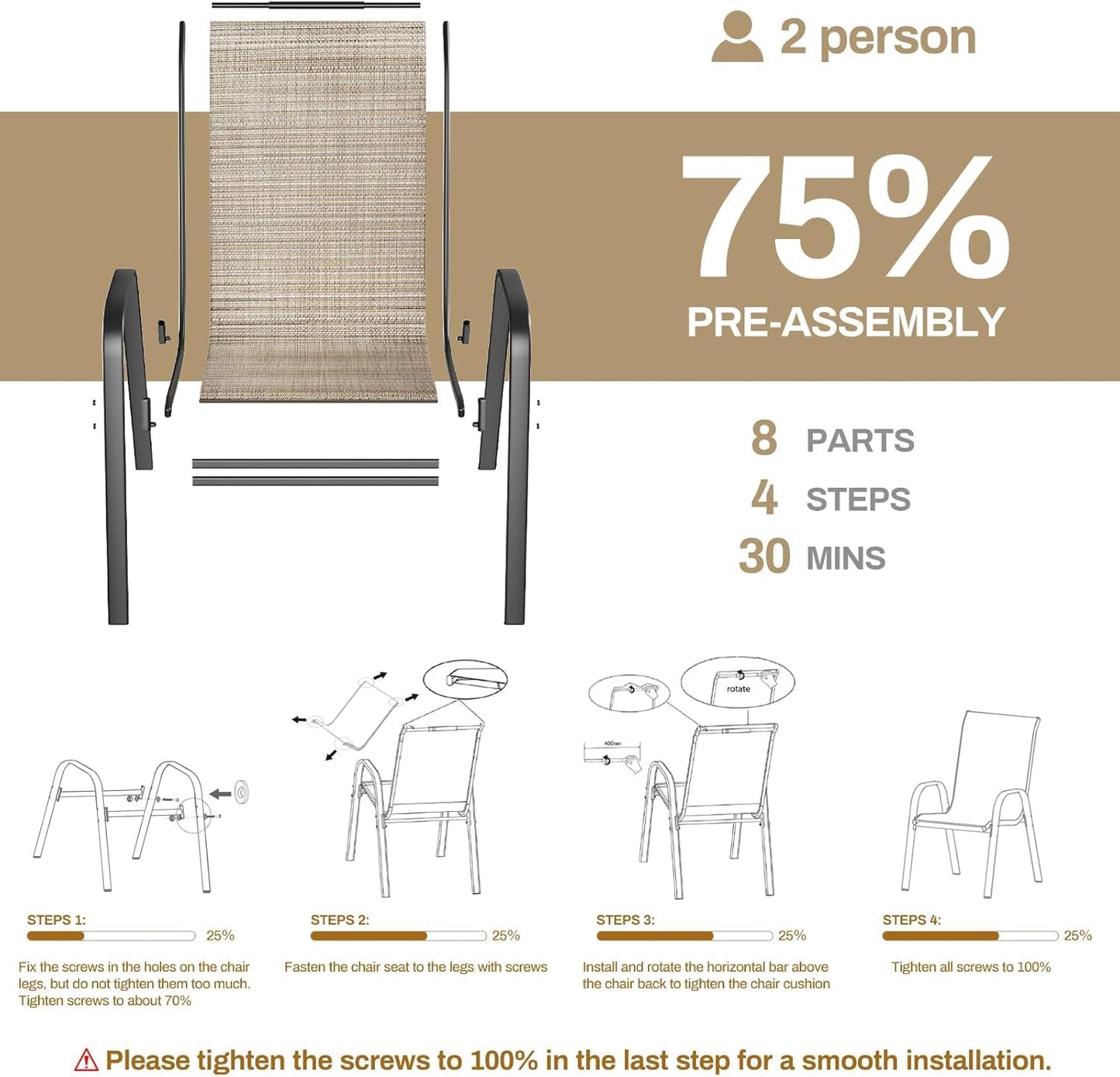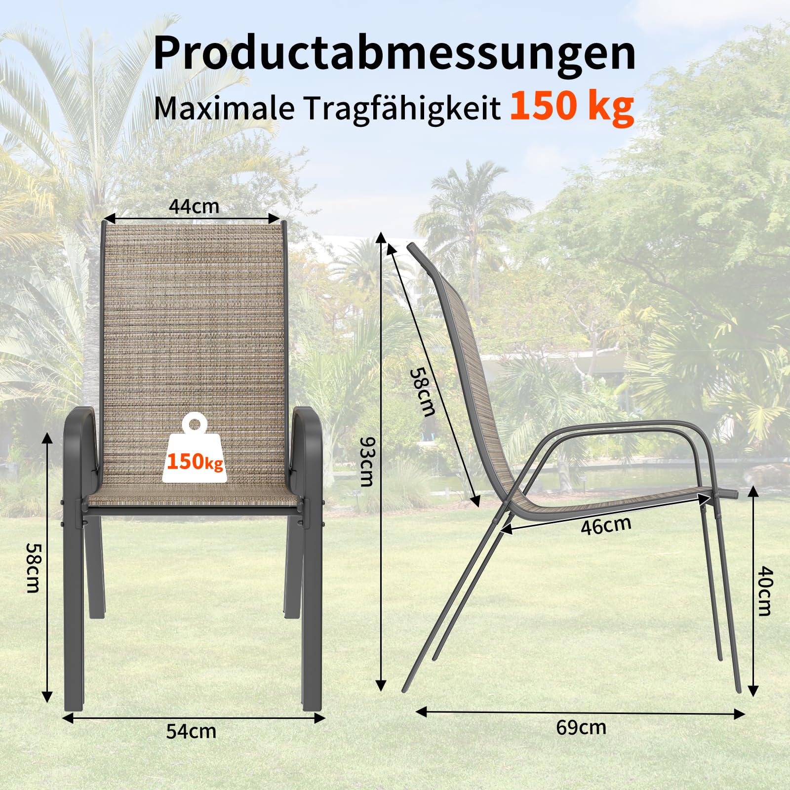 ["【Installation Instructions】 Note: At least two people are required for installation! Since the chair is delivered partially disassembled, you will need to manually install it upon receipt. The package includes detailed assembly instructions and parts, and can also be installed according to the video on the website so you can complete the assembly in a short amount of time. For any questions, feel free to contact customer service.","【Care Instructions】 To extend the lifespan of your garden chair, do not use corrosive cleaning agents; Protect furniture by covering chairs with protective covers when not in use. To remove stubborn dirt, you can use a pressure washer. Storage conditions: Store in a clean, dry place to avoid mold and rust.","【Comfortable High Back Wide Seat】 The garden chair with high backrest fits well to your back and supports your lumbar area. The 58 cm high backrest and 44 cm wide seat ensure an ergonomic sitting position. The armrests on both sides allow for complete relaxation and offer a good comfort experience","【Stackable Space Saving】 The garden chairs can be easily stacked, so that 4 chairs can be stacked and stored compactly when not in use, which is very convenient when going out.","【Textilene Fabric Comfortable Breathable Highly Elastic】 Seat and backrest are made of Texlin fabric, a high-quality fabric with excellent breathability and elasticity. Carefully sewn fabric keeps the surface cool and provides the highest comfort and best seating experience.","【Sturdy Durable】 The chair is carefully made from a high-quality metal steel frame, which is stronger, more stable, and more durable than other materials","【Wide Range of Uses】 The LIFERUN garden chair can be used in gardens, courtyards, restaurants, balconies, camping, indoors or outdoors","【Safety Non-slip】 The bottom of the garden chair features an anti-slip device, making it more stable when sitting, reducing noise, and protecting the floor. It can be used both outdoors and indoors.","【Dimensions】Length x Width x Height: 54 x 69 x 93 cm. Load capacity: 150 kg | Weight: 5.1 kg per chair. (Note: The total package includes four chairs with a total weight of 20 kg)"]