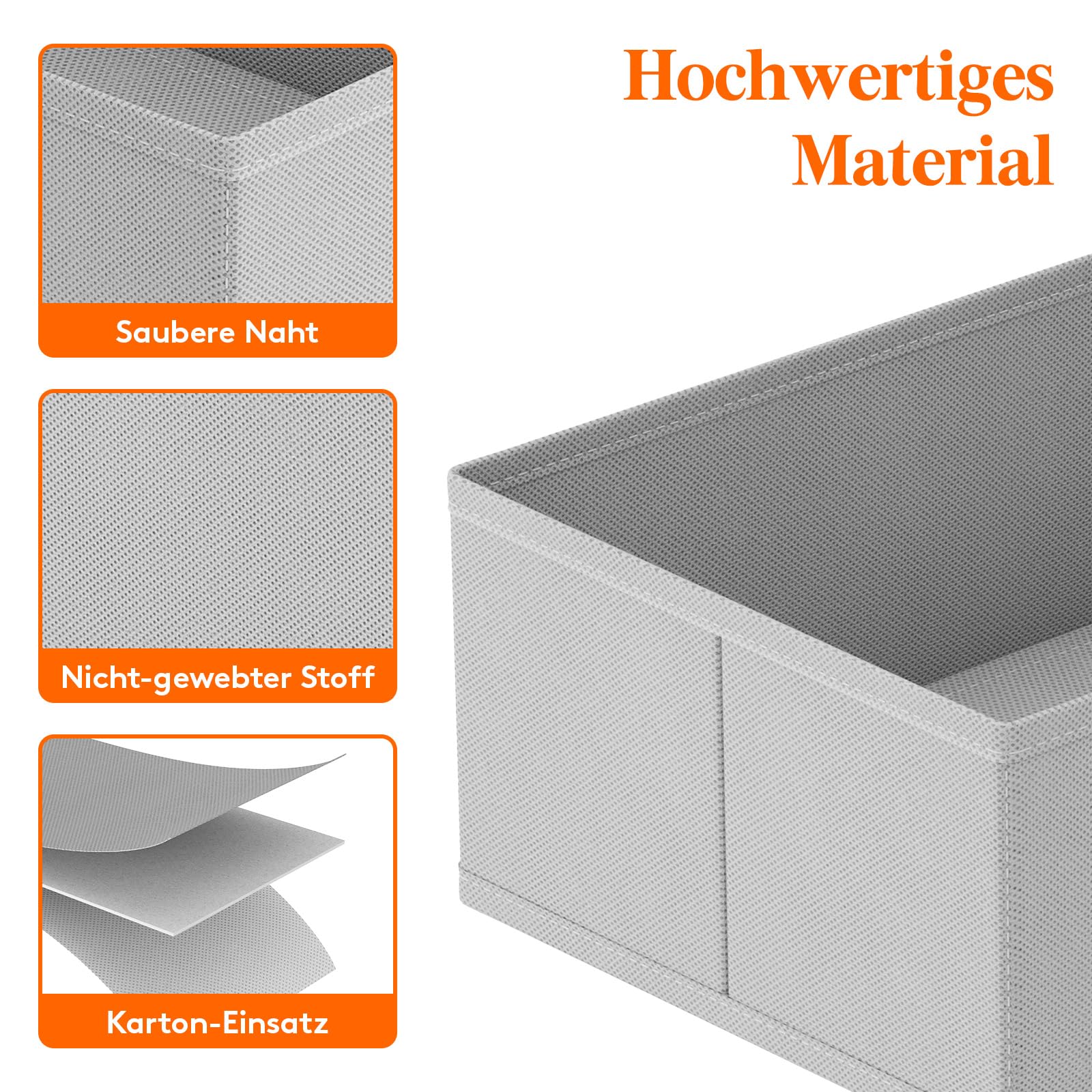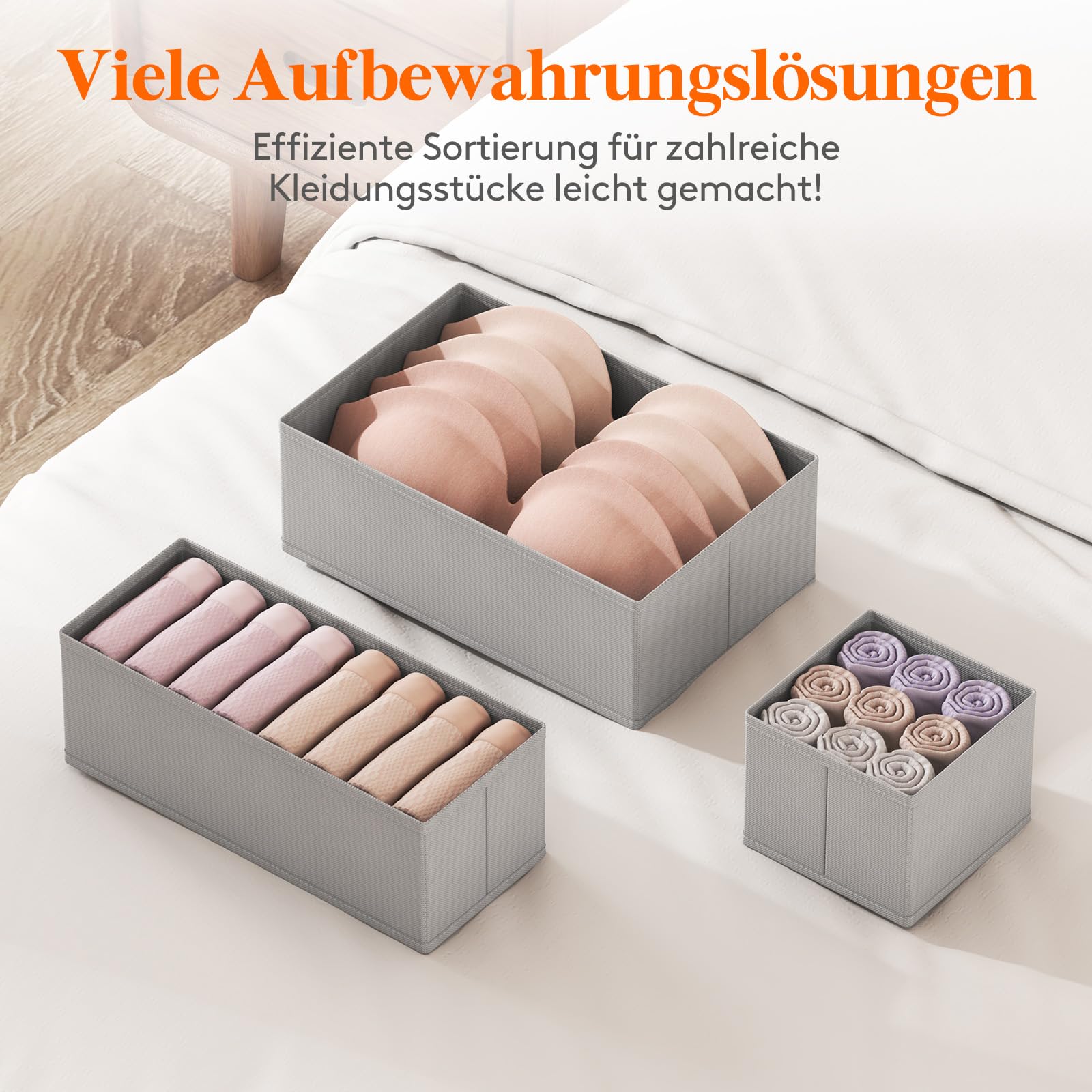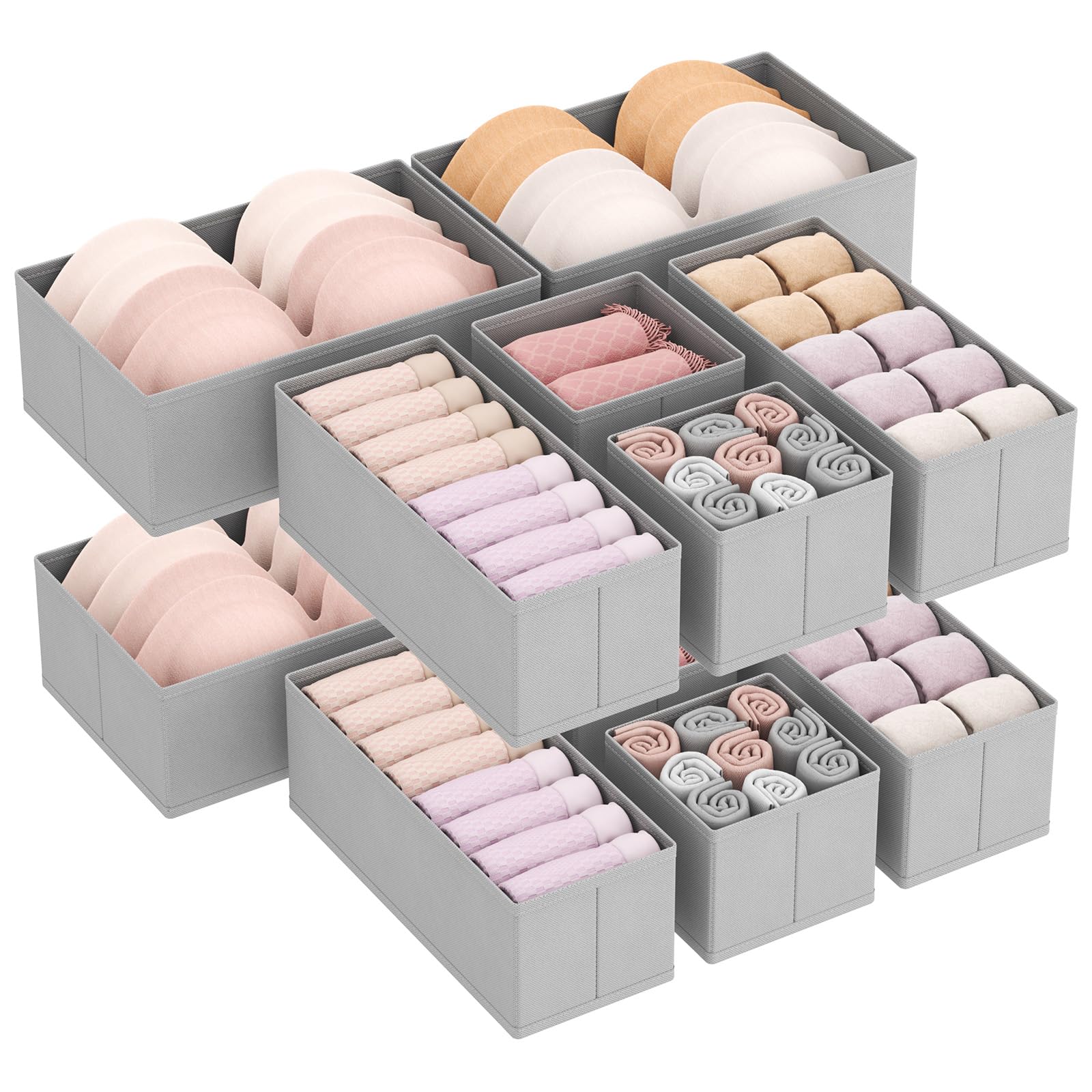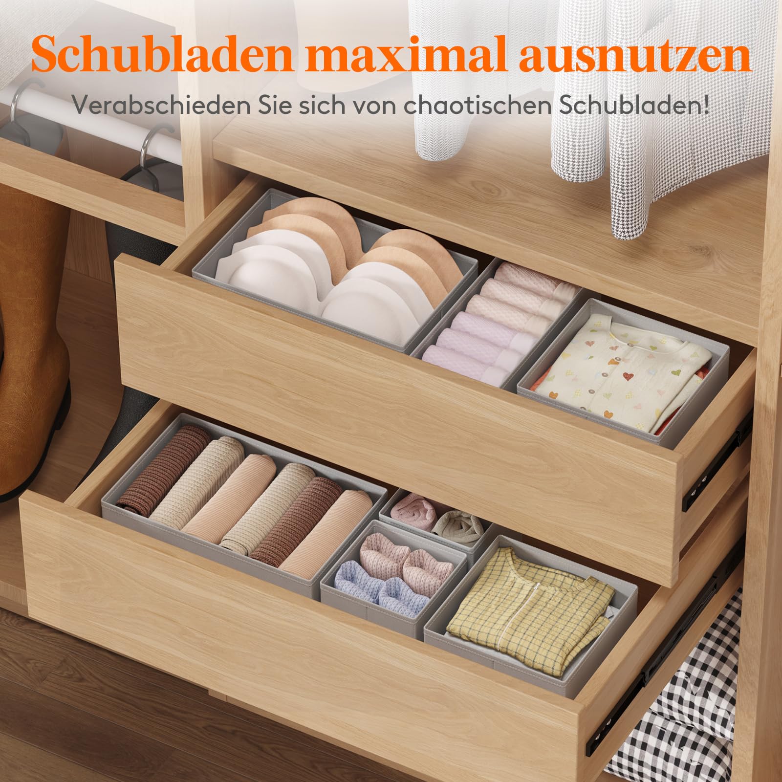 ["Different Sizes: A set of drawer organizers includes 12 boxes in various sizes, including 12/4 pieces measuring 5.3x5.3x4.3 inches, 4 pieces measuring 12x5x4.3 inches, and 4 pieces measuring 12x7.7x4.3 inches. These boxes can be freely combined and arranged in various drawers to suit your specific needs.","Multipurpose Storage: This set of closet organizers is perfect for storing all kinds of clothing. With versatile size combinations, socks, underwear, bras, towels, scarves, ties, or baby clothes can be stored, allowing you to maximize space in your drawer.","Versatile Uses: This wardrobe organizer is not only suitable for drawers but also for cabinets, shelves, and more. It can be used to store a variety of items such as clothing, small items, cosmetics, tools, and more in bedrooms, dressing tables, and other rooms.","High-Quality Material: These storage boxes as drawer organizers are made of durable fabric that ensures long-lasting use. This wardrobe storage is dustproof, moisture-resistant, and odor-neutral. The large open design allows for easy access, while the breathable structure reduces odors and keeps clothes fresh.","Collapsible: This underwear organizer is designed for convenient storage. It can be easily disassembled and flat folded when not in use, taking up minimal space. With its lightweight design, the closet organizer is easy to transport. Setting up this drawer organizer is a breeze. Simply insert the base plate, and everything is ready to use in seconds."]