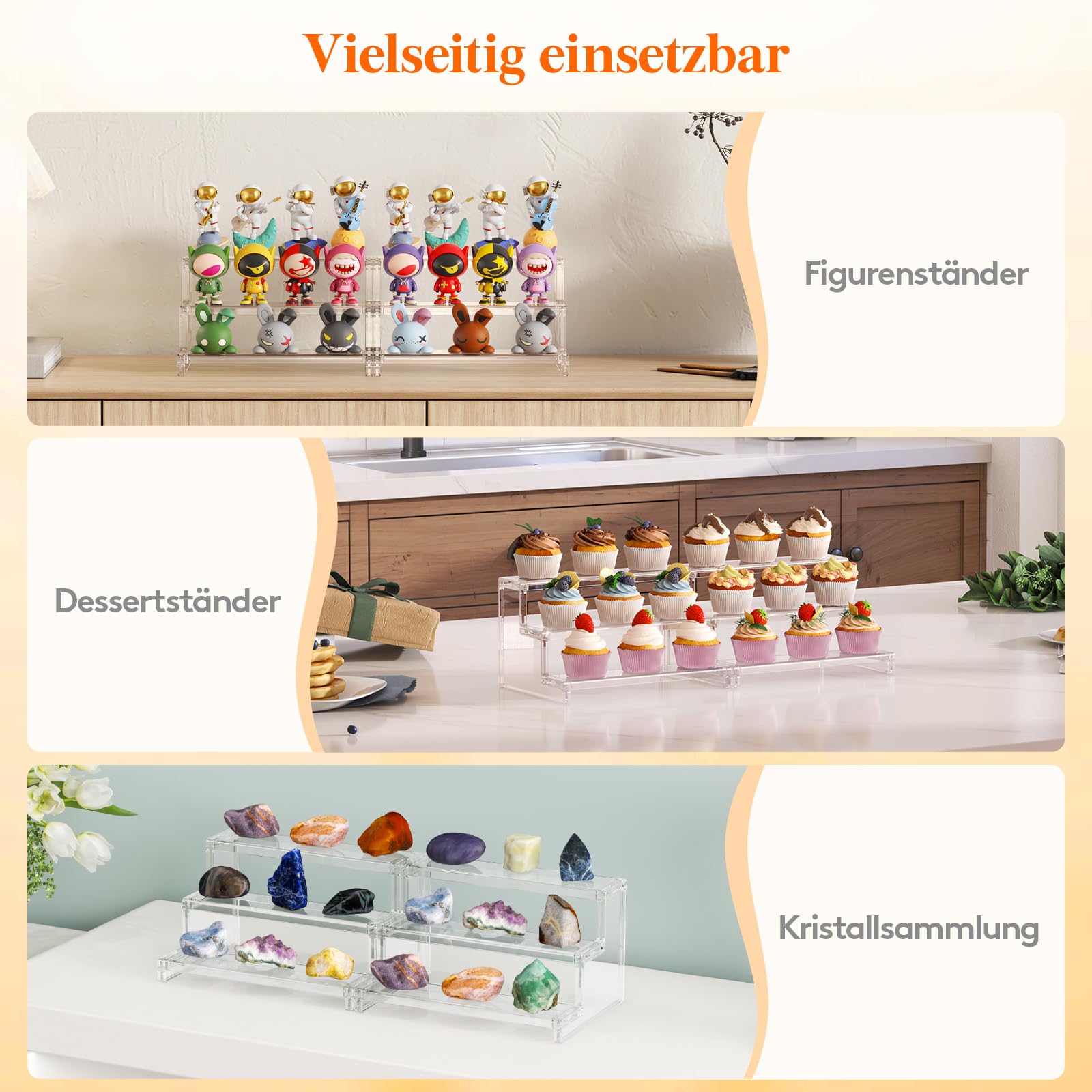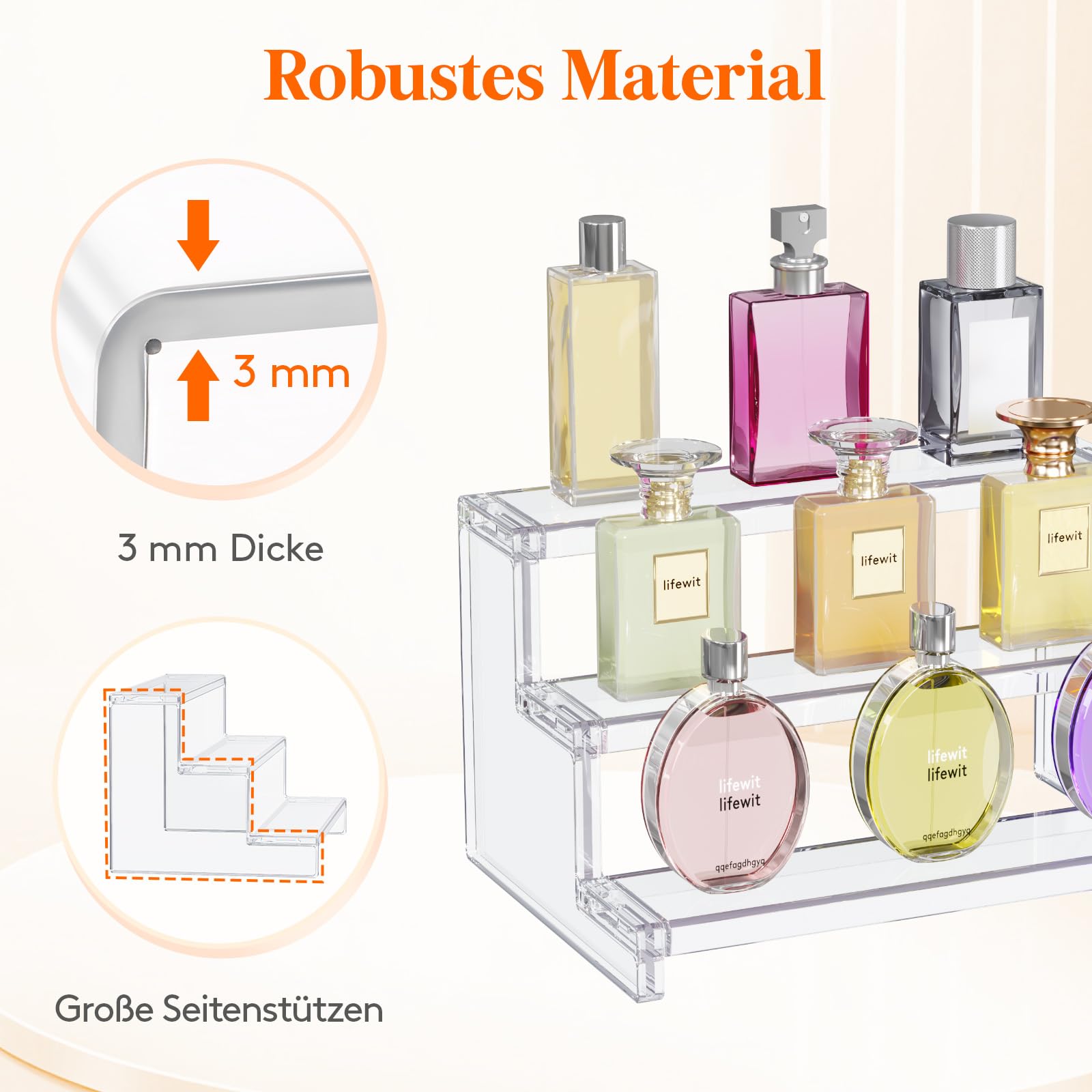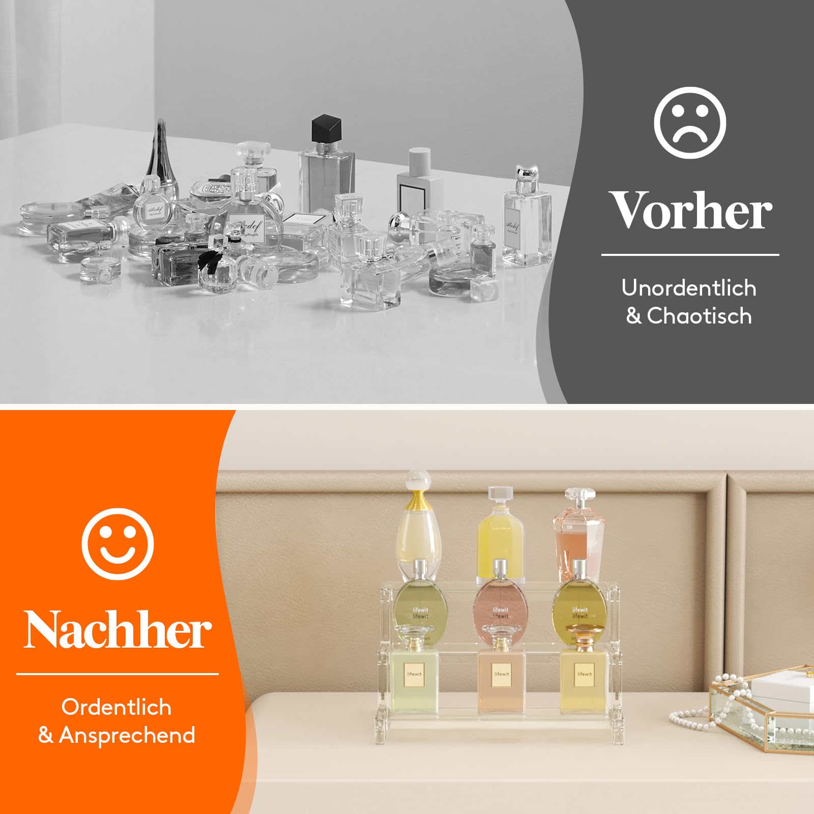 Flexible Set Options: Our three-tiered perfume organizers come in 23cm and 30cm sizes. Choose between practical 1-piece, 2-piece or 3-piece sets - according to your individual needs and desired presentation options."
