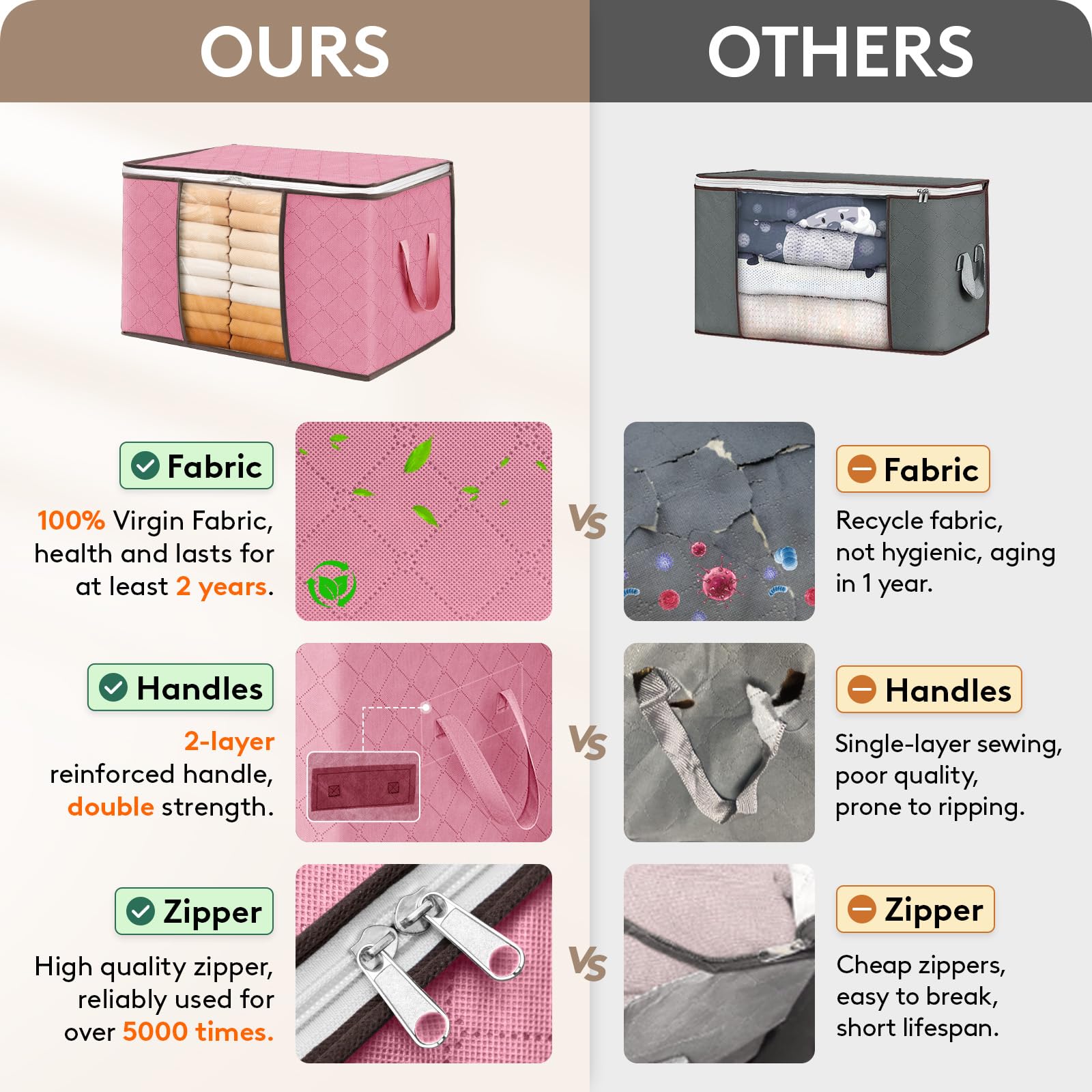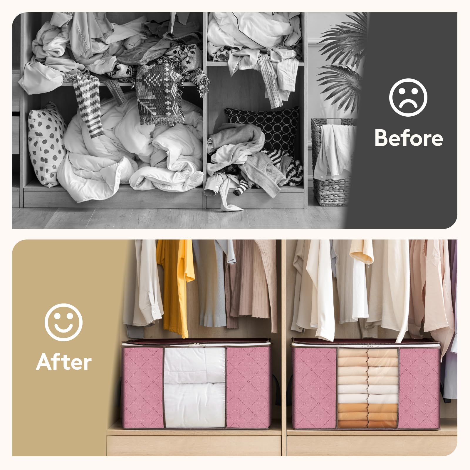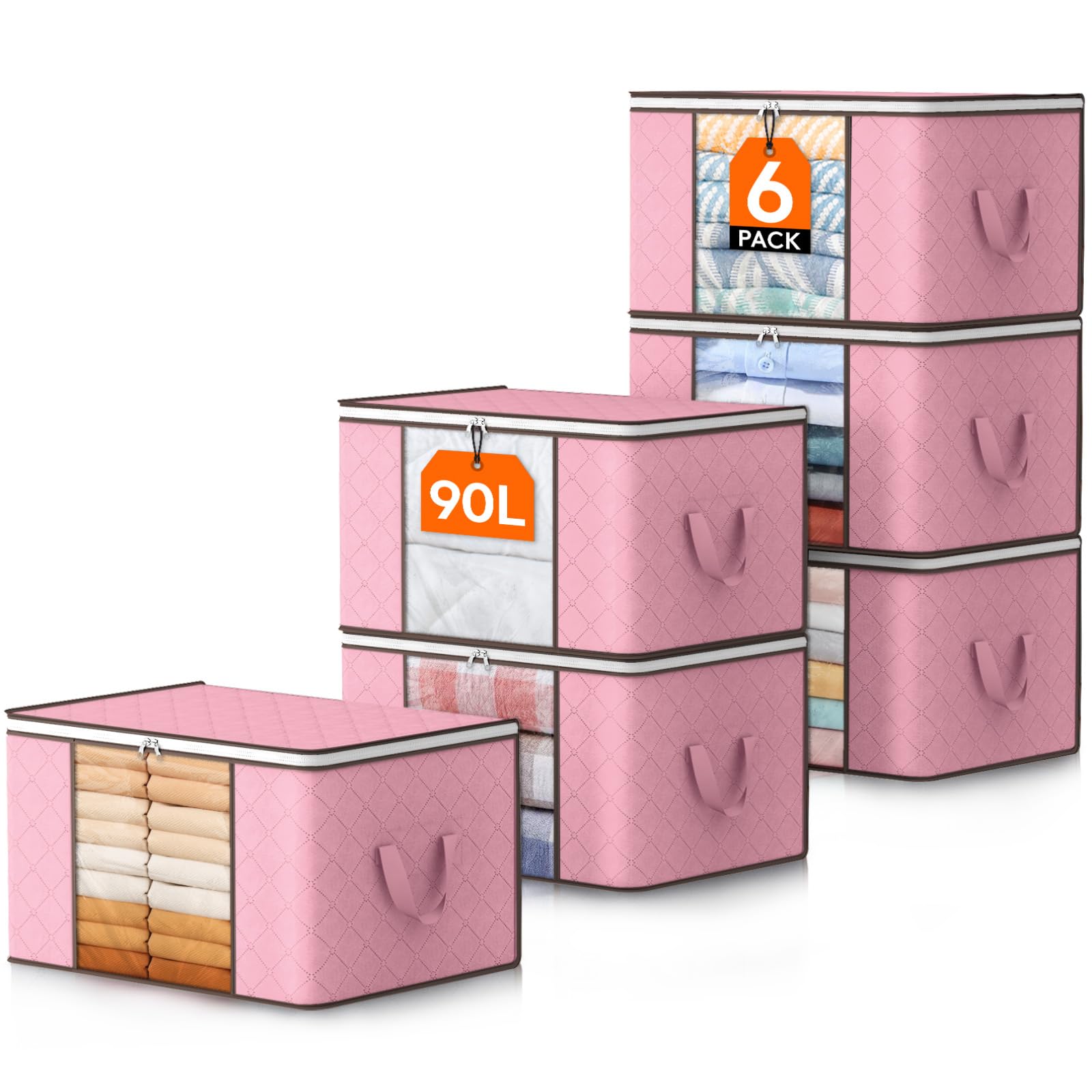 Lifewit 6-piece 90L Storage Bag, Storage Box with Lid, Large Clothes Storage Moving Boxes, Foldable Storage Boxes for Comforters Blankets Clothes Underbed Closet, Pink