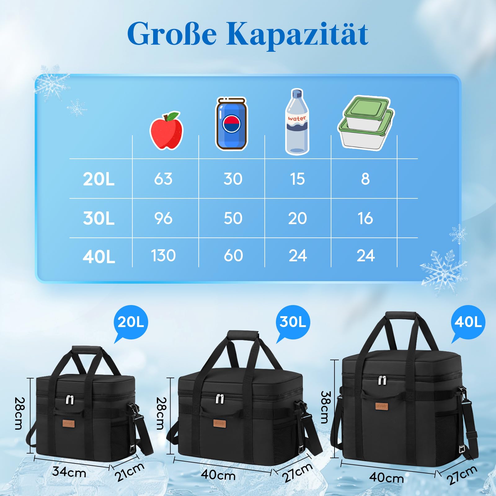 ["Large capacity: Available in sizes 20L/30L/40L, this collapsible cooler bag can hold up to 30, 48, or 72 cans (330 ml) and provides plenty of space for all drinks and snacks. The small cooler bag (30L) measuring 40 cm × 27 cm × 28 cm can be stored compactly in a drawer","Excellent insulation: Thanks to the tear-resistant Oxford fabric with waterproof coating, reinforced PEVA lining, and an insulating foam layer, this thermal bag keeps your food and drinks cold, hot, or fresh for up to 12 hours","Completely waterproof: The waterproof Oxford fabric protects the cooler bag from splashing water and light rain. The reinforced PEVA interior lining with thermally welded seams ensures absolute waterproofness - no worries about leaking drinks or food","Thoughtful bag design: A spacious main compartment, a mesh pocket in the lid, and two side mesh pockets offer versatile storage options for drinks, food, and small items. Convenient: the integrated bottle opener on the right side","Versatile carrying options: The padded shoulder straps and six reinforced handles make this lunch bag especially comfortable and versatile in transportation - ideal for camping, hiking, BBQs, and more"]