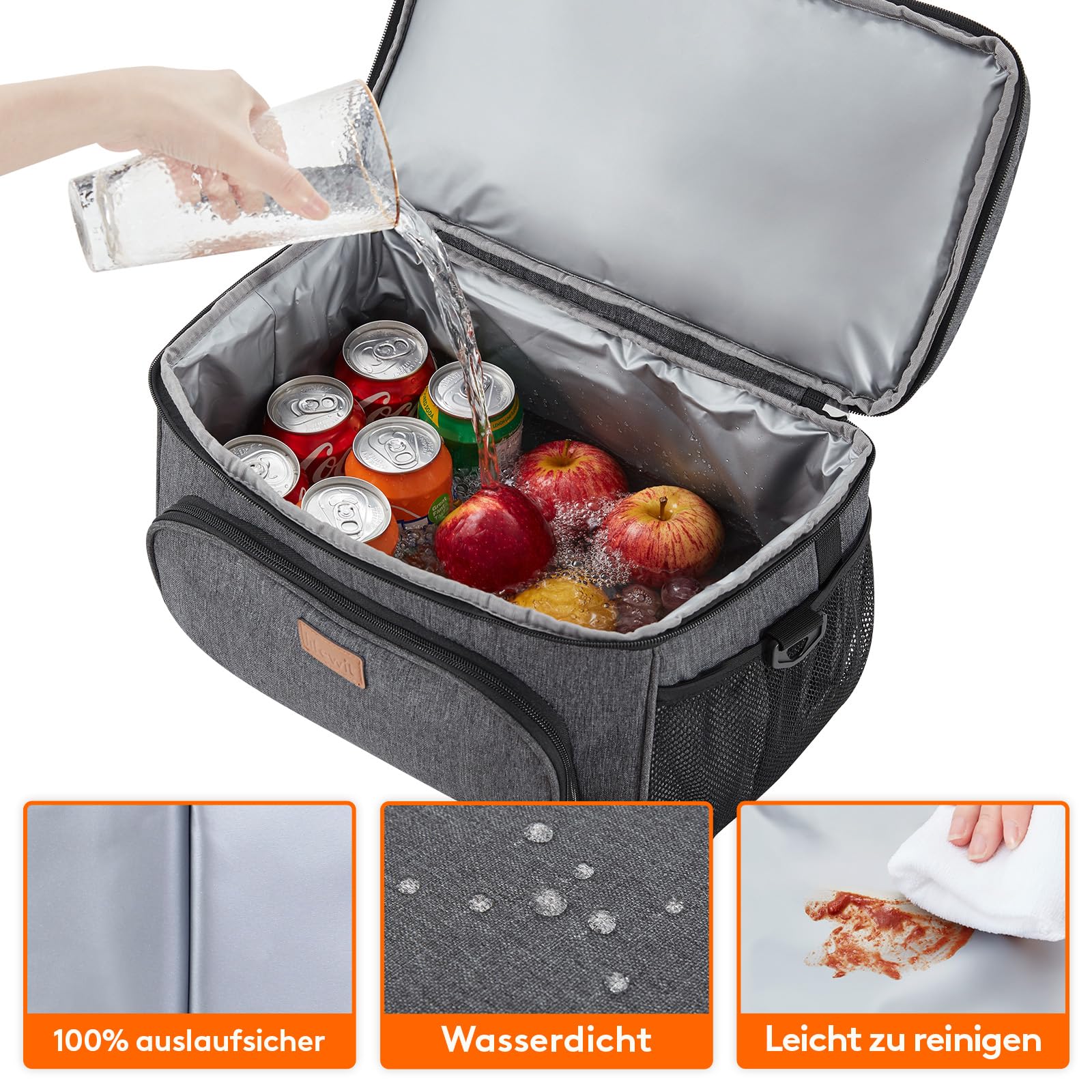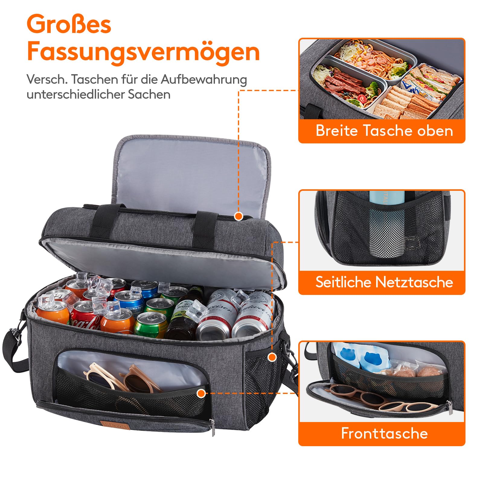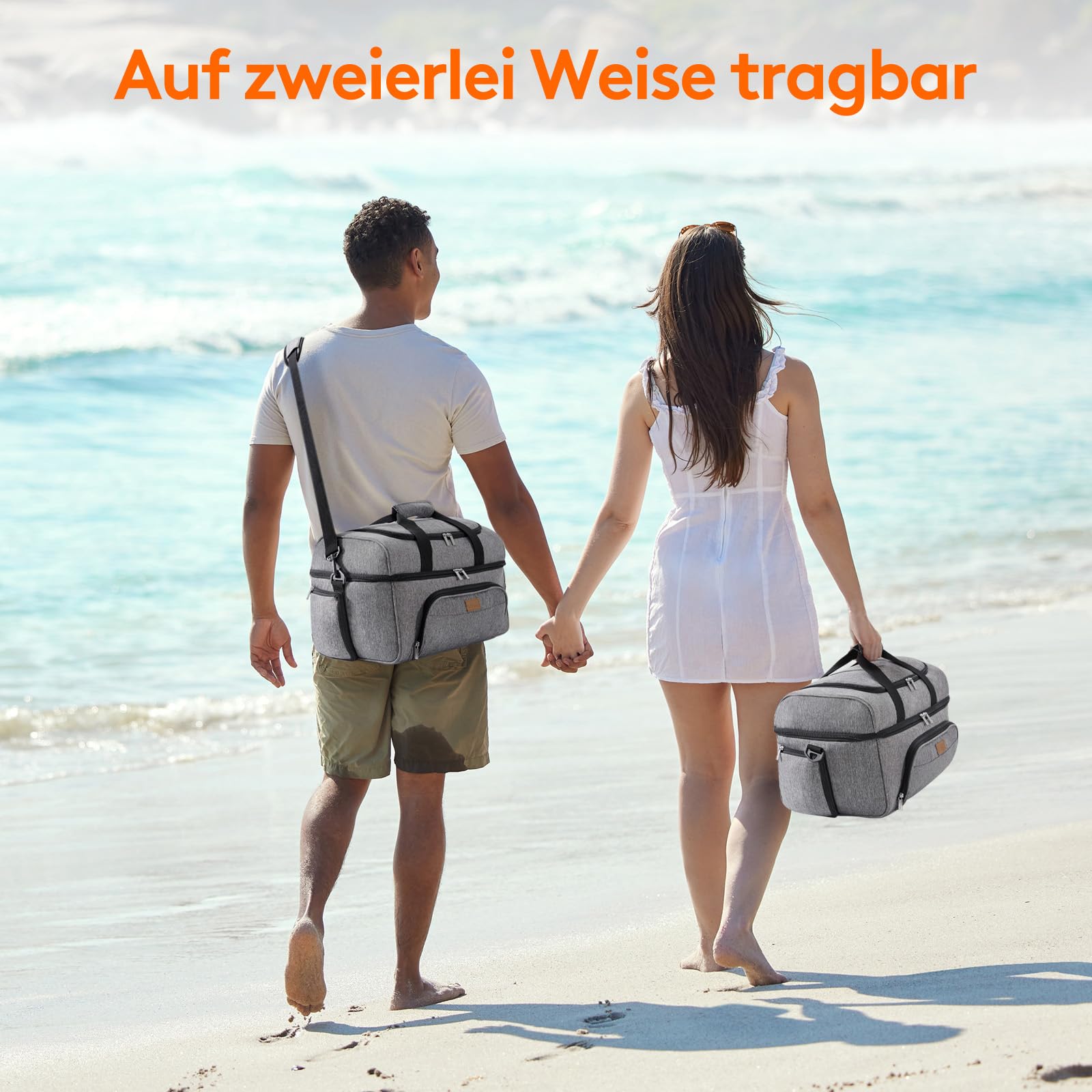 ["Large capacity: Our cooler box holds up to 30 liters of volume. You can carry 48 cans (330ml) of your favorite drinks plus ice. The overall dimensions are approximately 16 x 11 x 11 inches.","Insulation: The outside of the cooler bag is made of 600D Oxford fabric. The inner lining is made of PEVA film and insulation material, which can keep food and drinks cool or warm for more than 5 hours. In addition, the built-in 6mm EPE foam provides excellent protection for your containers, food, and drinks.","Multiple compartments: Equipped with 1 large pocket on top, 2 side pockets, and 2 front pockets, you can store various items in the numerous pockets. The cooler bag can be used as a personal travel bag. The padded handle and removable shoulder strap offer you 3 ways to carry: you can carry the bag by hand or with a shoulder strap. You can also place the bag on your suitcase when traveling.","Leakproof & Waterproof: The bottom part of the bag is not traditionally sewn, but seamlessly connected to the lining by hot pressing. This makes it leakproof and easy to clean. Simply wipe the cooler bag with a damp cloth or napkin.","Versatile: You can pack your lunch and a few ice packs for camping, picnics, and beach trips in this beach cooler bag and also store it in the trunk of your SUV. When traveling by plane, you can fold it flat and pack it in your suitcase."]
