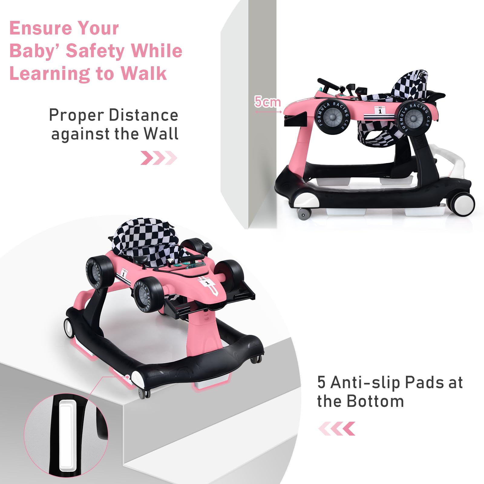 "Adjustable height design: To adapt to your baby's rapid growth, this walking aid is triple height-adjustable (50.5cm/53.5cm/55.5cm), ensuring that your baby finds the optimal height for standing and walking in different stages."