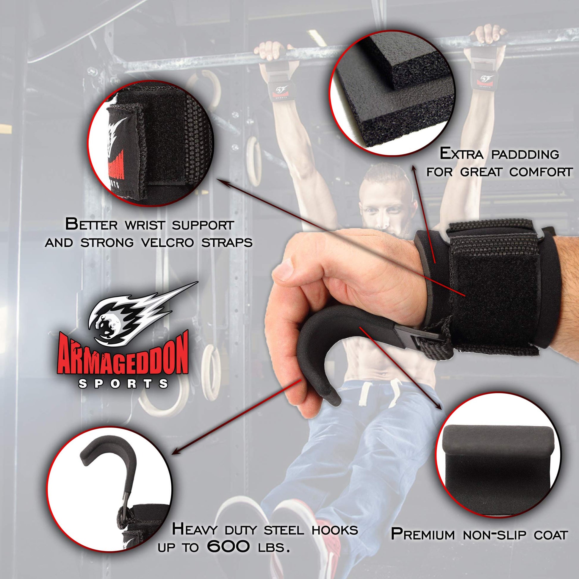 ["Take your training to the next level with our Gym-Wrist Hooks, a must-have for deadlifting and more. Also great for pull-ups, shrugs, calf raises, and more. Say goodbye to weak forearms and hello to better results!","Extremely comfortable and breathable, our Powerlifting Steel Hooks from Armageddon Sports are top quality for the best performance.","No blisters or hand tears when lifting heavy with these steel hooks. Your hands are protected, and you can lift with confidence every time!","Improve your grip with these excellent weightlifting hooks, perfect for those with weak grips and small hands. Say goodbye to normal lifting straps and hello to premium steel hooks with wrist support!","Coated fitness steel hooks that look great in your gym bag and help you build more muscle. Get some extra reps in and see the results for yourself. Don't waste any more time, add them to your cart now and test them out risk-free!"]