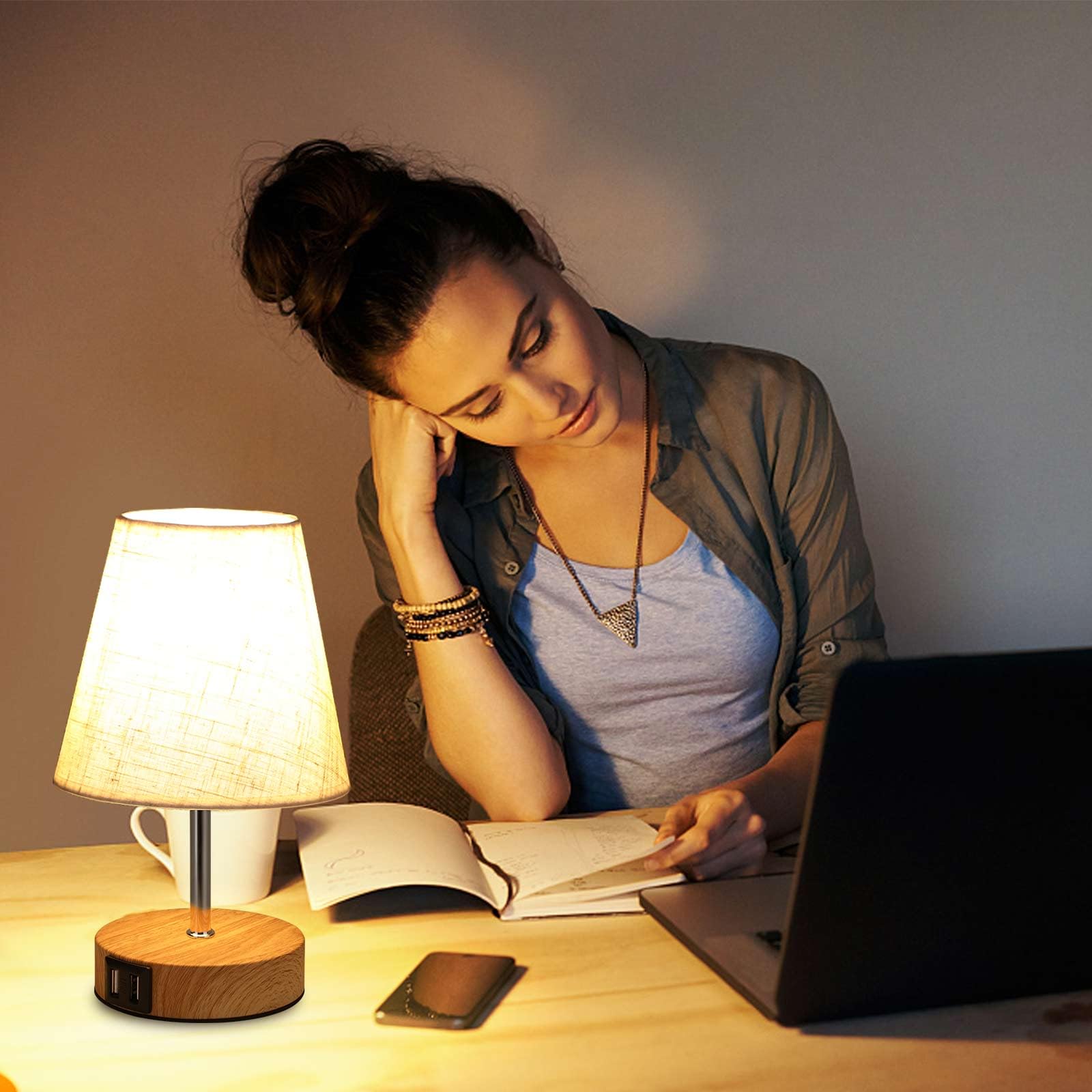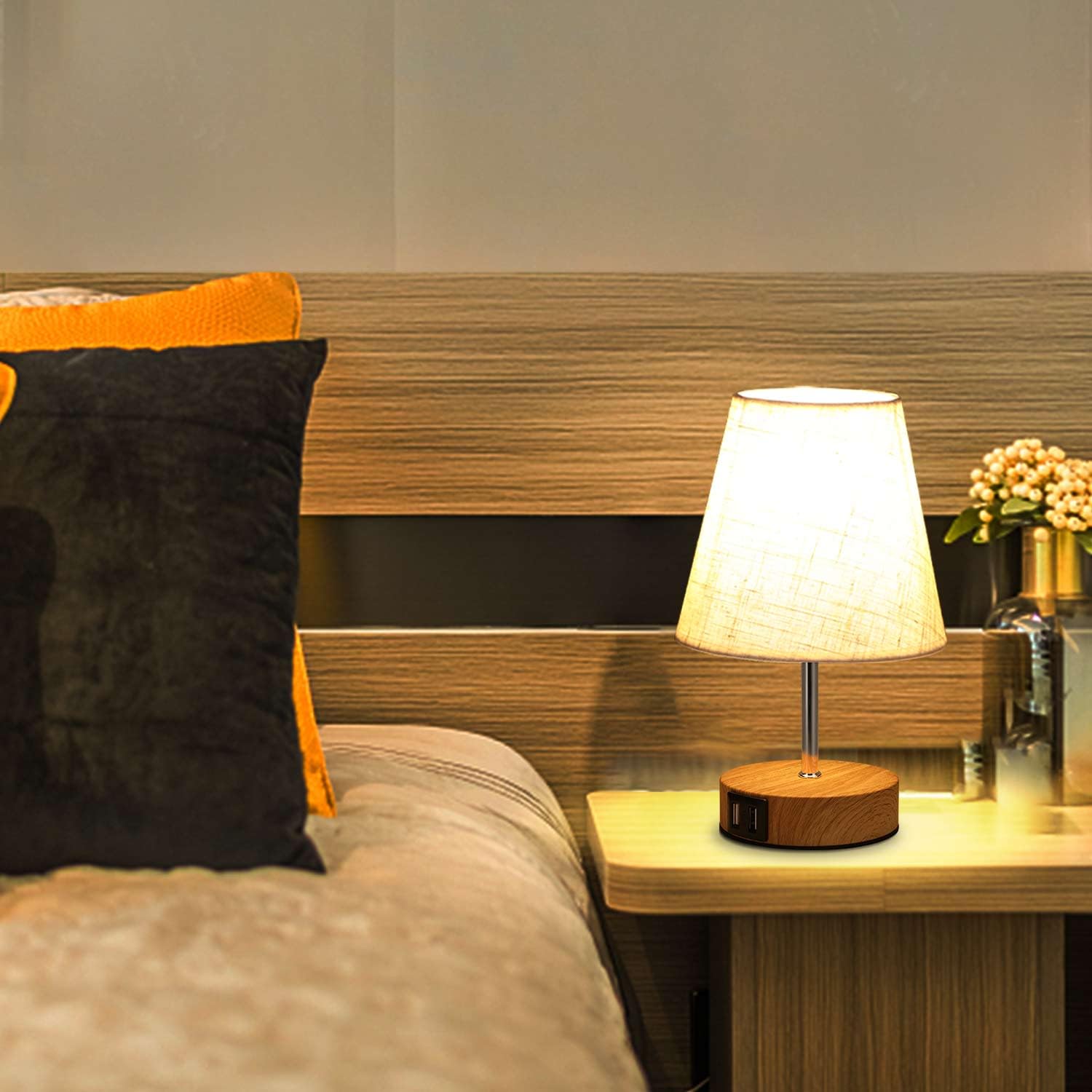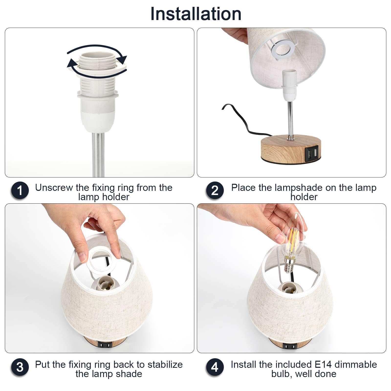 ["Touch function & Dimmable: The bedside lamp USB can adjust 3 brightness levels with touch dimmer, making it easy to customize the brightness to different needs, avoiding the hassle of searching for a light switch.","2X USB charging ports: The bedside lamp touch dimmable in beige comes with 2 convenient 5V 2.1A USB ports for fast charging of your mobile devices such as phones, iPad, power bank, etc.","Beautiful light: This wooden bedside lamp comes with a warm white E14 bulb, making your bedroom and living room much cozier and more inviting. The beautiful beige fabric lampshade, smooth texture, and strong polished metal base make the desk lamp super elegant and classic.","Replaceable bulb: The supplied bulb can be used for 50000 hours. But you can replace the bulbs at any time, please choose dimmable bulbs to support the dimming function.","Features: Dimension: 25x10cm, Light source: E14 bulb (included), Power: Voltage: 86-265V, Power cord: 1.4m. Usage: These 2-pack table lamps are perfect lighting and decoration for living room, bedroom, dining room, reading room, office, cafe, study, and children's room.","Why choose our bedside lamp 1: 👍The stand is made of 0.8mm thick iron sheet, thicker than the 0.3-0.5mm of other brands, preventing deformation. With EVA anti-slip pads, environmentally certified. 👍Double-layer painting for a smoother and more even surface compared to single-layer painting of other brands, without graininess. 👍The bulb is a certified filament bulb, which has better heat dissipation compared to the plastic ball lamps of other brands and does not flicker.","Why choose our bedside lamp 2: 👍The lampshade is made of fire-resistant PVC, more effective than PP material in other brands, does not yellow with long-term use, using environmentally friendly glue. 👍The lamp head is certified according to regular safety and fire protection standards, safer than uncertified products of other brands. 👍The lamp post has a thickness of 1.5mm compared to 1.0mm of other brands, more robust and less prone to bending.","Why choose our bedside lamp 3: 👍USB: Globally certified, complies with various country standards, ensuring an output of 5V 2.1A. 👍Touch function optimized with the Taiwan Tontek scheme for higher sensitivity. 👍Two-layer insulation standards followed, only Taiwanese gold pins for connections to ensure safety."]