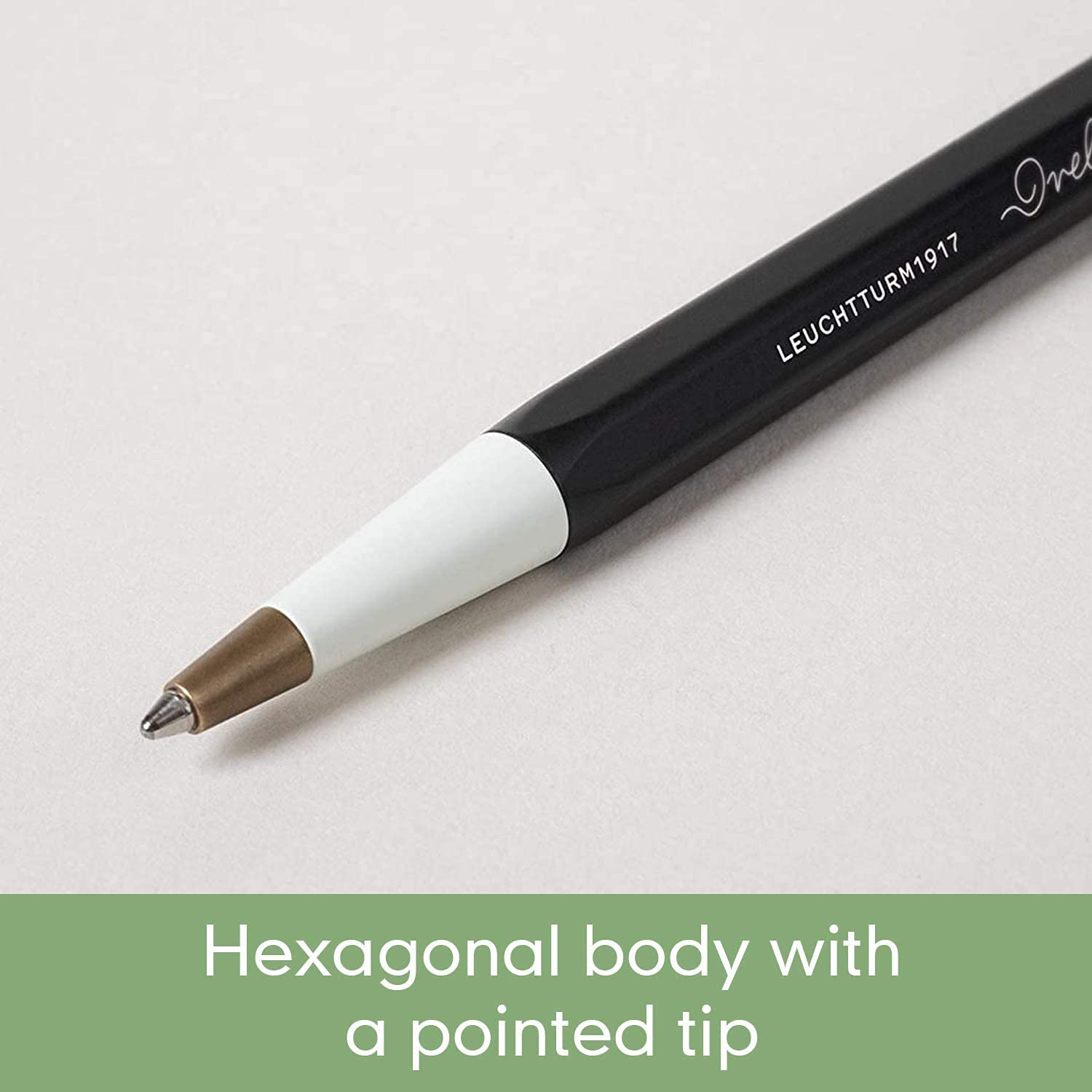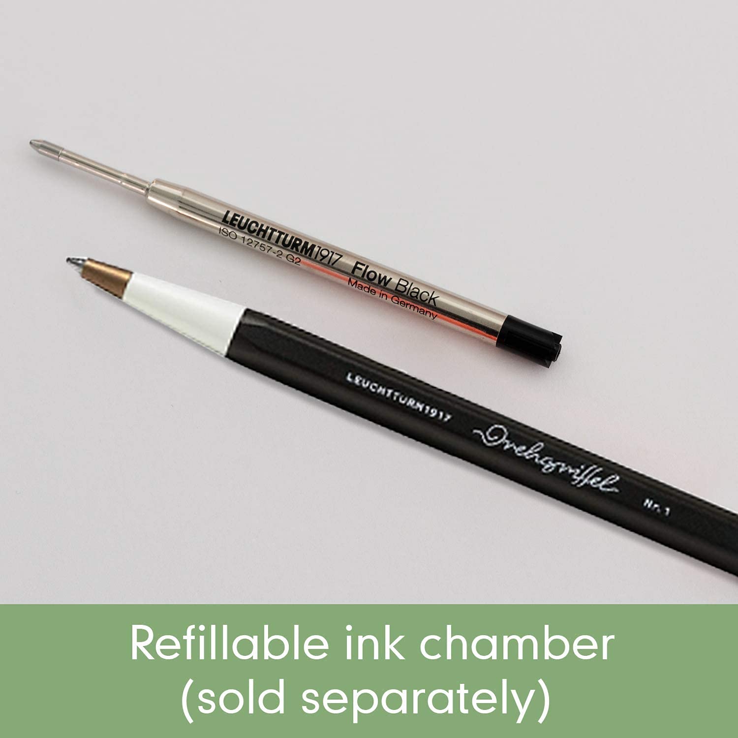 ["The twist pencil is made of precisely milled aluminum and brass, then painted and sealed", "Ballpoint pen with royal blue ink", "DIN ISO 12757 LEUCHTTURM1917 refill, document-proof", "Spring-loaded twist mechanism", "15 different colors (Black, White, Lemon, Powder, Bellini, Red, Sage, Nordic Blue, Denim)"]