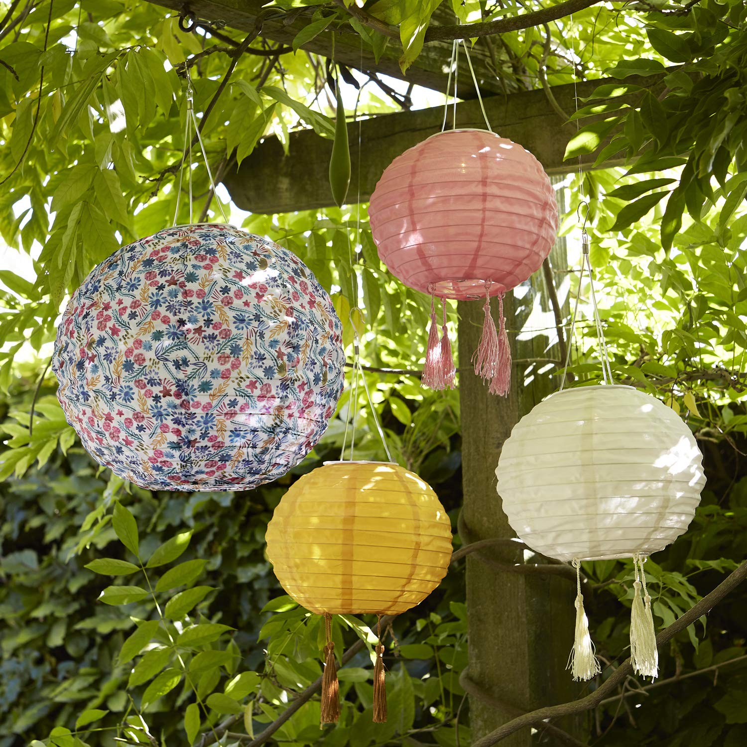 Lights4fun 1x 3 pack Lucena Solar Lantern Cream, Yellow & Pink - LED solar lamp hanging lanterns garden, balcony & terrace - decorative garden light summer party, weatherproof lighting IP44 20cm diameter