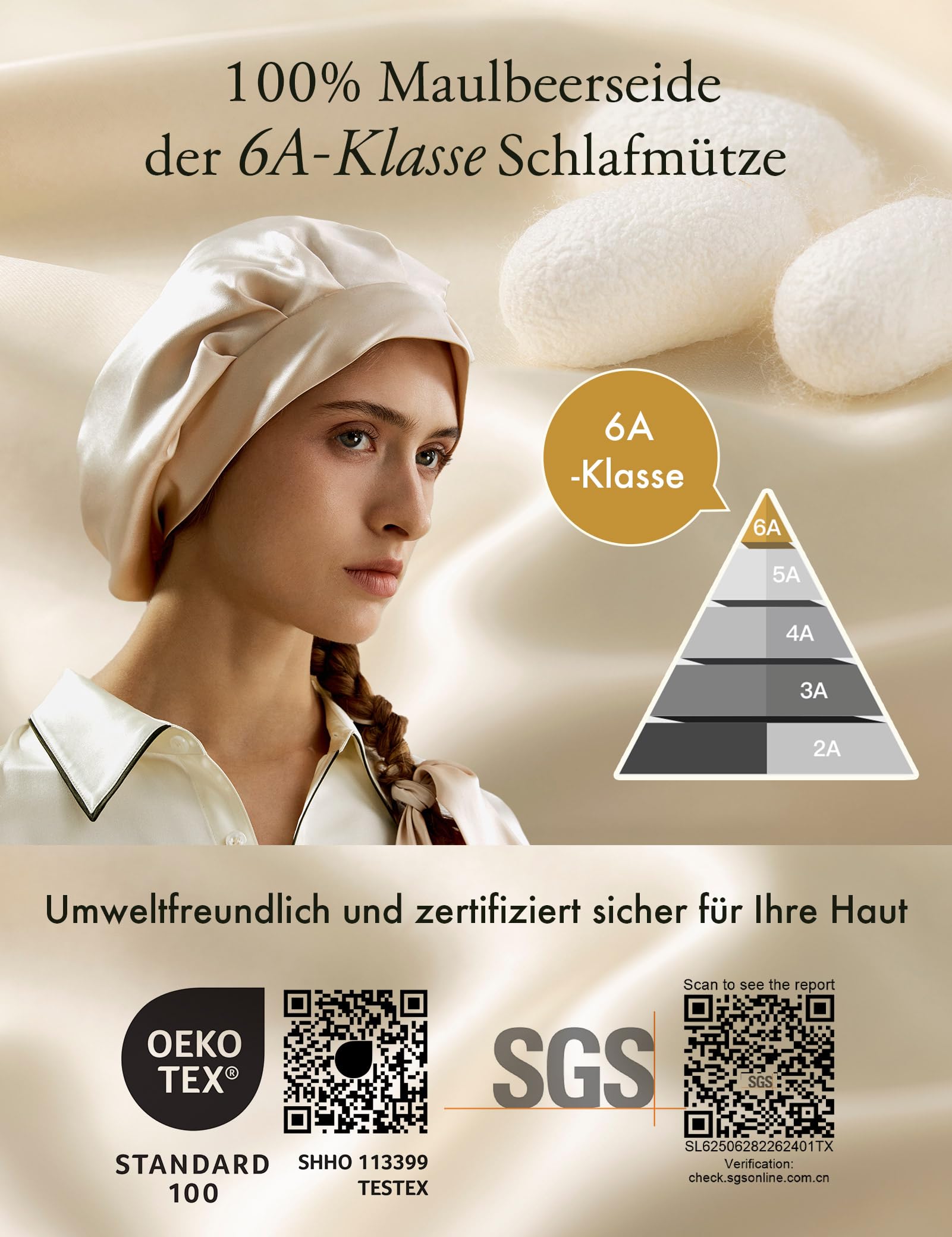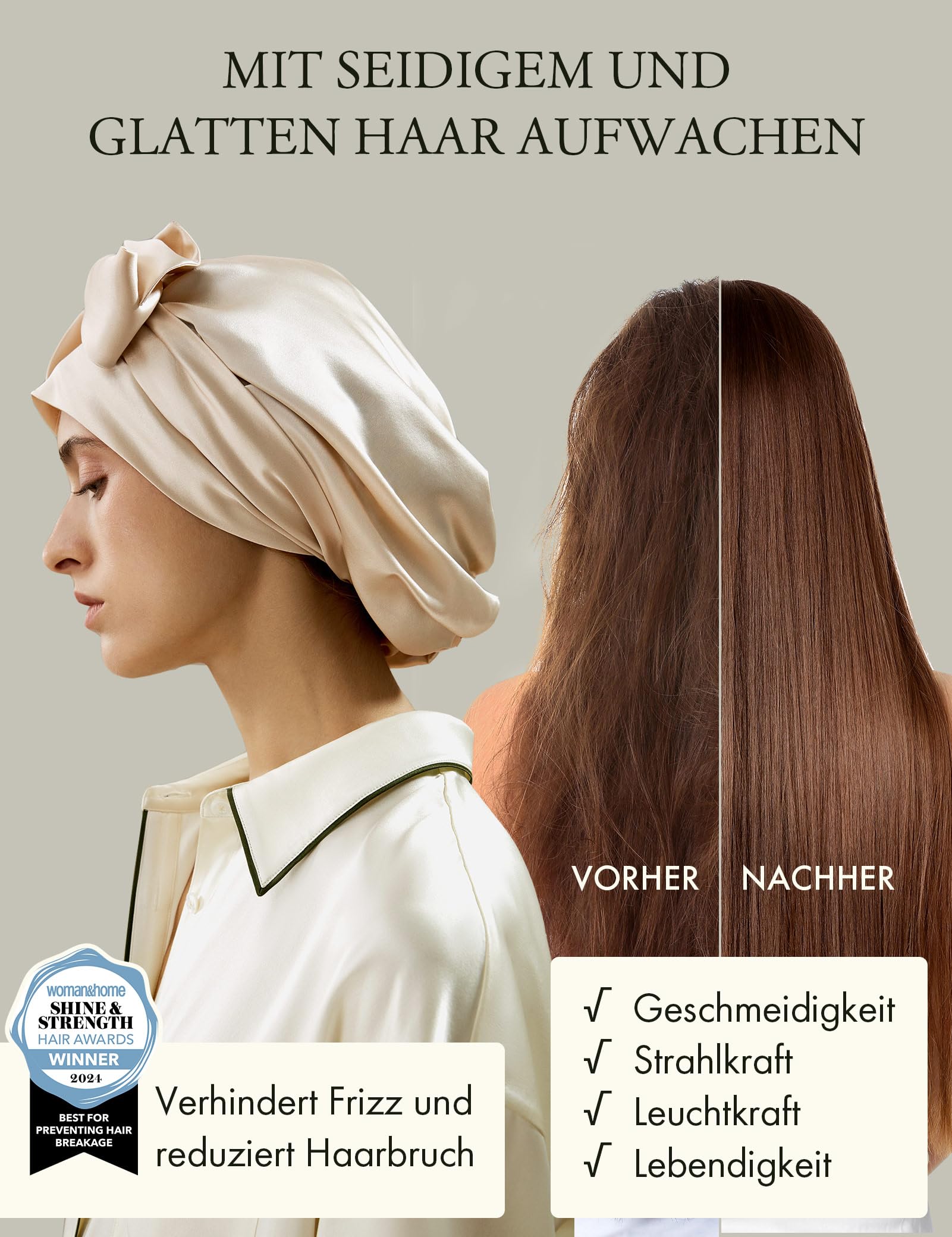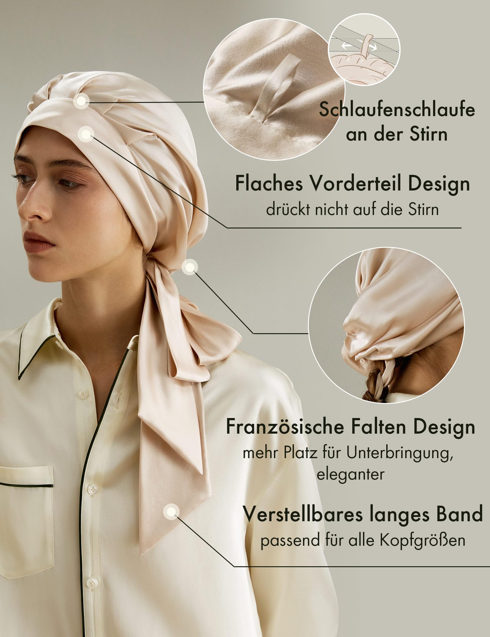 ["CLASS 6A MULBERRY SILK: Unlike satin silk and satin materials, this sleeping cap is made of high-density mulberry silk, which creates a smooth, pearl-like luster and is even lighter, softer, and more durable. Not only does it help moisturize your hair and improve issues like frizz, split ends, and breakage, but it also regulates temperature and prevents your head from getting too cold or too hot during sleep.","ENSURING THAT THE SILK SLEEP CAP STAYS ON YOUR HEAD ALL NIGHT: The extra-long elastic band allows you to securely and comfortably position the silk sleep cap. Although we cannot guarantee 100% that the sleep cap won't slip (the situation may vary slightly for everyone), you can confidently choose the silk sleep cap with the most reliable attachment method.","Perfect Head Circumference Size: The silk sleep cap has a generous head circumference, making it ideal even for thick, long hair. The exact right head size does not compromise the secure fit and makes it suitable for all hair types, lengths, and densities. Secure the silk sleep cap properly and enjoy a perfect night's sleep.","A REVOLUTIONARY DESIGN: The overall design of the silk nightcap is elegant and sophisticated. Thanks to the extra-long elastic band, you can style it in different ways. You can style it with a front bow or wear it on the same side to create a casual and relaxed atmosphere, or tie it at the back for a natural fall. You can even weave it through your hair and tie an elegant bow at the end.","IDEAL GIFT QUALITY: These luxurious pure silk sleep caps are available in black, gold, brown, and red. They are an excellent gift option for your wife, girlfriend, or daughter. The beautiful and durable packaging enhances their status as the perfect gift for your loved ones on special occasions."]