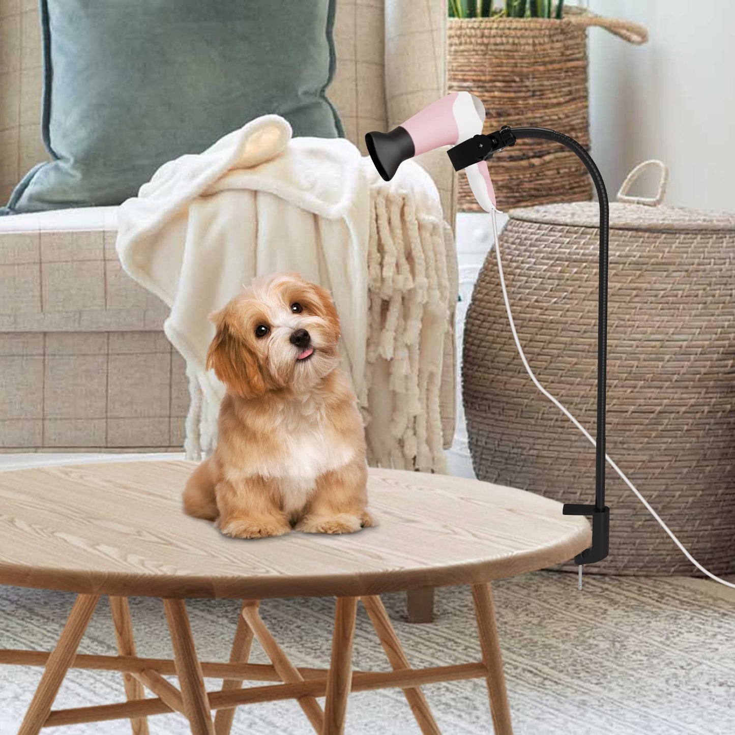 ["Hands-Free Hair Dryer Stand made of stainless steel-plastic. Adjustable angle for hair drying or pet grooming.","The adjustable clamp at the bottom of the hair dryer holder accommodates different table thicknesses. Tip: The table mount can be adjusted to fit table thickness and is suitable for tabletops under 6 cm.","The hair dryer hose stand provides a handy third hand. Save time while blow drying and grooming.","Dimensions of the hair dryer clip holder: 33.5 in x 3.1 in x 1.6 in","Includes: 1 rotating hair dryer stand"]