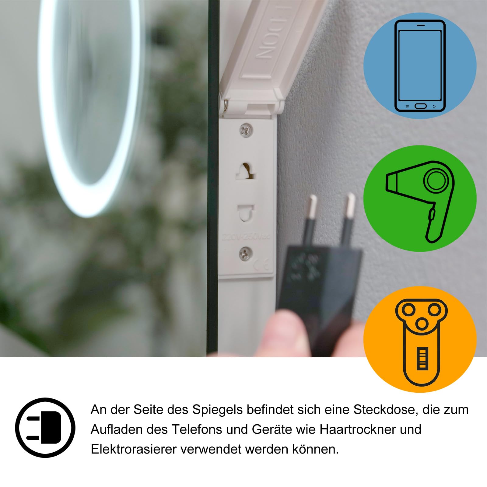 with 3x magnification, clear enlarged image without distortion. There is a socket on the side of the mirror, which can be used to charge the phone and devices such as hairdryers and electric razors."