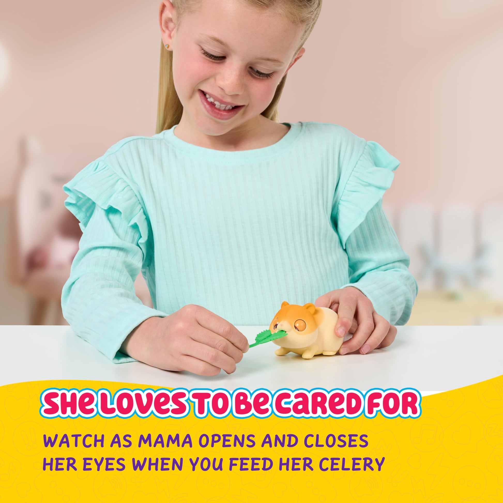 ["Little Live Pets - Mama Surprise is now available in mini size! Watch the animal momma open and close her eyes when you feed her celery - she loves being cared for by you. How many babies will there be? 2, 3, or 4 babies? Each baby delights with a unique fur pattern and a cute pose. Which babies will you discover? Taking care of the animal mom is always fun. Plus, each new baby brings a joyful surprise. Discover 2 surprise accessories and adorn the babies with bibs and bows."]