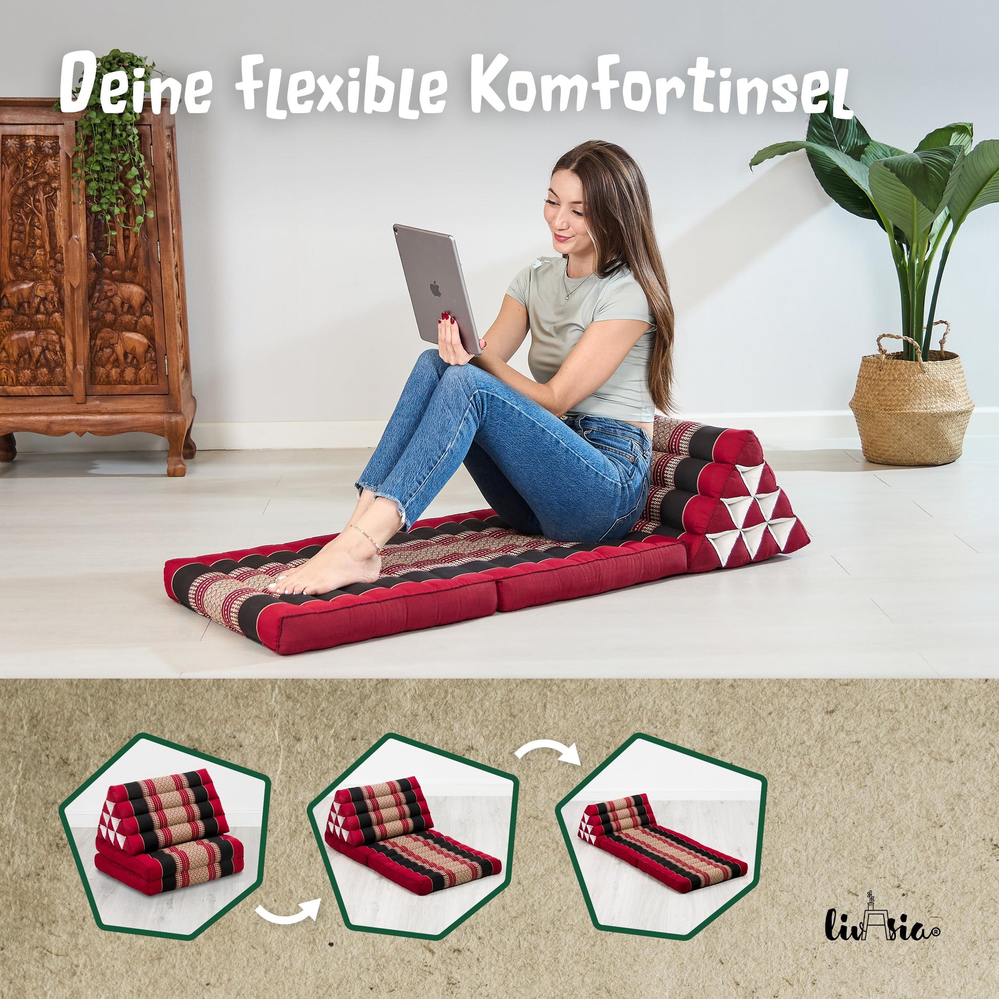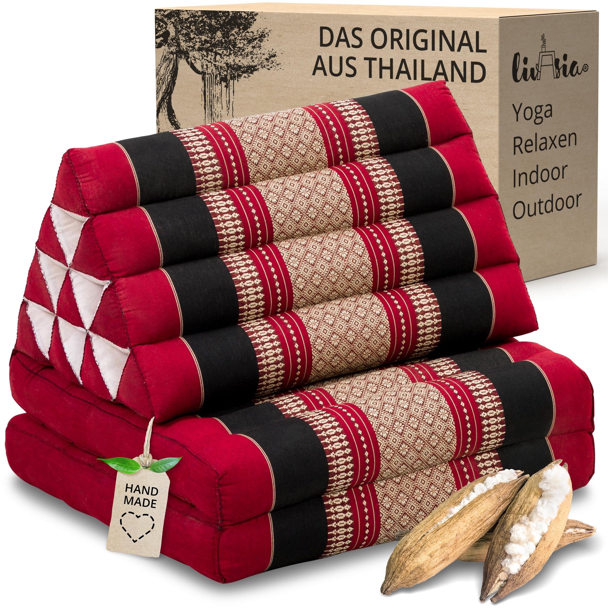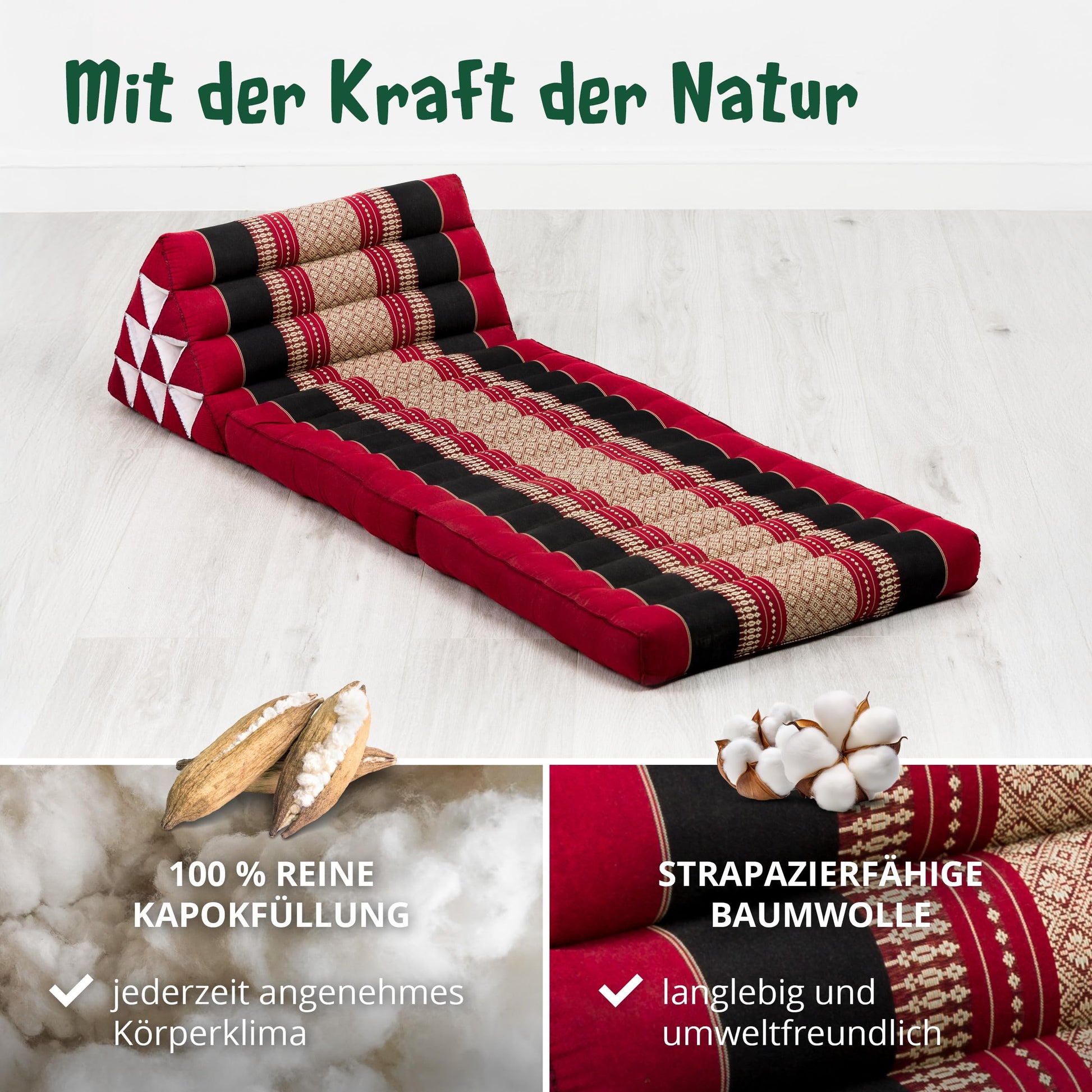 livasia Thai cushion with 2 pillows - 120x50x8 cm - triangle cushion with seat cushion, wedge cushion with kapok, foldable back cushion, Thai mat for folding, handmade, meditation cushion (red/black)