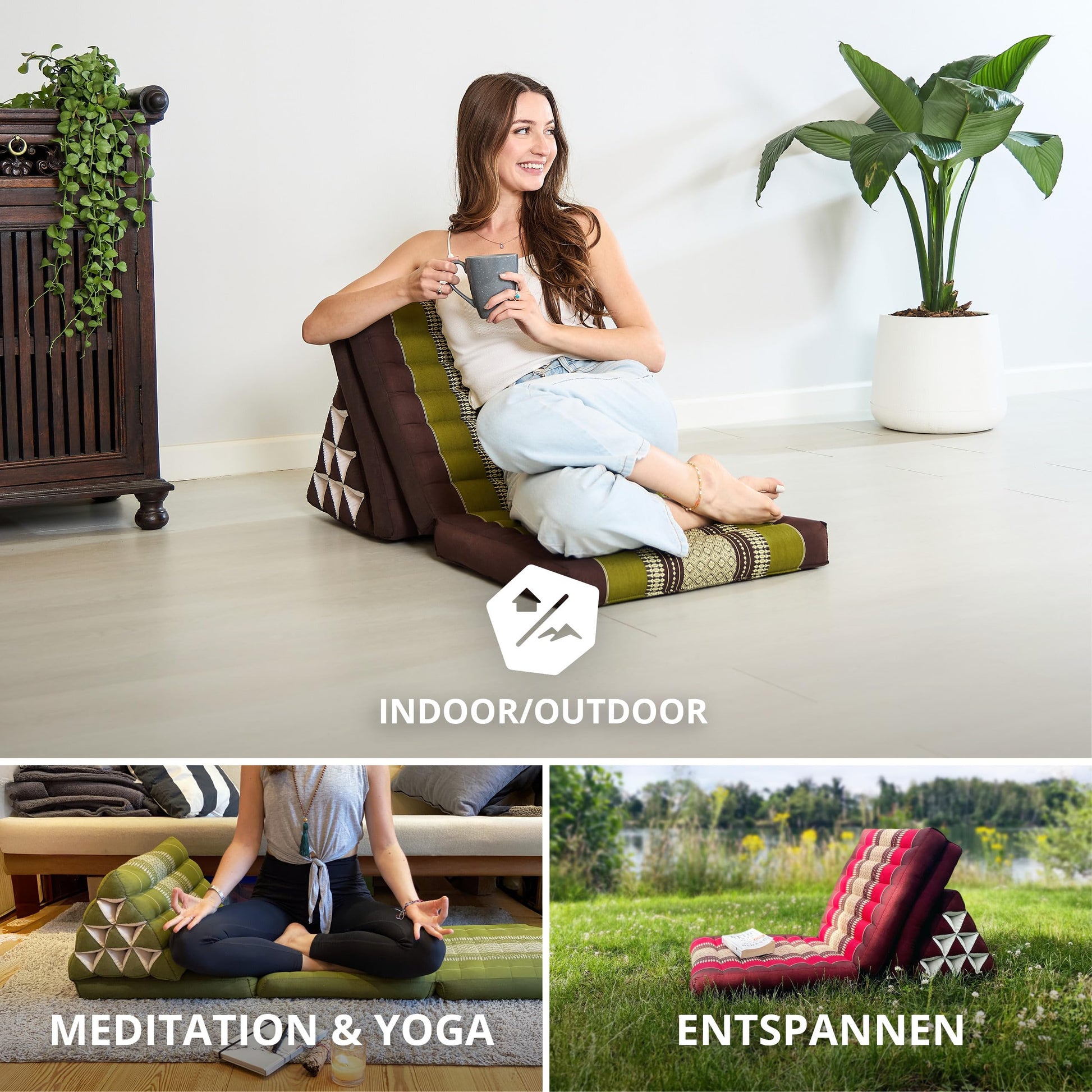 livasia Thai pillow with 3 cushions - 175x50x8cm - triangle pillow with folding mattress, wedge pillow kapok, foldable back pillow, Thai mat for folding, handcrafted, meditation pillow (brown/green)