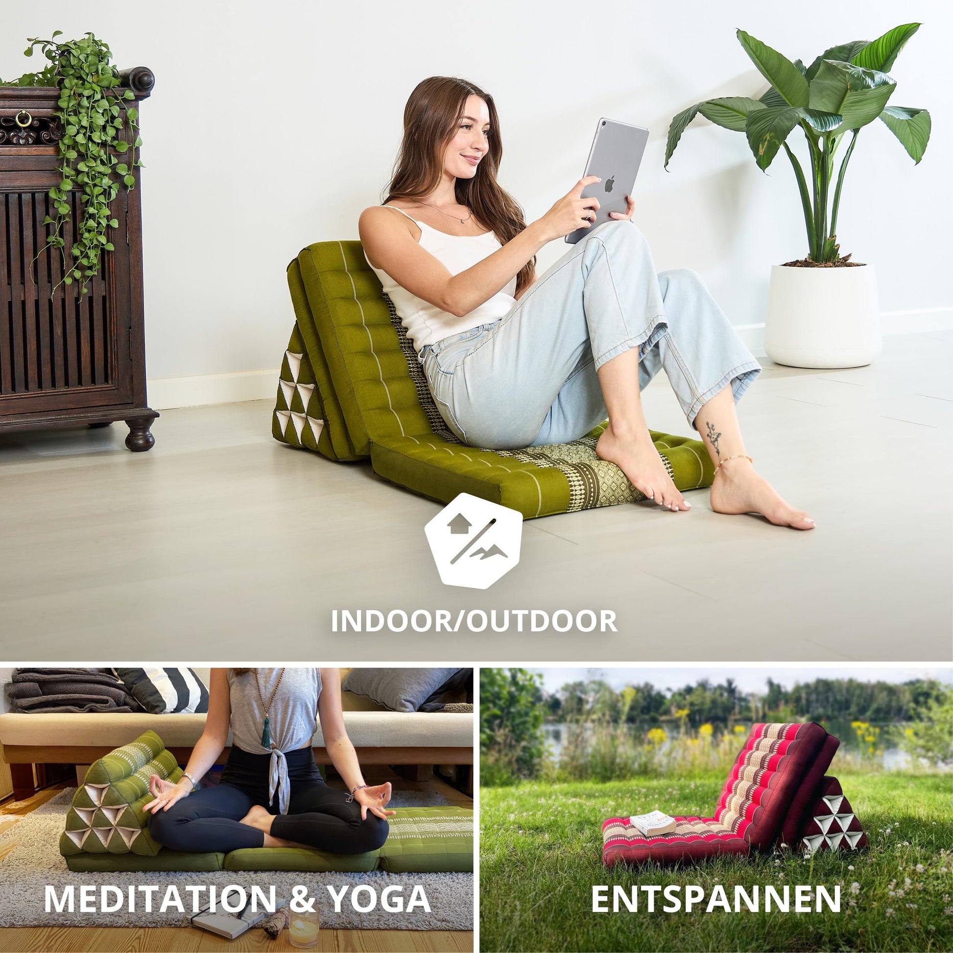 PRACTICAL AND VERSATILE: The firm, stable cushion provides reliable back support and a cozy seat pad. Combined with papaya cushions or bolsters made of kapok, the plant down, you bring Thai coziness into your life. Dimensions of the Thai mat unfolded: 175 cm (L) x 50 cm (W) x 8 cm (H); Dimensions folded: 50 cm (L) x 48 cm (W) x 53 cm (H); Dimensions of the triangular cushion: 32 cm (H); Weight: 6.5 kg. Since each piece is handmade, the dimensions may vary slightly.