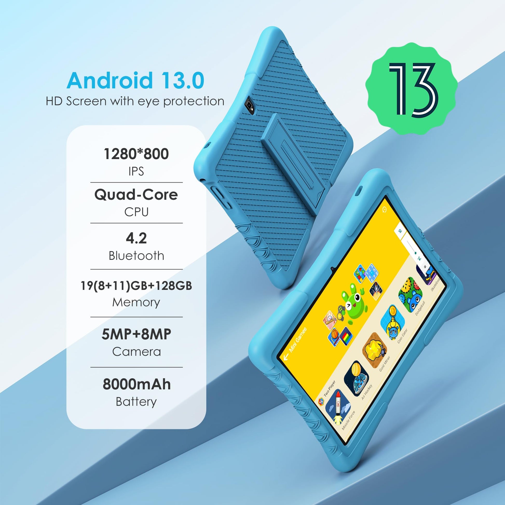 LNMBBS Kids Tablet 10 inch, Android 13 Tablet for Kids, 19GB+128GB/TF 1TB, Kids Tablet with Parental Control, 5MP+8MP, HD IPS Display, WiFi/BT/8000mAh/Google GMS, Learning Tablet with Eva Case-Blue