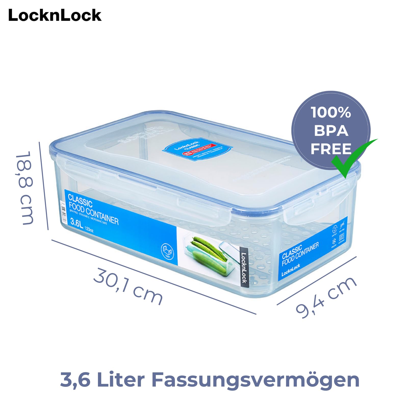 ["100% AIRTIGHT AND WATERPROOF: The airtight storage box can safely transport liquids! Perfect storage for fruits, vegetables, cold cuts, bread, spices, cereal, and eggs. With drainage grid!","THE ORIGINAL: The LocknLock lid is secured with safety locks and cannot open on its own. The double chamber seal securely closes the containers with lid.","FOR KITCHEN & HOME: Use the box as an adult lunchbox, deli containers for the fridge, for meal prep, or as storage containers with lid. These practical containers have been bringing order to pantry storage for over 30 years.","BPA-FREE: All fresh-keeping containers with lids from the PP Classic series are made of polypropylene. They are free of harmful BPA and all boxes are suitable for baby food. Dishwasher safe!","STACKABLE: The practical multifunctional boxes from the PP Classic series are stackable. This creates up to 40% more space in the household. There is the suitable size for every application. Suitable for fridge and freezer boxes."]