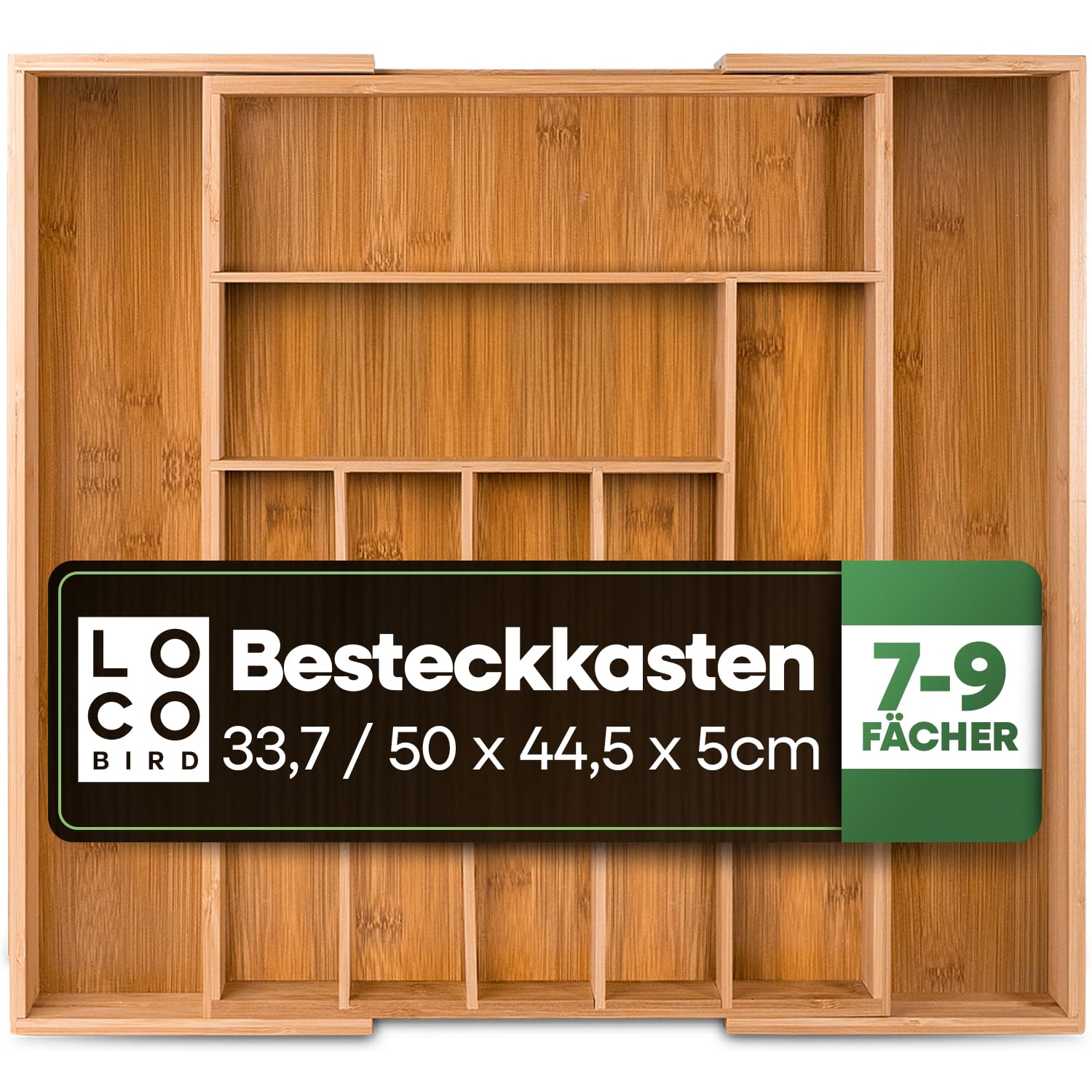 Loco Bird bamboo cutlery tray for drawers, extendable up to 50cm. Adjustable drawer insert for kitchen utensils. Wooden cutlery organizer for kitchen drawers.