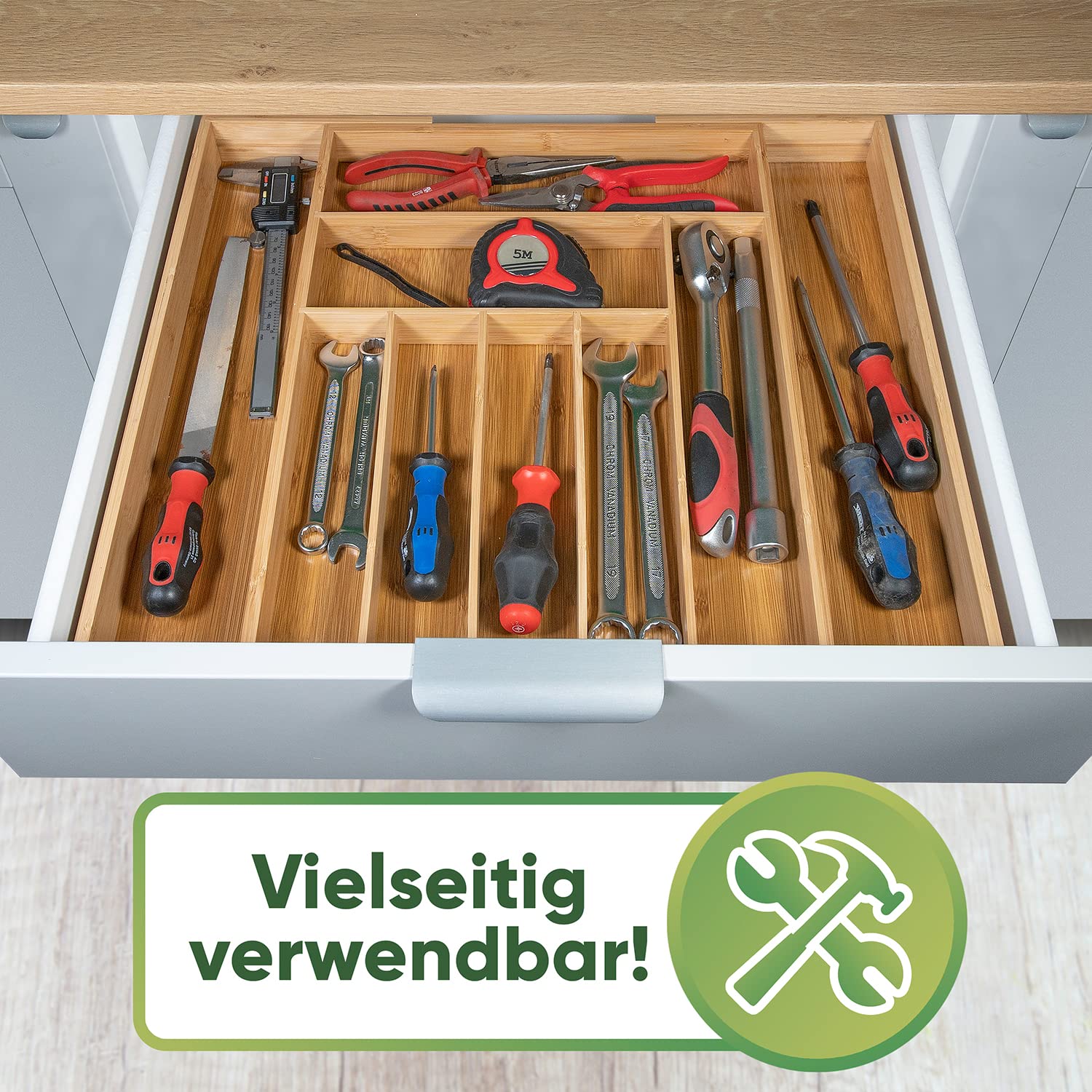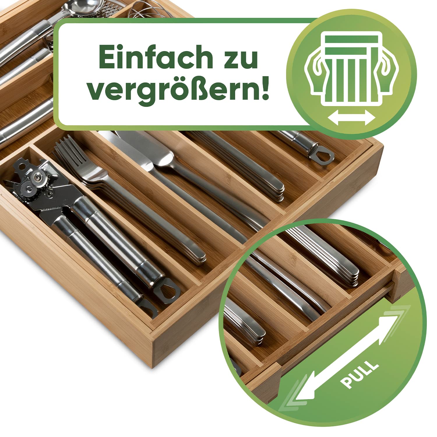 ["Lots of space: In this practical bamboo cutlery tray with 7 or 9 compartments and dimensions of 13.3 x 17.5 x 2 inches or 20 x 17.5 x 2 inches, you have plenty of space. Quickly sort all your cutlery.","Adjustable sizes: Depending on the size of your cutlery drawers or the items you want to store, you can extend this kitchen drawer organizer. This creates 2 more compartments.","Everything tidy: You couldn't sort your cutlery faster than with this practical drawer insert. Whether it's knives, forks, spoons, or other kitchen accessories, you have everything at hand.","Sustainability: Bamboo is one of the fastest-growing woods on this planet, you could literally watch it grow. With this cutlery organizer, you help the environment.","Nicely stored: Sustainable, practical, versatile, and also very elegant. This wooden cutlery tray makes your life easier, creates order, and looks great at the same time."]