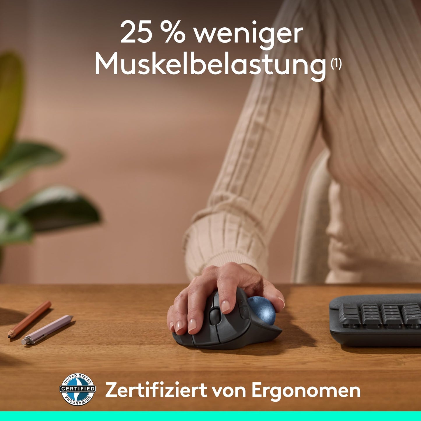 "Less movement, more comfort: The molded design of the wireless trackball mouse ERGO M575S keeps your hand relaxed for hours and enables smooth, precise tracking with thumb control - now with quiet clicks"