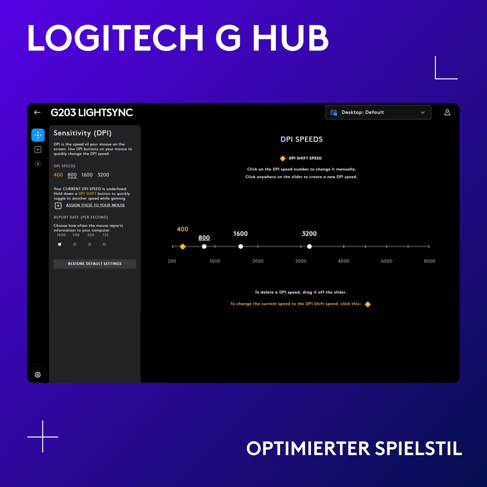 Logitech G203 Gaming Mouse with customizable LIGHTSYNC RGB lighting, 6 programmable buttons, gaming-grade sensor, 8,000 DPI tracking, lightweight - Black