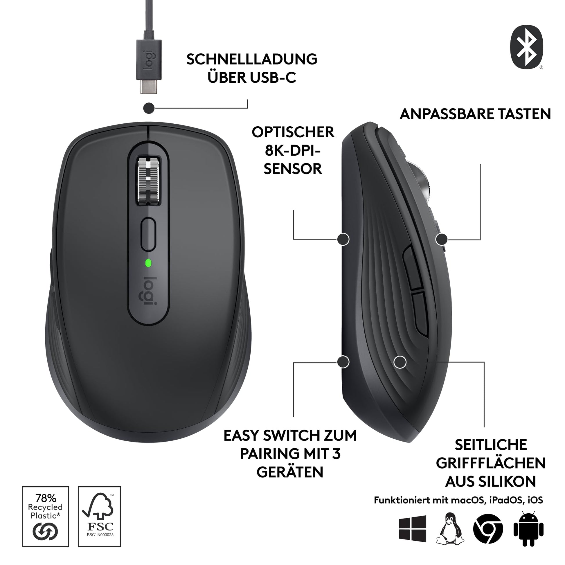Logitech MX Anywhere 3S Compact Wireless Mouse, Fast Scrolling, 8K DPI Any-Surface Tracking, Quiet Clicks, Programmable Buttons, USB C, Bluetooth, Windows PC, Linux, Chrome, Mac - Graphite