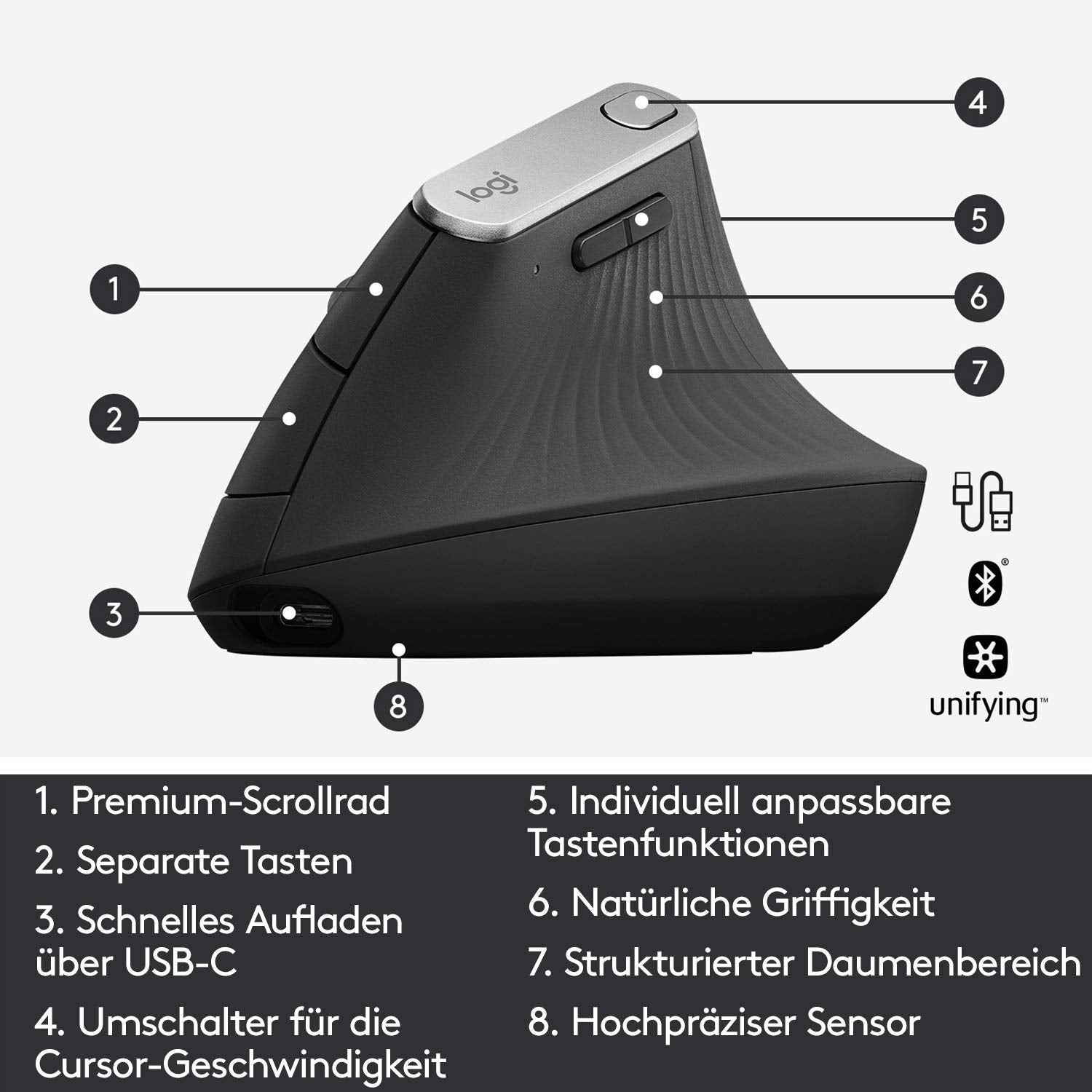Logitech MX Vertical, Ergonomic Wireless Mouse, Bluetooth and 2.4 GHz connection via Unifying USB receiver, 4000 DPI sensor, rechargeable battery, 4 buttons, multi-device, PC/Mac/iPadOS compatible - Graphite