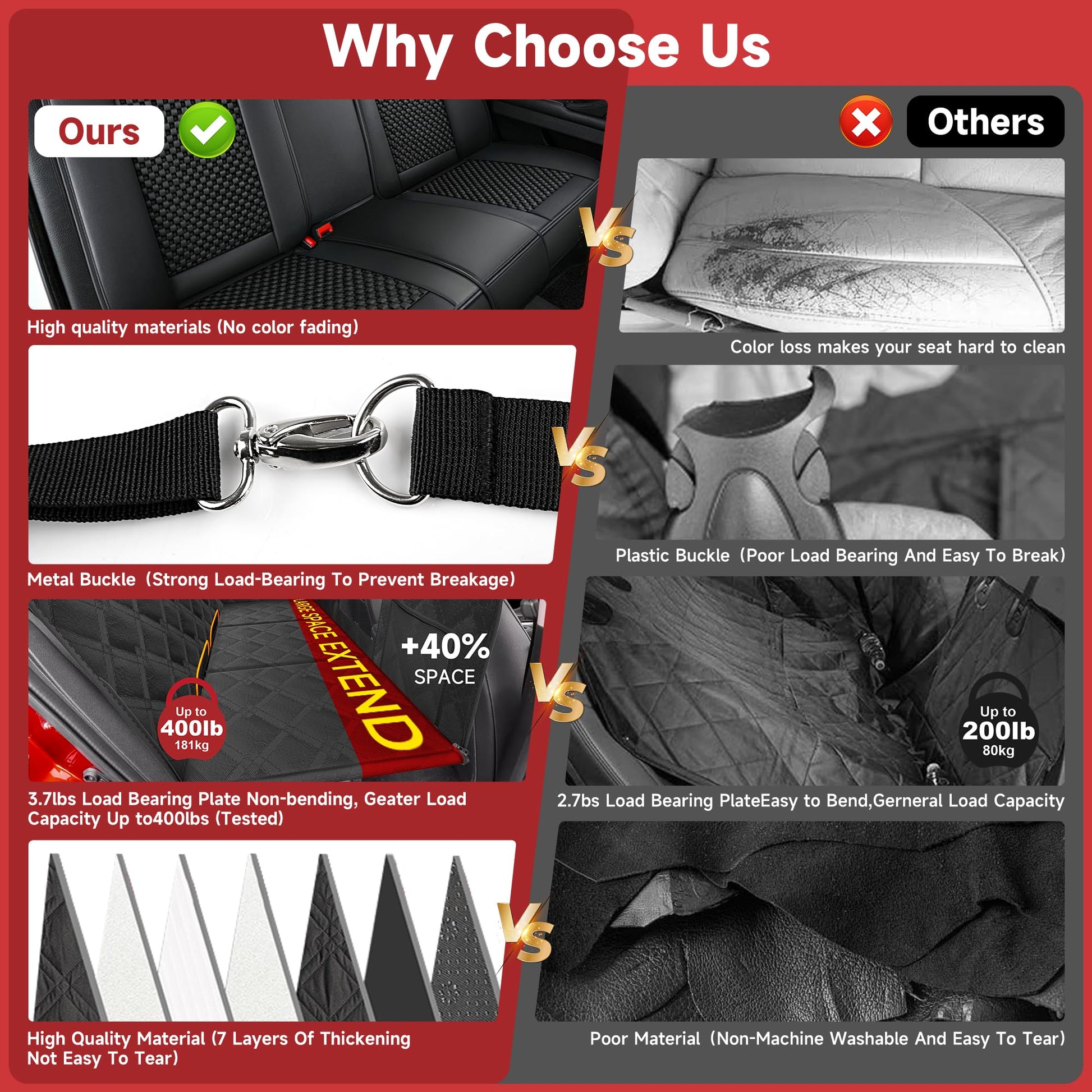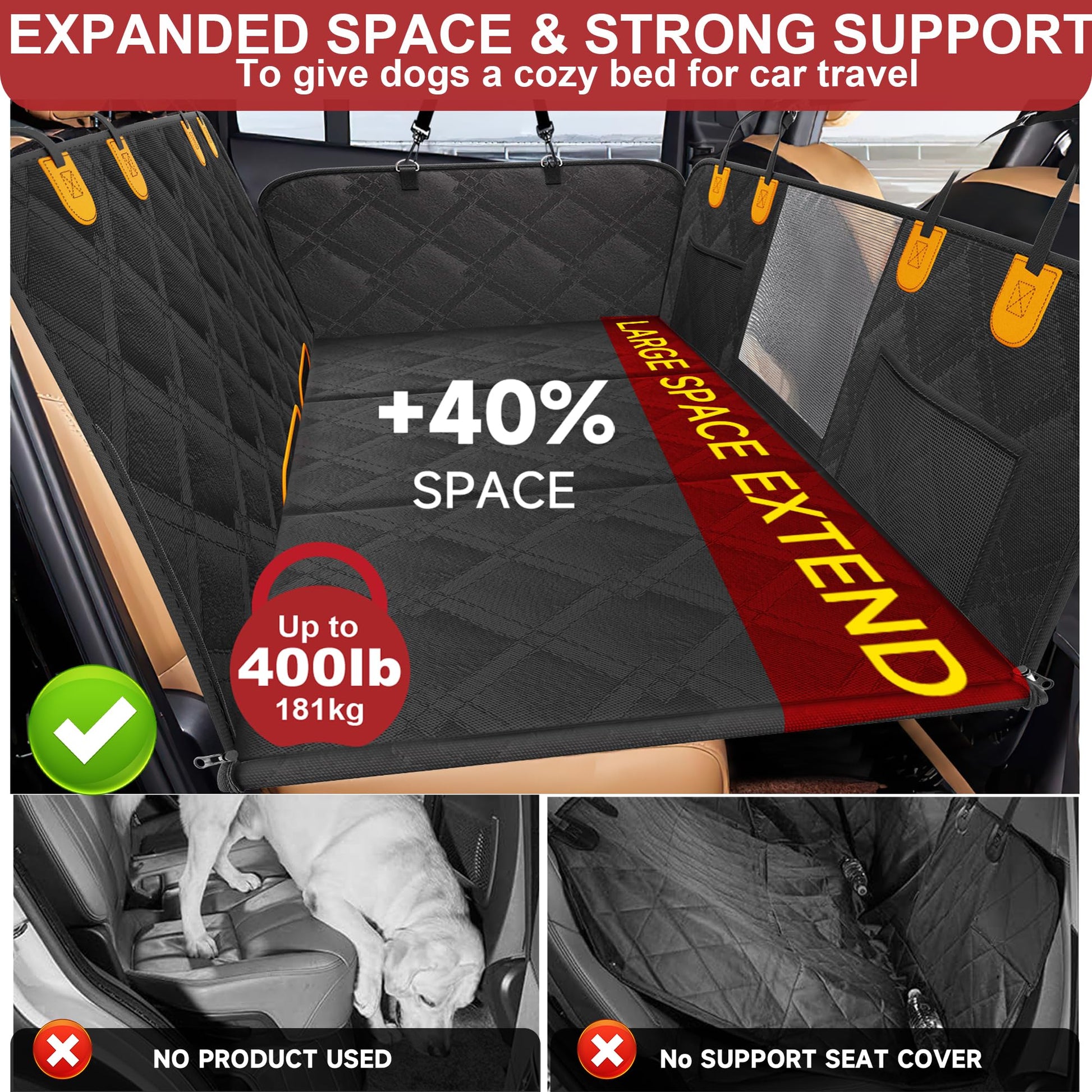 ["Complete Protection for Car & Dog"] Dog car backseat is made of 600D cationic fabric, 100g PP cotton padding, and 3 durable hard fiber boards, easy to remove and clean. 100% scratch and water resistant for the comfort of pets and people alike. The bottom is made of 600D Oxford fabric equipped with anti-slip particles and plugs to prevent the mat from slipping. Suitable for pets weighing up to 181kg.