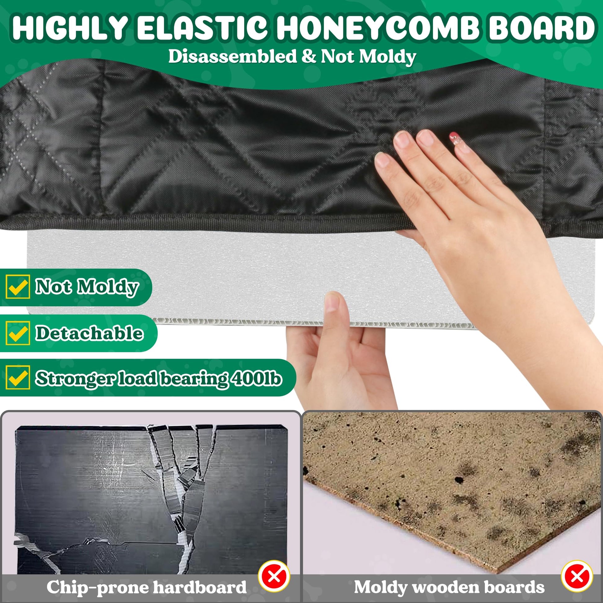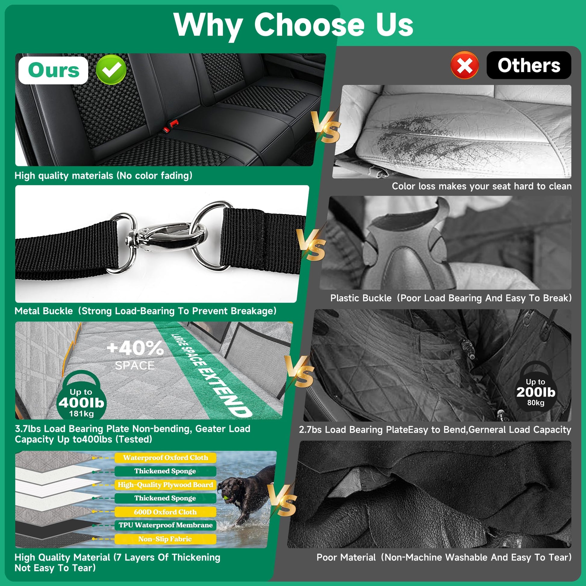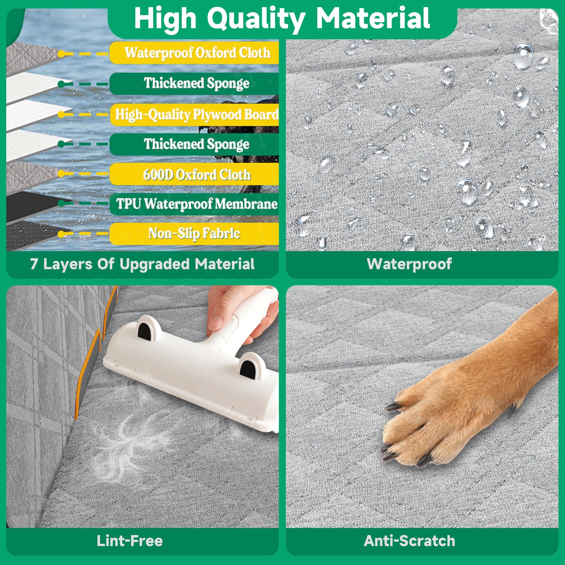 ["Complete Protection for Car & Dog"] Dog car backseat is made of 600D cationic fabric, 100g PP cotton padding, and 3 durable hard fiber plates, easy to remove and clean. 100% scratch and water-resistant for the comfort of both pets and humans. The bottom is made of 600D Oxford fabric with anti-slip particles and plugs to prevent the mat from slipping. It is suitable for pets weighing up to 181kg.
