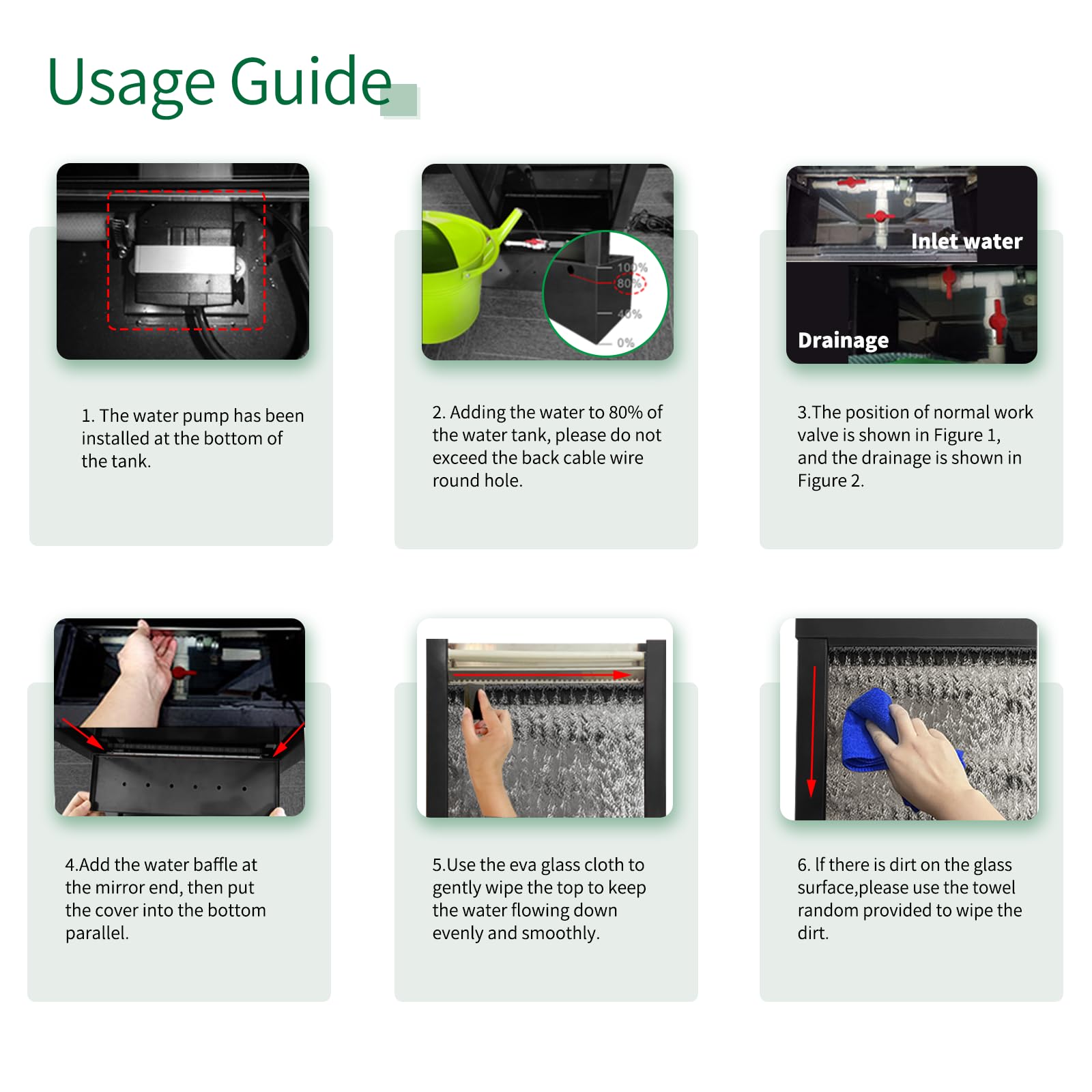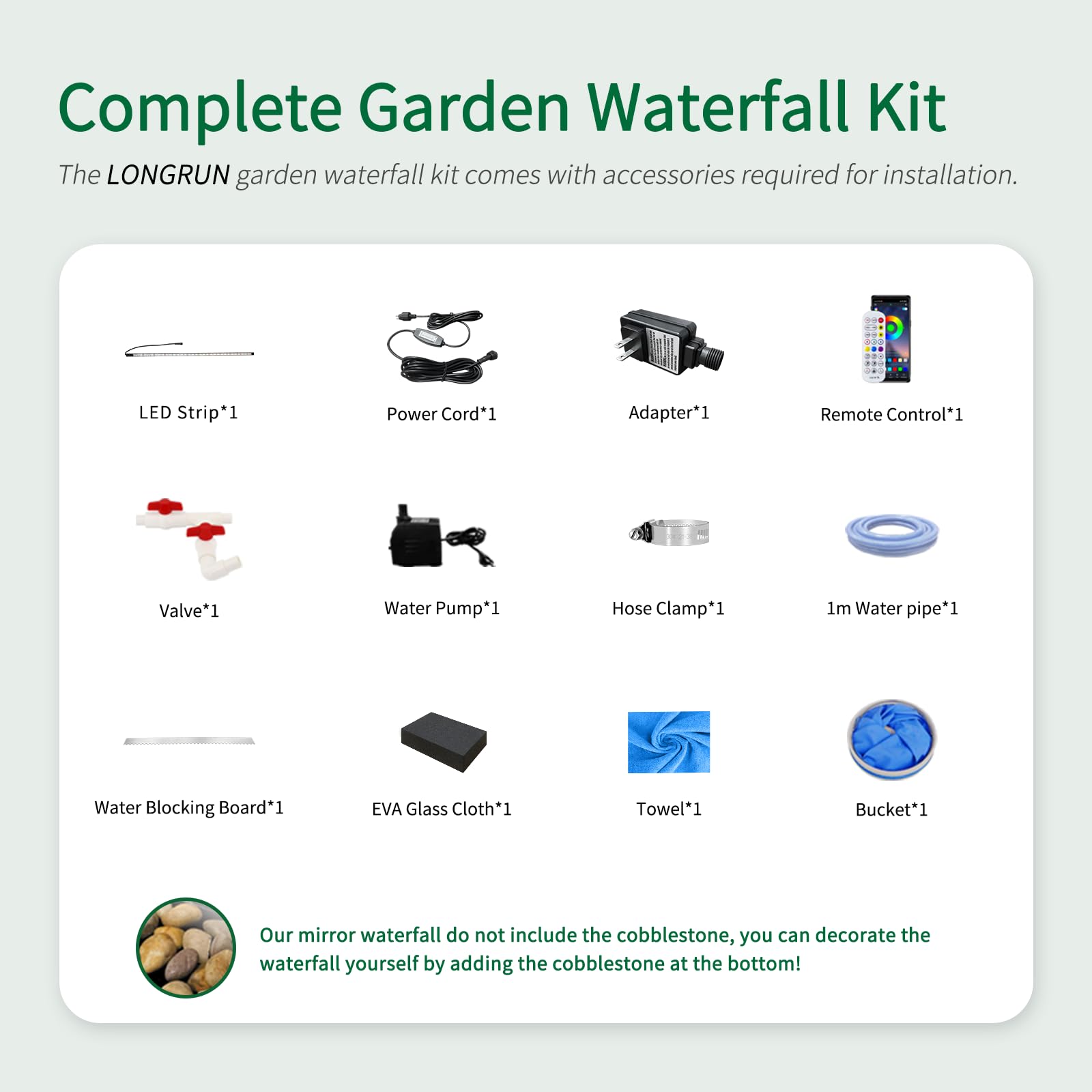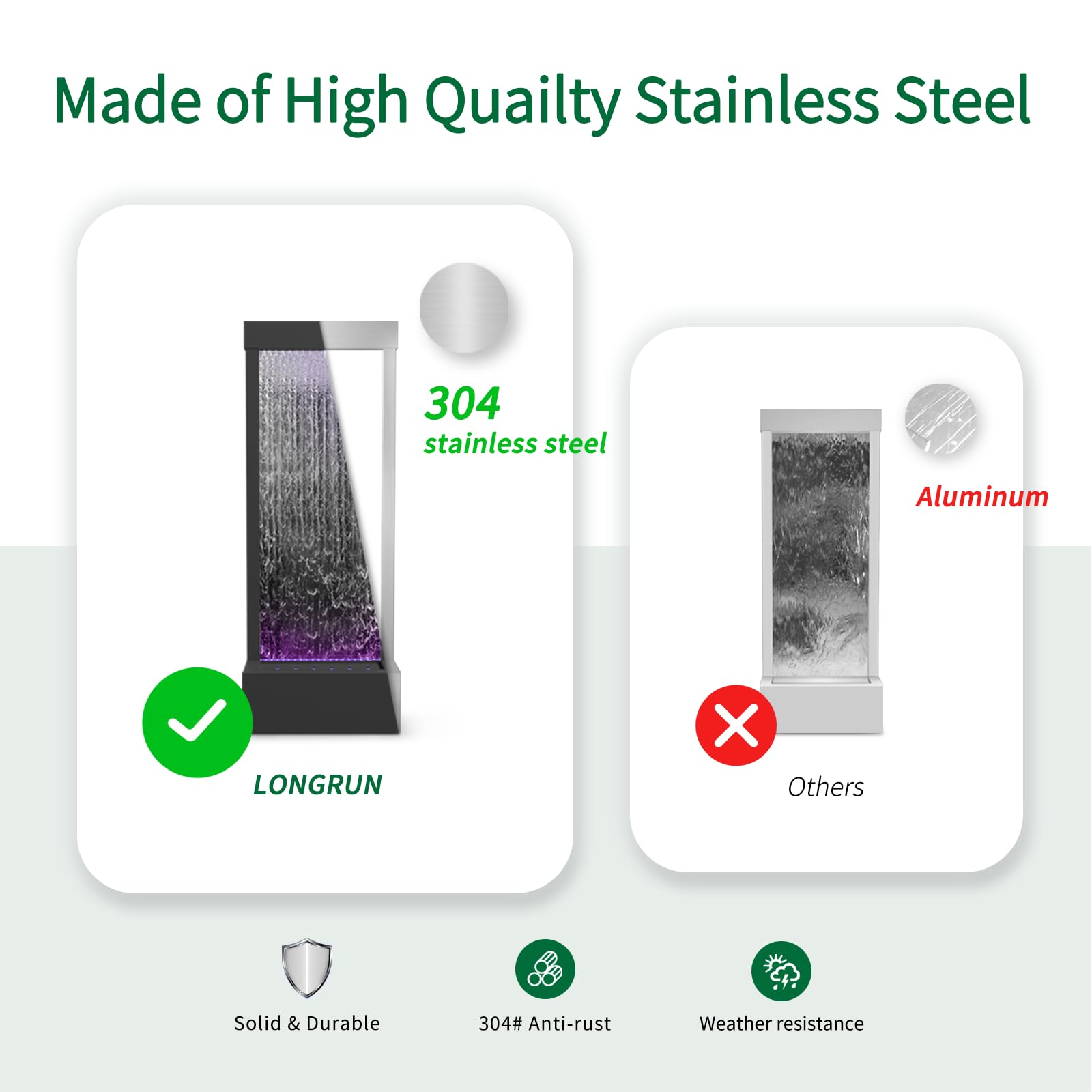 ["【EASY TO USE】With this large room waterfall fountain, not only will your bedroom be more refreshing, but it will also create a relaxed atmosphere with 7 light modes that can be easily selected with the push of a button. LONGRUN waterfall fountain can be used immediately after disassembly, no complicated assembly process, light and concise. We have already built various accessories into the waterfall.","【SINGLE PACKAGING】Our room fountain is a standalone complete package, one package corresponds to a complete waterfall kit, no cumbersome assembly. Other products are shipped separately, you have to wait for various packages to be put together. Our packaging has been carefully designed for the water curtain, the product is well protected during transport, it has handle openings on all sides of the box that are convenient for you to carry.","【STAINLESS STEEL WATERFALL】LONGRUN waterfall fountain is made up of a high-quality 304 stainless steel frame that is strong, durable, and corrosion-resistant. The tempered glass is inserted into the stainless steel frame, highlighting the beauty of the waterfall. The brown and black waterfall surface has been powder coated, which better protects the product from rust and oxidation, extending the lifespan.","【APP & REMOTE CONTROL LED】This indoor waterfall comes with an improved LED strip and a remote control, the strip is waterproof, removable, and has a long service life. The light has 21 lamp beads that are brighter than ordinary lights and are not easily heated up. The LED has multi-color light effects, you can control color, brightness, and light mode through the remote control or app.","【UNIFORM WATER FLOW EFFECT】The water flow on the mirrored surface is very uniform during operation. If the water is uneven, please remove the top cover, use the EVA pad to repeatedly wipe the stainless steel water outlet plate, the water flow will be uniform. Aside from the gentle sound of flowing water, admire the beautiful lights, slowly close your eyes, and feel the beauty of nature.","【DECORATIVE FOUNTAIN FOR HOME】LONGRUNDER waterfall fountain with mirror screen brings the beauty of nature into your home. And give your home an elegant, modern look. The splashing of water creates a relaxing atmosphere, dispelling the stress and fatigue of the day. Perfect for creating a relaxing and peaceful atmosphere in living rooms, spas, studios, yoga rooms, meditation rooms, hallways, and more."]
