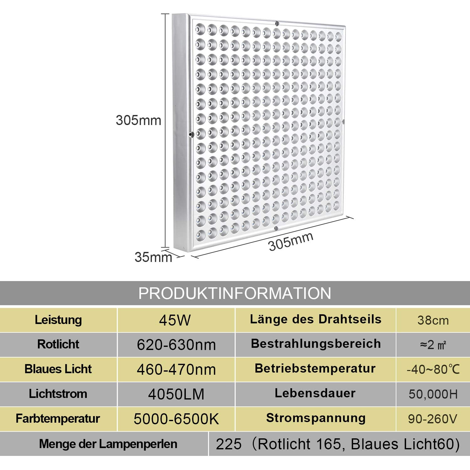 ["Full Spectrum: 165 red LEDs (630-660nm) and 60 blue LEDs (450-460nm) help plants grow quickly and provide a suitable spectrum for plant germination and growth. Red light is good for plant germination and flowering. Blue light can improve photosynthesis efficiency, which is beneficial for plant growth.","Energy-saving & Efficient: This plant lighting saves 50% to 90% in energy consumption compared to incandescent bulbs or fluorescent tubes. The lifespan is up to 50,000 hours.","Easy Installation: These LED plant growth lights are lightweight, and you can hang this light wherever you want. Good structure and high-quality materials make this indoor plant light the best choice for gardeners.","Specifications: Plant light size: 305 x 305 x 30 mm; Weight: 1.18 kg. Recommended irradiation distance: 40cm - 100cm. Irradiation range: around 2㎡. With power plug. Cable length approximately 120cm.","Wide Application Spectrum: This LED grow light is suitable for planting orchids, tomatoes, chili, potatoes, succulents, strawberries, lettuce, and more. Popular in hydroponics, indoor gardens, and potted plants. Suitable for all indoor growing environments, promotes rapid and healthy plant growth. If you have any questions, feel free to contact us anytime, we are happy to assist you!"]