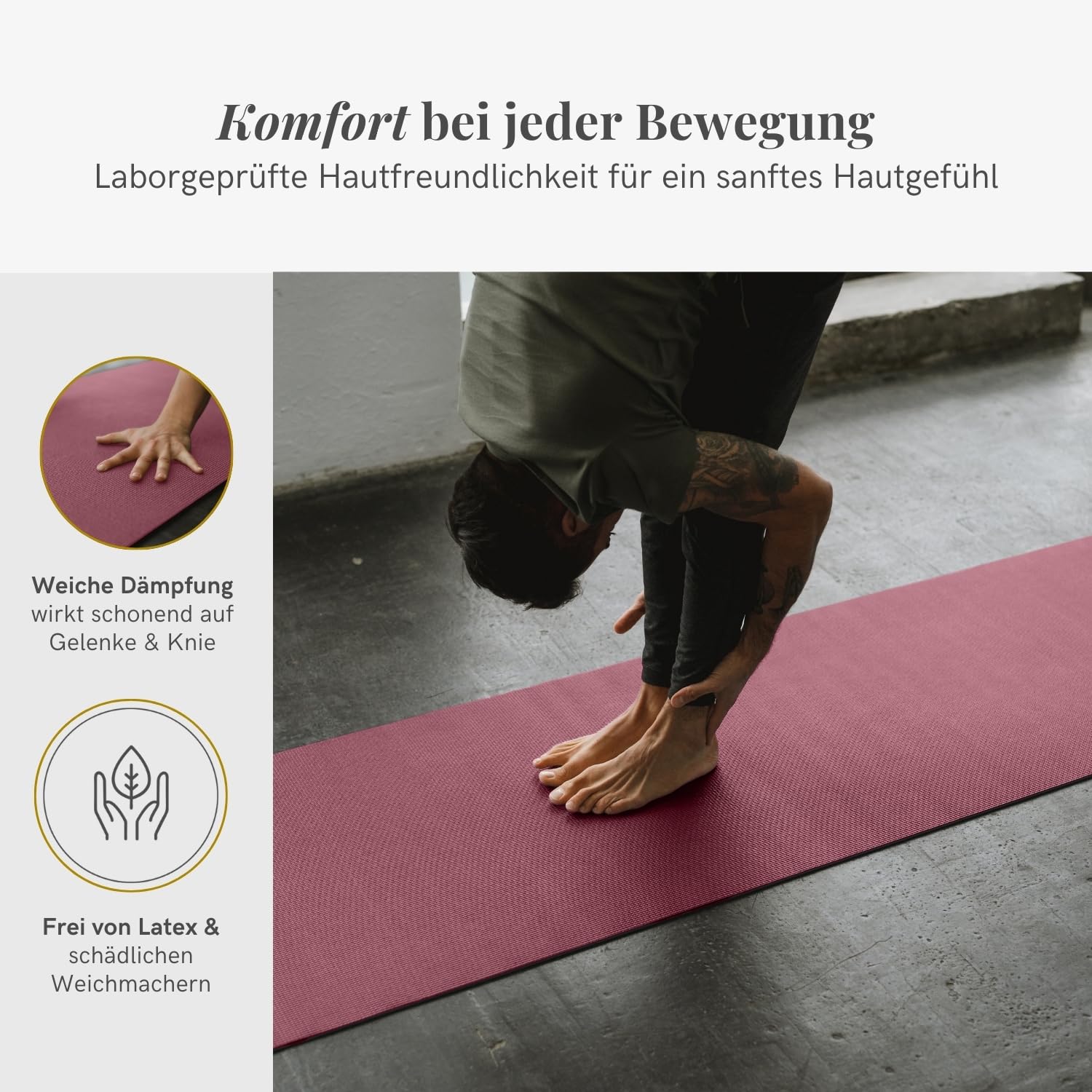 ["YOGA MAT MUDRA XL: The MUDRA XL Yoga Mats have the following product dimensions - 195 x 61 x 0.5 cm. The weight of the yoga mat is only 2.9 lbs. A good cushioning of 5 mm provides good support.","EXTRA LONG & VERSATILE: This high-quality fitness mat is suitable for beginners and advanced alike. It can be used universally. E.g. as a sports mat, gymnastics mat, yoga mat for kids, sports mat, gym mat, Pilates mat","OEKO-TEX 100 CERTIFIED: Our yoga mat is skin-friendly, tested for harmful substances, and free of latex and harmful plasticizers. Therefore, it is also an ideal yoga mat for kids or gymnastics mat for kids.","NON-SLIP TRAINING MAT: This non-slip sports mat has a special knob structure and offers extremely good grip. Compared to classic gymnastics mats, this non-slip training mat gives you a particularly secure feeling during your yoga practice.","SPORTS MAT FOR HOME OR STUDIO: Whether at home, in the studio, or outdoors. Our practical exercise mat supports your yoga practice anytime, anywhere. With only 2.9 lbs, the fitness mat is a real lightweight and ideal for on the go.","DEVELOPED BY YOGA TEACHERS: These non-slip yoga mats have been developed by professional yoga teachers with a focus on versatility. In addition to yoga, they can easily be used as mats for Pilates and fitness mats."]