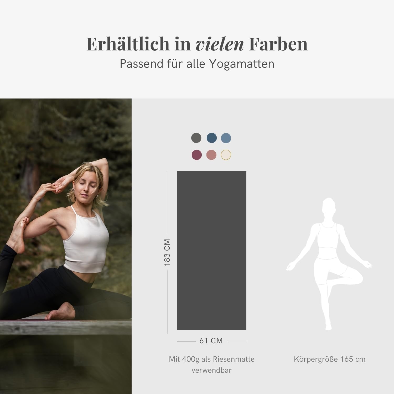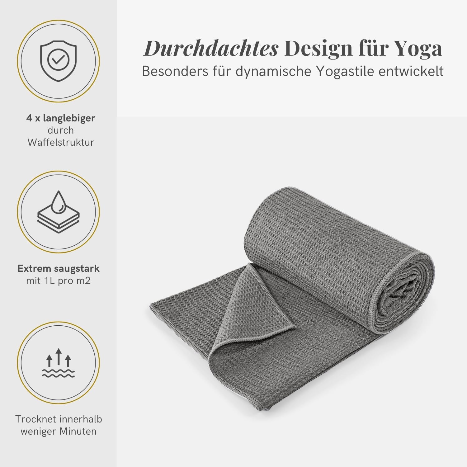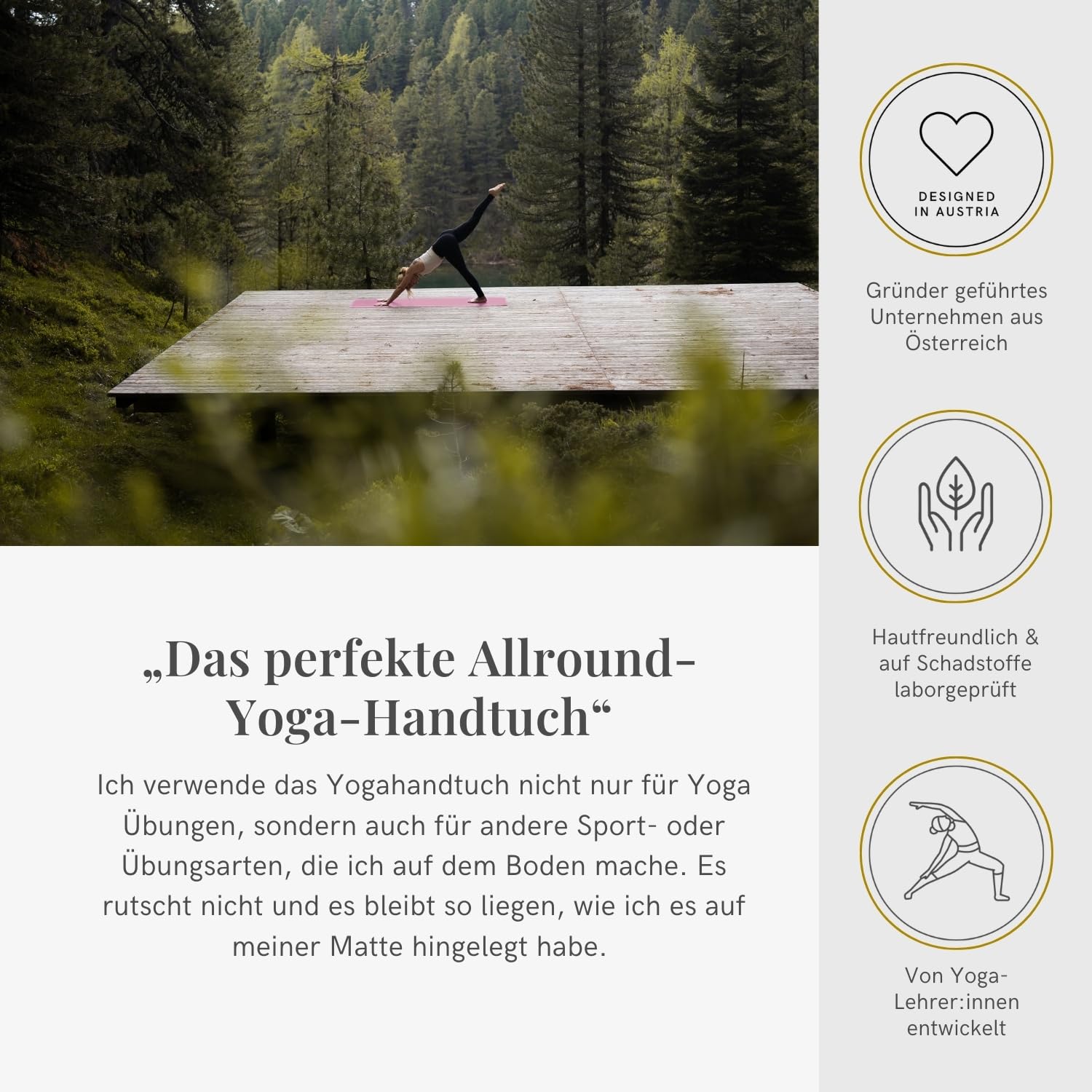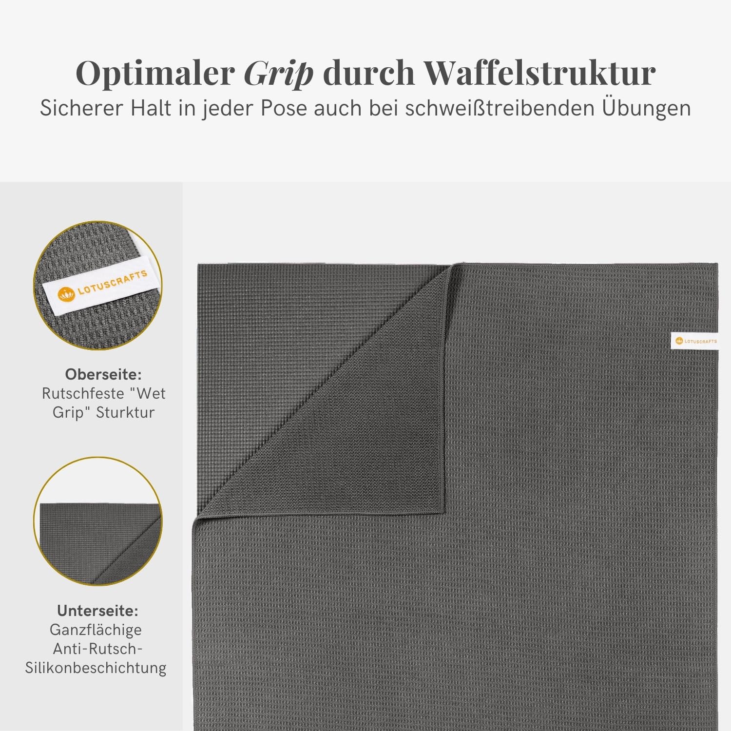 ["LOTUSCRAFTS YOGA TOWEL: Our innovative yoga towel measures 72 x 24 inches and is also ideal for use as a pilates towel, non-slip yoga towel, or non-slip fitness towel. Material: 80% polyester, 20% polyamide. Machine washable at 30°C.","YOGA TOWEL FOR MAT WITH WET GRIP SURFACE: Best grip thanks to special anti-slip surface structure on the top side of the towel. It is perfect as a mat towel for yoga. This way you have optimal grip even during sweat development.","INNOVATIVE NON-SLIP BOTTOM: Unlike a yoga towel with dots, our yoga towel has a full-surface anti-slip silicone coating on the bottom. This makes our non-slip yoga towel stick properly to the mat - for maximum grip.","SKIN-FRIENDLY AND ABSORBENT: Our non-slip yoga towel is made of very absorbent material with an antibacterial anti-microbial surface. It is also free of harmful AZO and heavy metals, making it particularly skin-friendly.","HIGH-QUALITY MICROFIBER YOGA TOWEL FOR MAT NON-SLIP: Perfectly crafted and color-coordinated with our Lotuscrafts yoga bags, meditation cushions, and yoga accessories."]