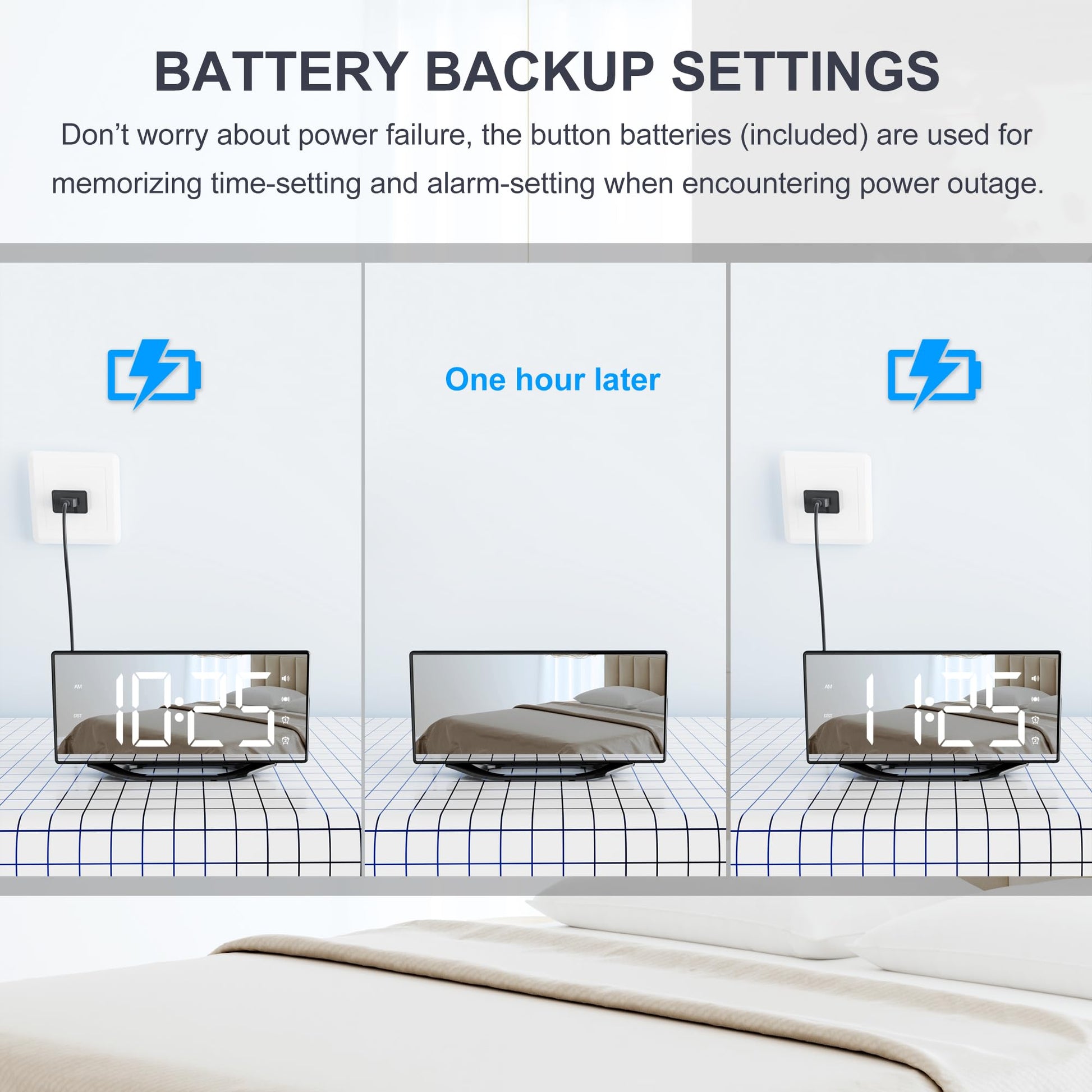 ["Mirror Alarm Clock】 This device can be used as an alarm clock or mirror. With this digital mirror clock, you can easily read the time. It features simple and intuitive control buttons and instructions for easy operation. The smooth mirror can also be used as a female makeup mirror, and it can also be used as a bedroom or living room decoration or accessory.","【Dual Alarm and Snooze Button】 With this electronic mirror alarm, you can set two independent alarm times. You and your family can wake up at different times. The snooze button can be easily pressed in a half-asleep and half-awake state, allowing you to enjoy 9 more minutes of sleep. You can also press the "Alarm OFF" button to turn off the loud alarm.","【Three-in-One Alarm Clock】 Our mirror table clock has 3 alarm methods: loud alarm sound, strong vibration, or both, you just need to switch the BUZZ, BUZZ/VIB, VIB switch on the back to select the waking model you want. The strong vibration can easily wake up sleep and hearing impaired individuals without disturbing their partners. It is the ideal alarm clock for all deep sleepers, teenagers, elderly, or deaf individuals.","【8.7-Inch Display and Dimming Function】 The numbers on the 8.7-inch LED display of the vibration alarm clock are super clear and easy to read, especially suitable for children and elderly people. With the dimmer button, you can adjust the desired brightness of the digital clock anytime and anywhere. At night, you can even turn off the LED lights completely and enjoy the quiet and dark sleep environment of this tick-free alarm clock.","【USB Connection and 12/24H】 Digital mirror clock with USB charging port (5V/1A), which can be used to charge mobile phones or tablets. Built-in button battery can store the alarm setting and time when the device is turned off. The alarm clock supports the 12H/24H time format, which can be easily set according to your habits.","【Package】 Size: 20 * 4.4 * 10.2 cm, Package includes 1 * Alarm clock with bed shaker, 1 * USB power cable, 1 * Power adapter, 1 * User manual."]