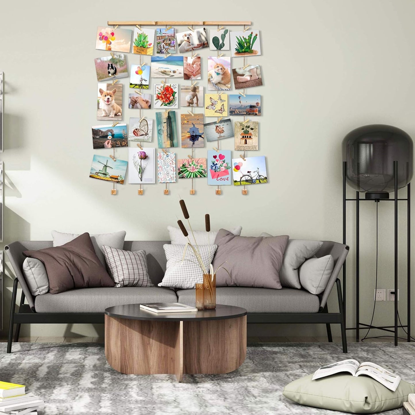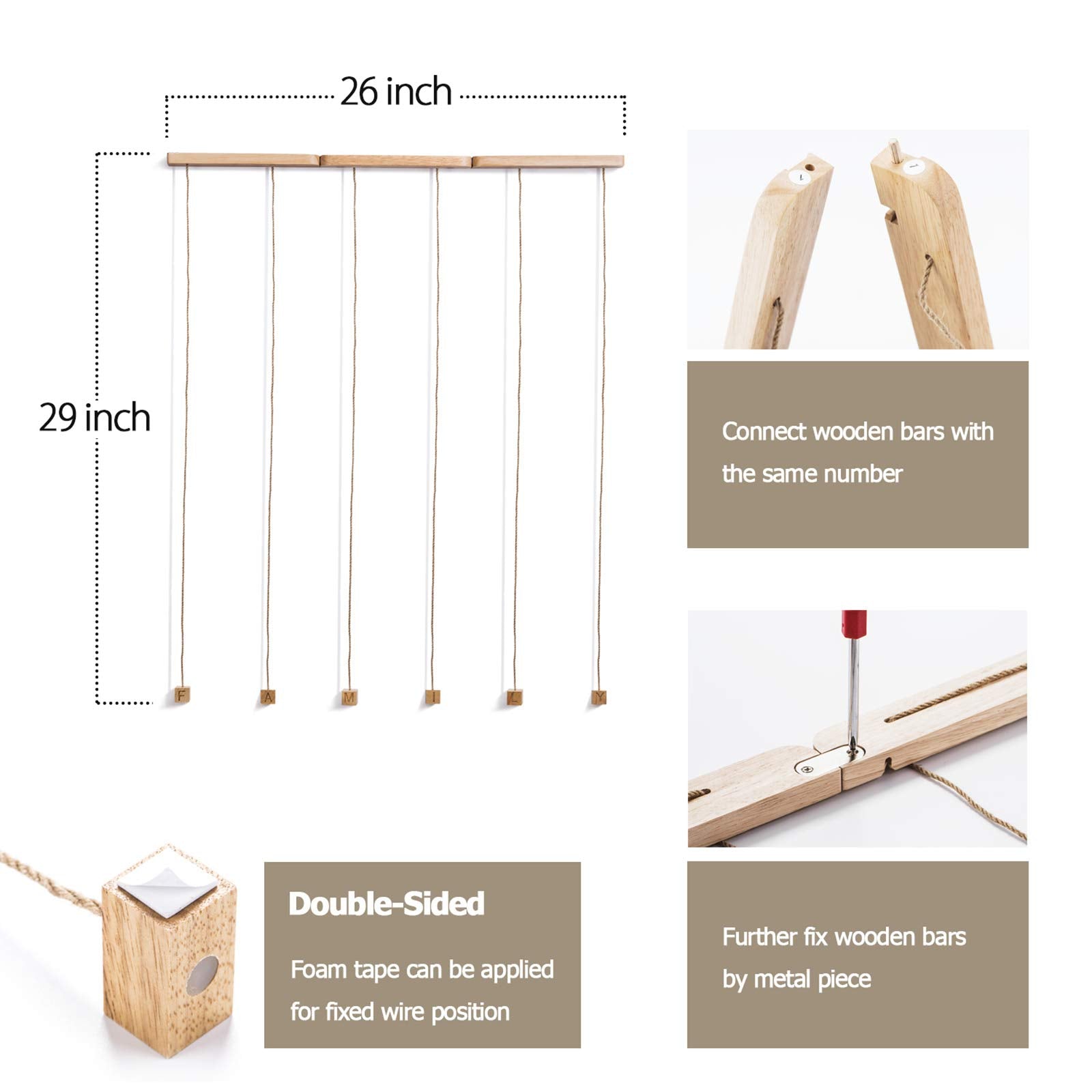 "Easy Assembly: Simply connect the wooden rods and secure them to the wall with the included accessories. The picture frame consists of 3 wooden bars, 3 clotheslines, and 30 wooden clips"]